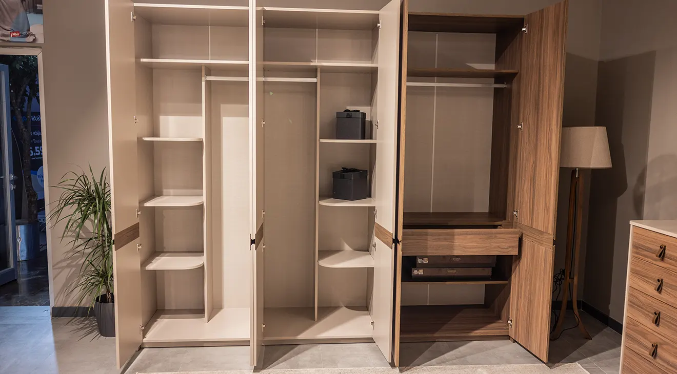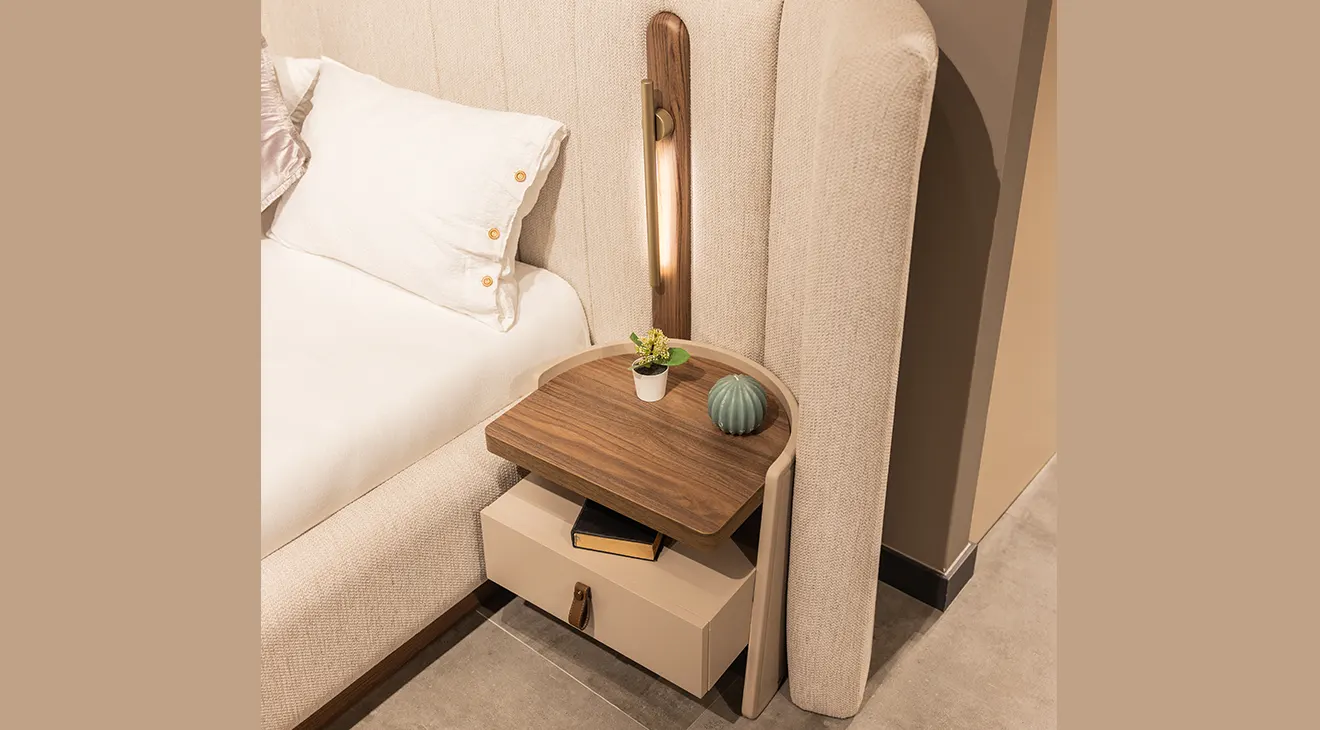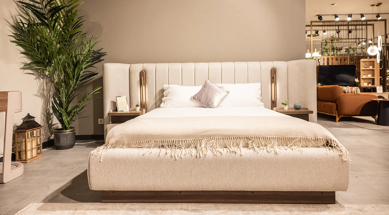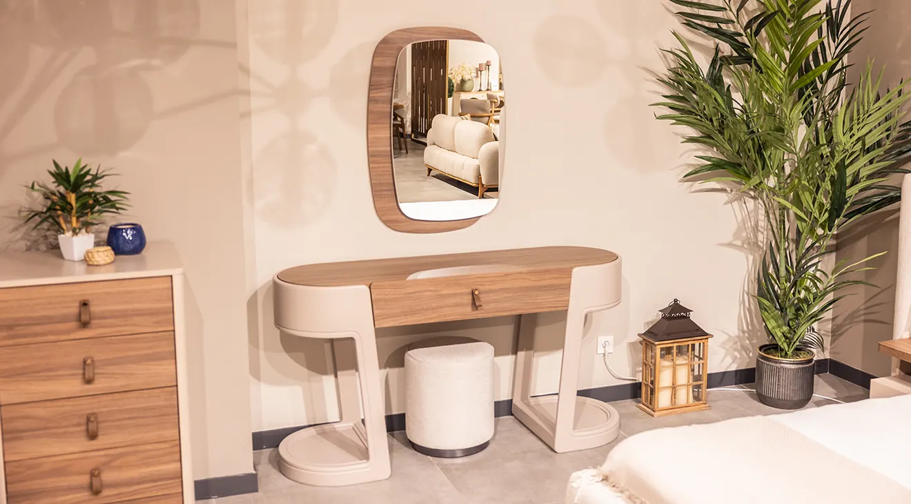 Pablo 6 Kapaklı Modern Yatak Odası Takımı, sıcak bej döşeme ile doğal ceviz dokusunu bir araya getirerek sıcak ve davetkâr bir atmosfer yaratır. Yumuşak pofidik başlık üzerindeki entegre okuma lambaları, gardırobun soft‑close kapakları ve ahşap çekmeceli komodin–şifonyer kombinasyonu, estetiği fonksiyonellikle buluşturur. Oval hatlı makyaj masası ve zarif tabureyle yatak odanızı hem şık hem de huzurlu bir dinlenme alanına dönüştürün.