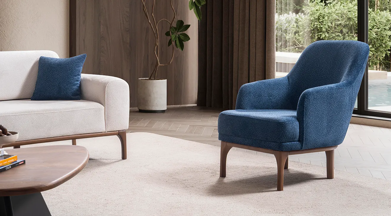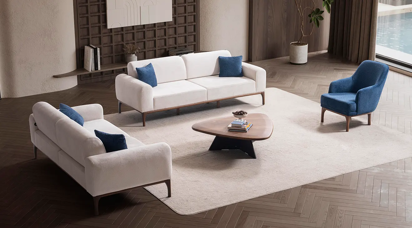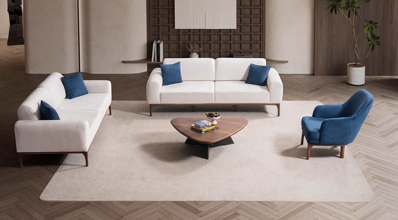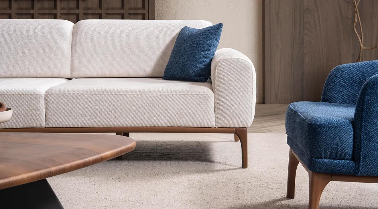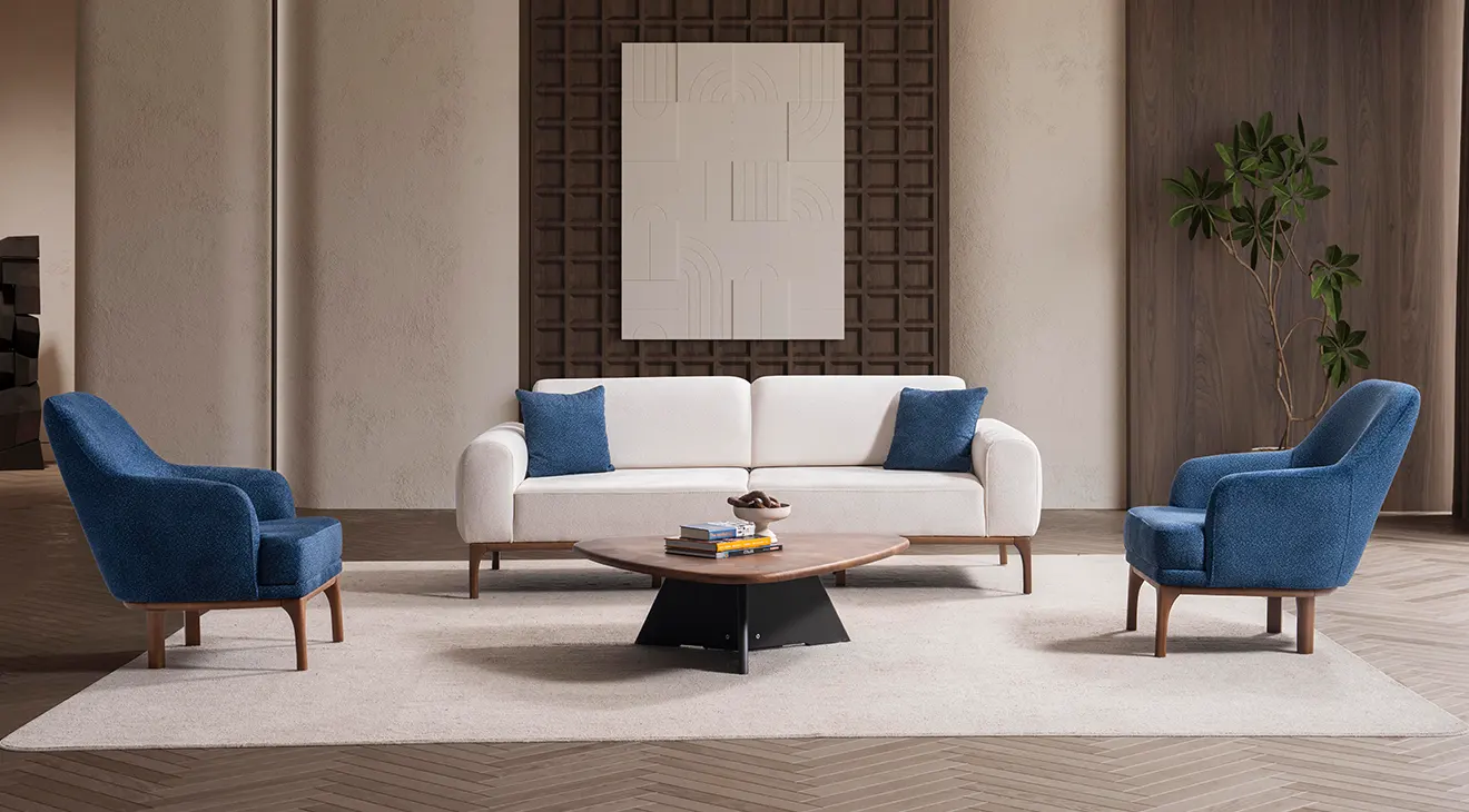 Peru Ahşap Ayaklı Koltuk Takımı; sade hatları, doğal ahşap ayakları ve mavi berjeriyle salona ferahlık katar. Yumuşak kumaş, geniş oturum ve destekli yastıklar günlük konfor sağlar. Modern, ahşap ayaklı, 3+3+1 koltuk takımı arayanlar için şık ve zamansız bir seçim.