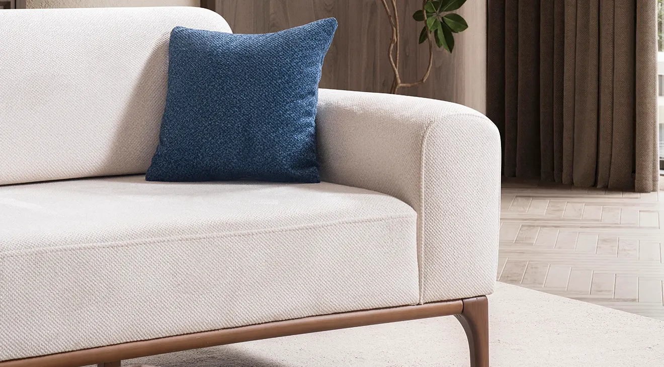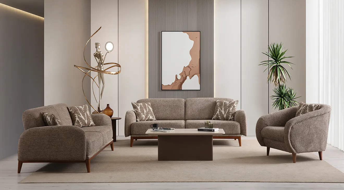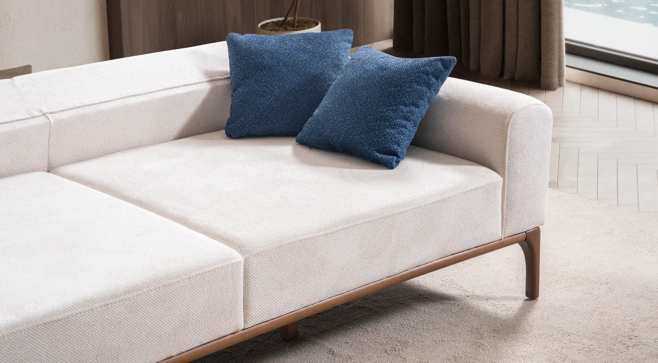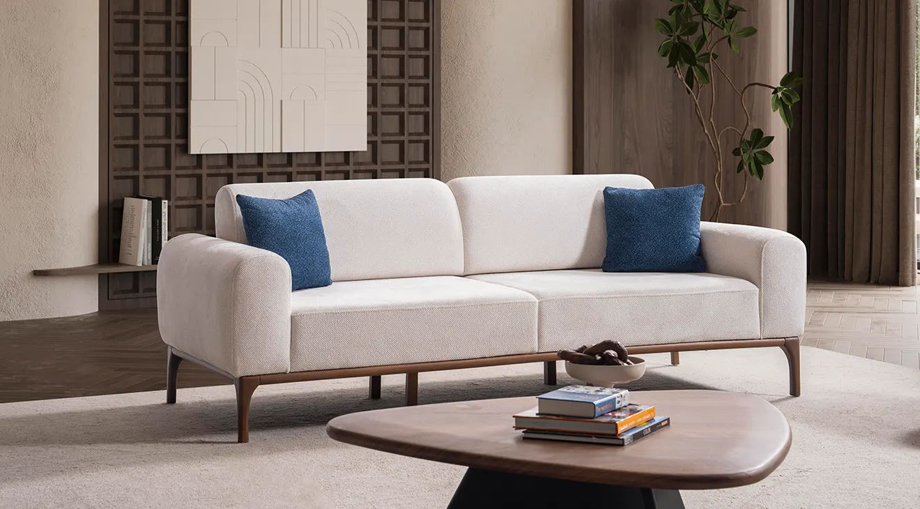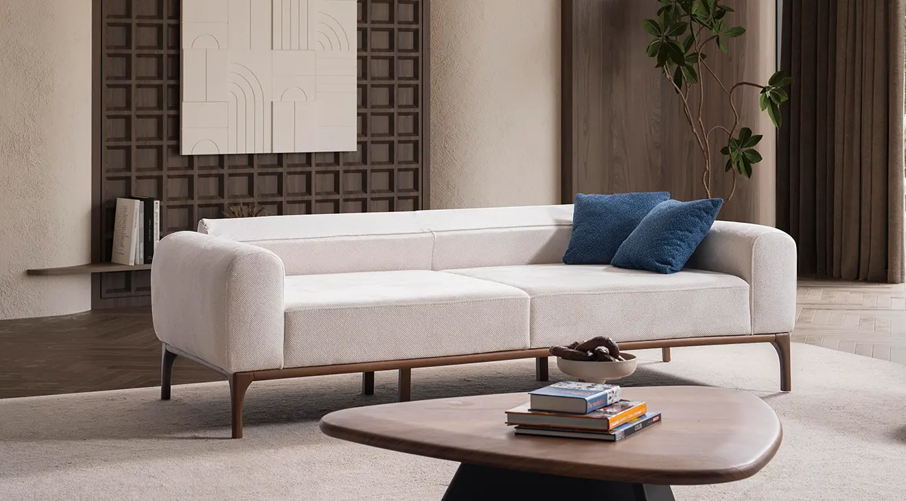 Peru Ahşap Ayaklı Koltuk Takımı; sade hatları, doğal ahşap ayakları ve mavi berjeriyle salona ferahlık katar. Yumuşak kumaş, geniş oturum ve destekli yastıklar günlük konfor sağlar. Modern, ahşap ayaklı, 3+3+1 koltuk takımı arayanlar için şık ve zamansız bir seçim.