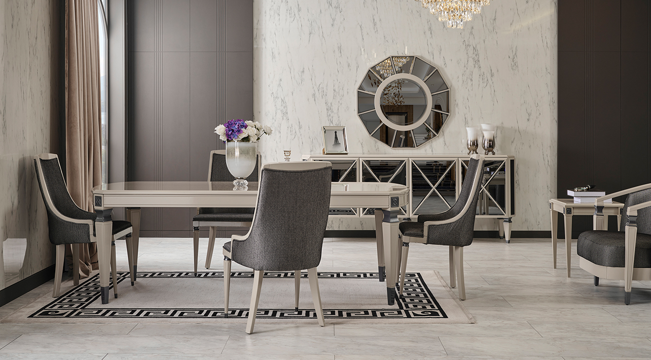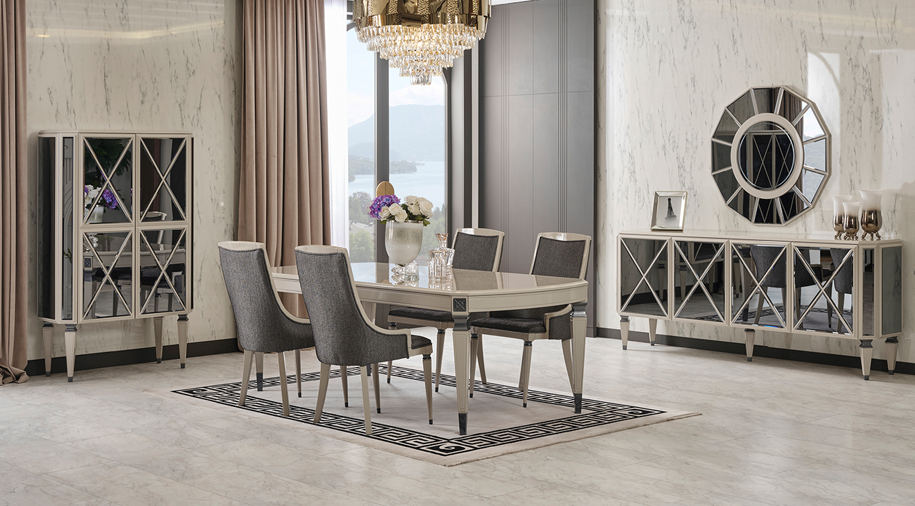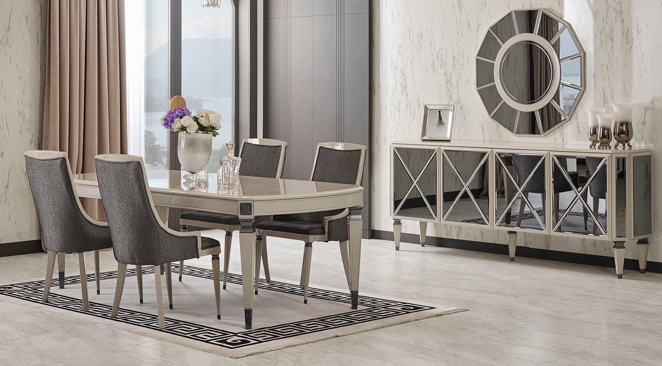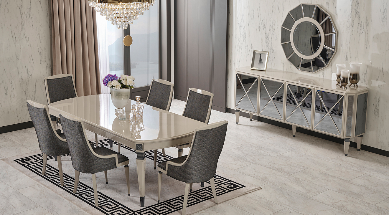 İnegöl mobilyasının özel üretimi olan Picasso Krem Yemek Odası Takımı, MDF malzeme, krem renk ve modern tasarımıyla Mobilyamevime'de!