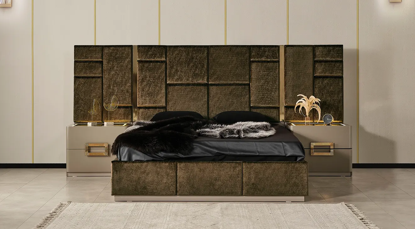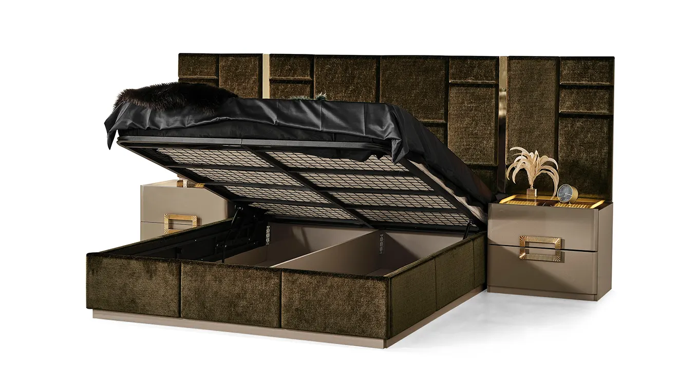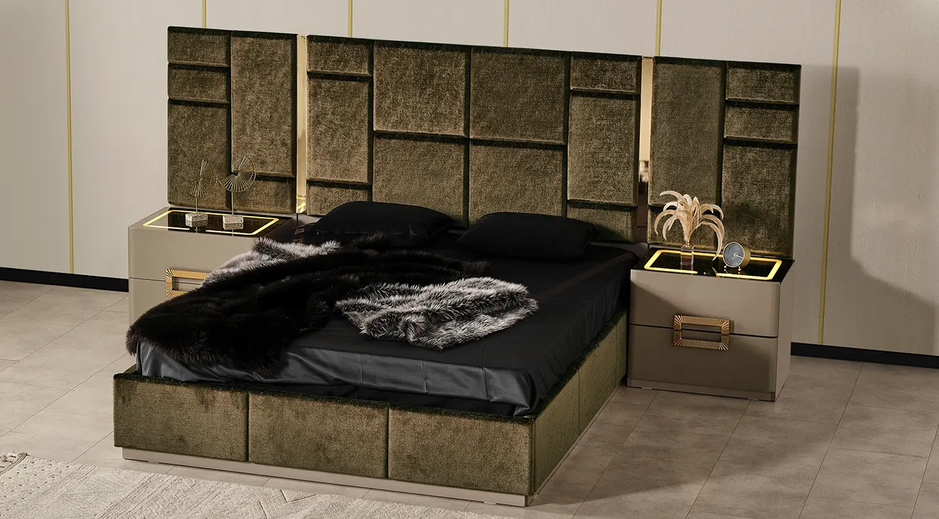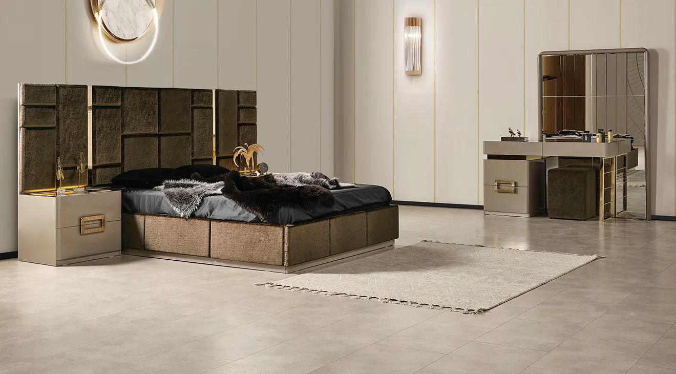 Pier 6 Kapaklı Modern Yatak Odası Takımı; 6 kapaklı gardırop, bazalı (lift-up) yatak, LED aydınlatmalı başlık, aynalı makyaj masası ve komodinlerden oluşur. Yüksek parlak bej yüzey ve altın detaylar modern lüks sunar. Geniş depolama isteyenler ve “6 kapaklı yatak odası” arayanlar için ideal.