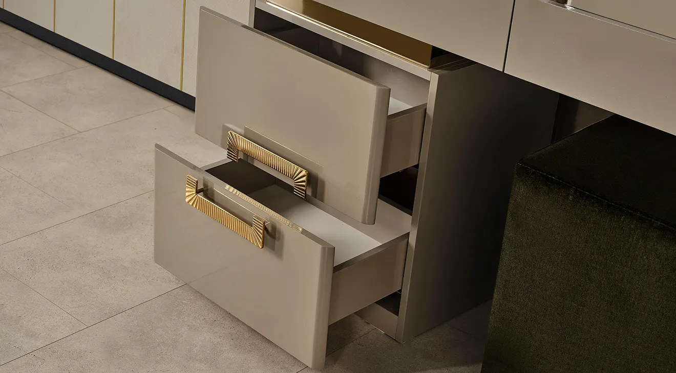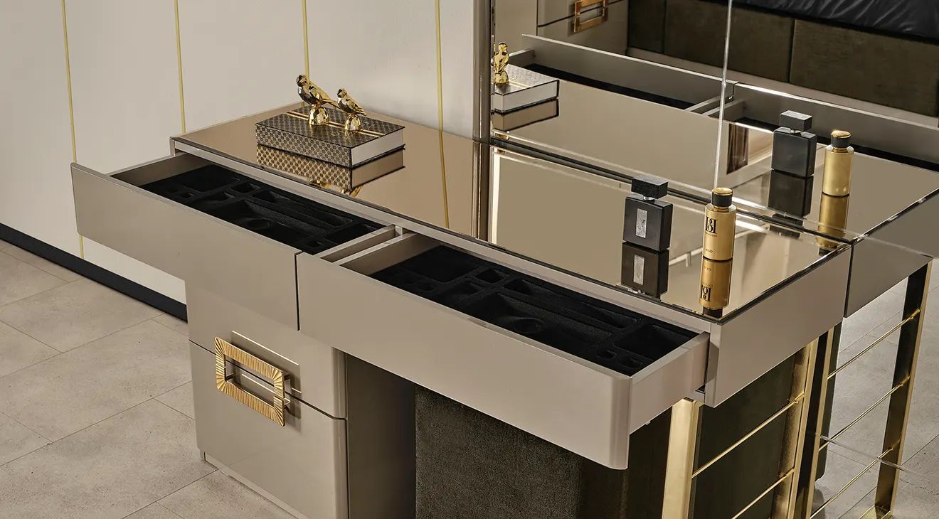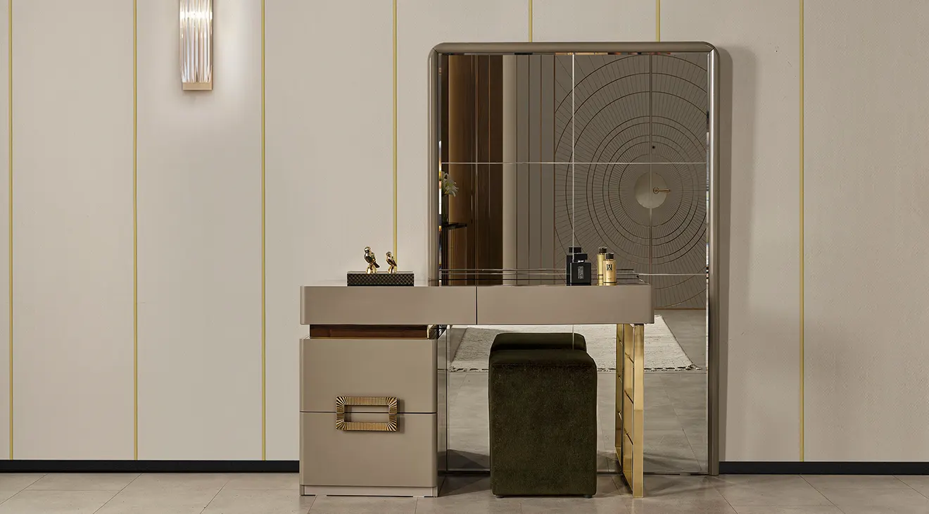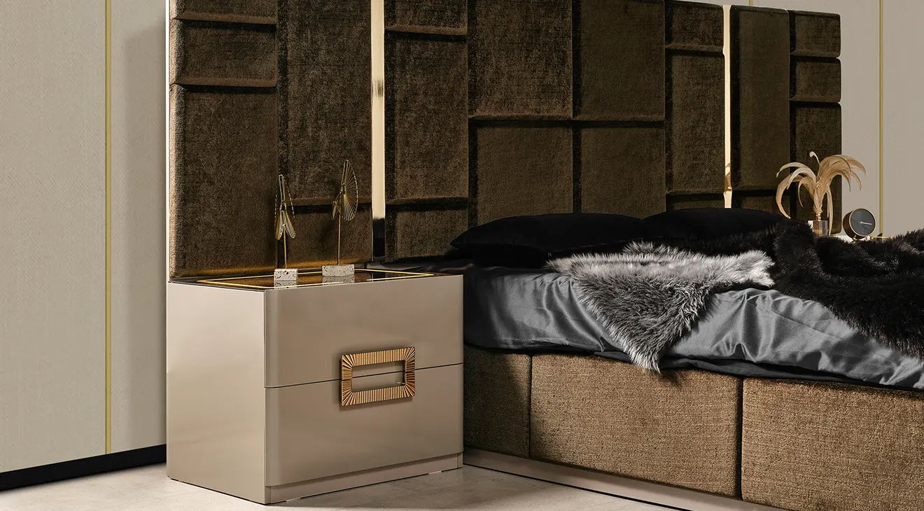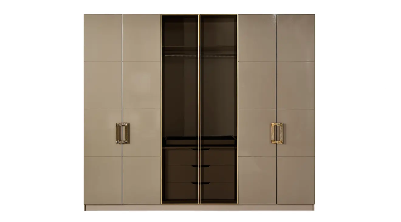 Pier 6 Kapaklı Modern Yatak Odası Takımı; 6 kapaklı gardırop, bazalı (lift-up) yatak, LED aydınlatmalı başlık, aynalı makyaj masası ve komodinlerden oluşur. Yüksek parlak bej yüzey ve altın detaylar modern lüks sunar. Geniş depolama isteyenler ve “6 kapaklı yatak odası” arayanlar için ideal.