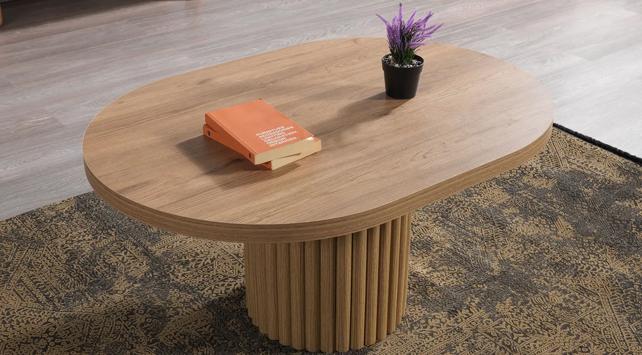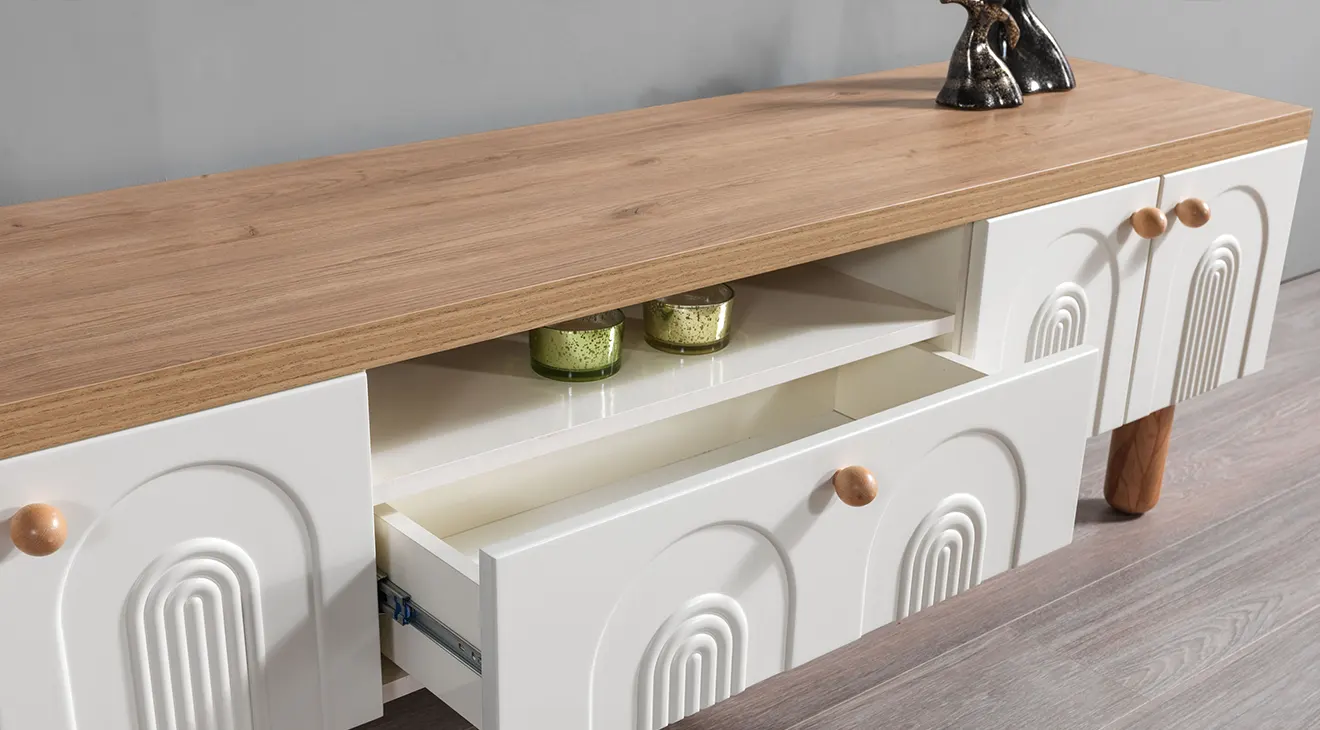 Prag Bohem TV Ünitesi; ahşap üst tablası, kabartma kapakları ve geniş çekmeceleriyle kablo/aksesuarları toparlar, salona sıcaklık katar.
