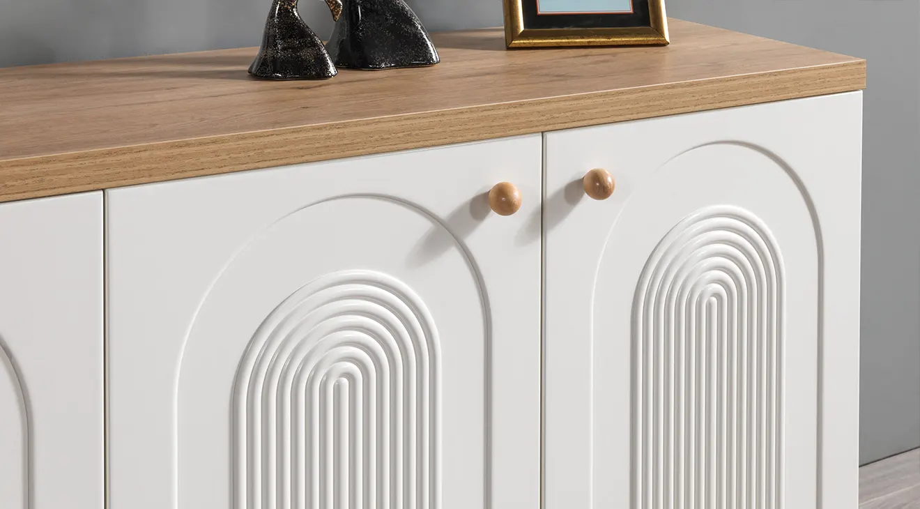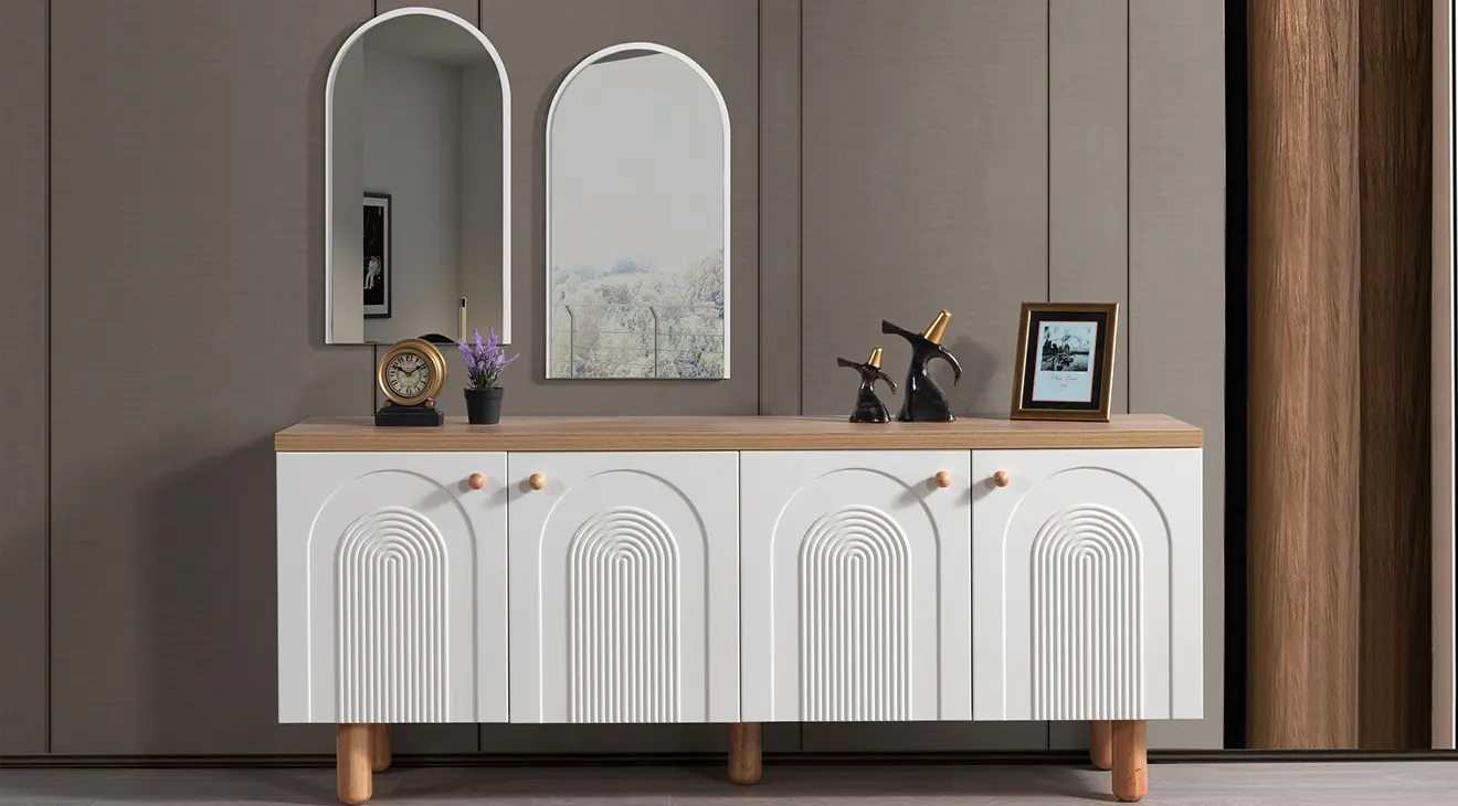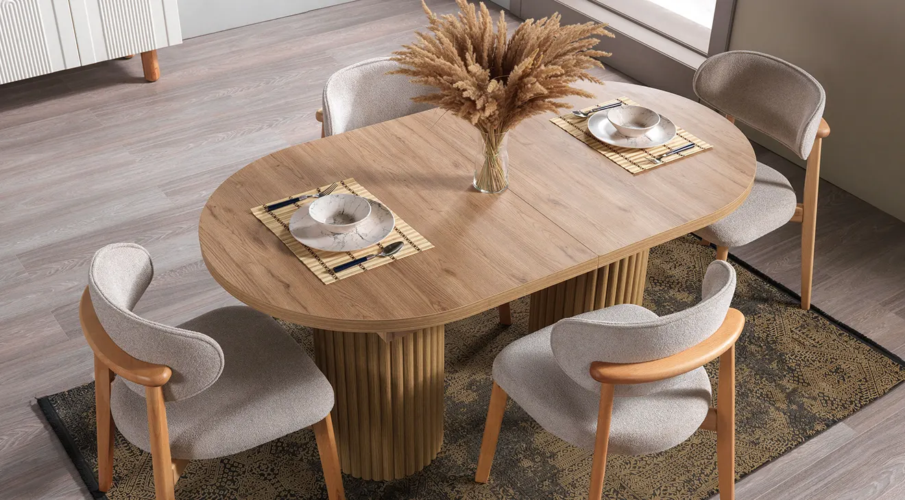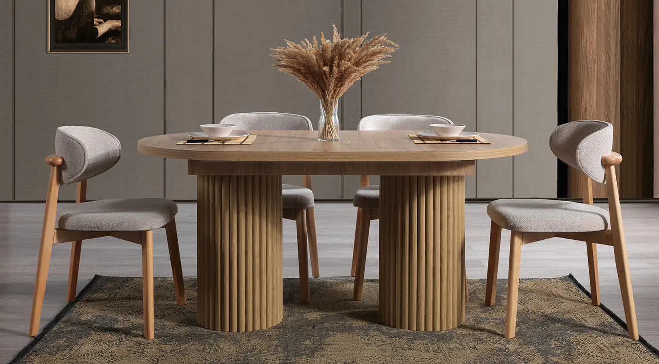 Prag Bohem Yemek Odası Takımı; sıcak ahşap dokusu, kırık beyaz gövdesi ve kapaklardaki kemer kabartma detaylarıyla bohem tarzı modern bir çizgide tamamlar. Oval formdaki masa, gerektiğinde uzatılabilen yapısıyla kalabalık misafirlerde konforlu kullanım sunar; sağlam ayak yapısı günlük kullanıma uygundur. Döşemeli sandalyeler uzun oturumlarda rahatlık sağlarken, geniş depolama alanına sahip konsol servis takımlarını ve düzeni pratikçe toparlar; duvar aynasıyla mekâna ferahlık katar.