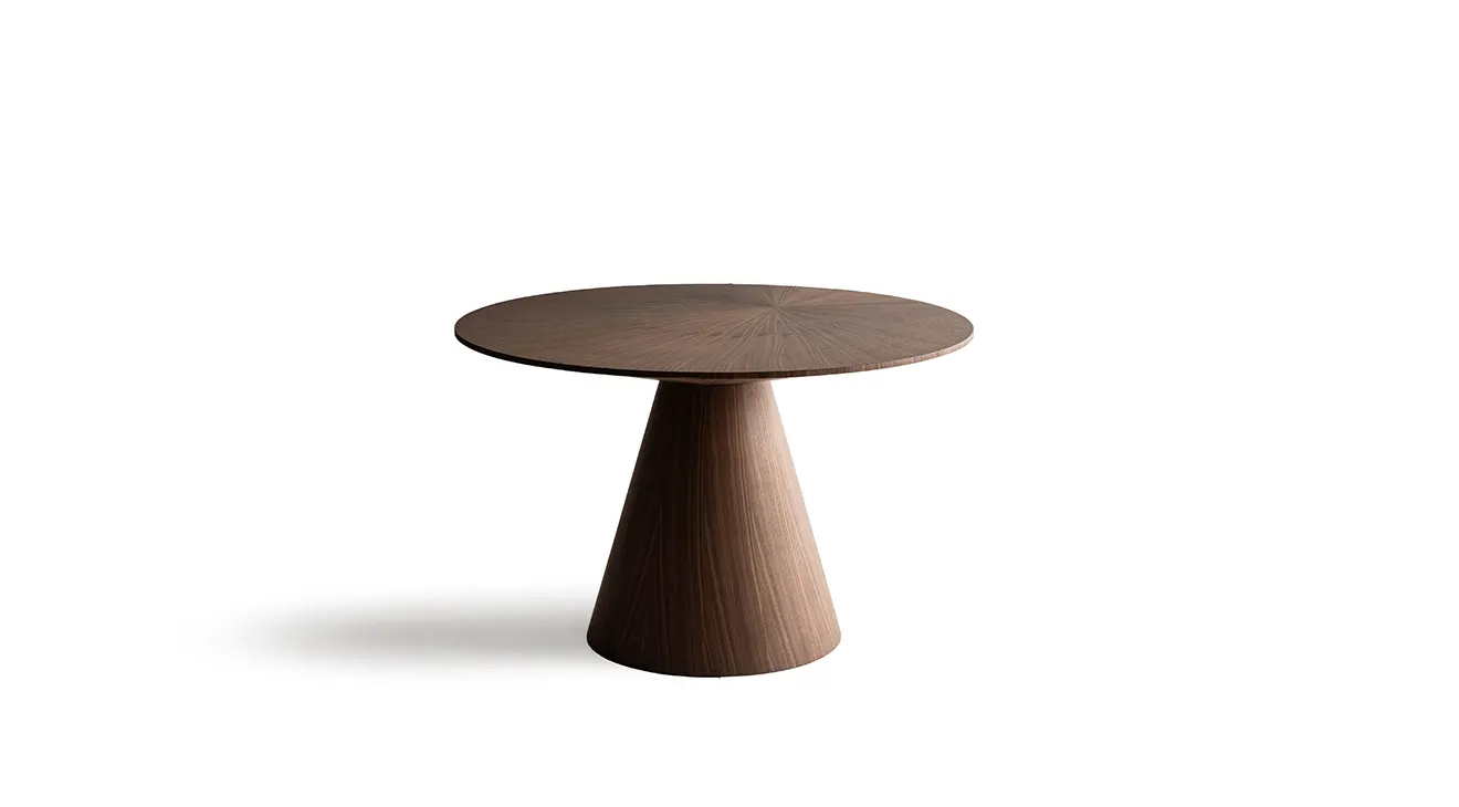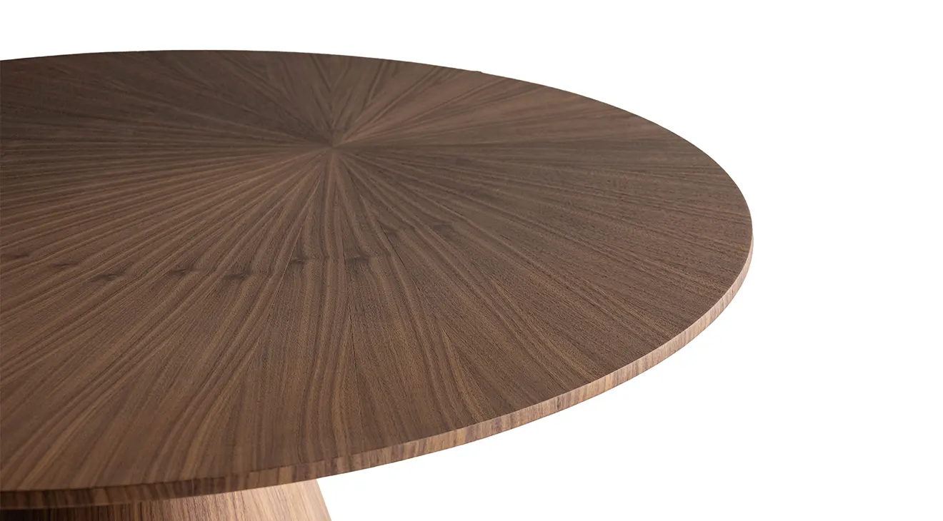 Prag Yuvarlak Ceviz Masa, yıldız desenli ceviz tablası ve konik ayağıyla modern şıklık sunar; 4-6 kişilik kullanım için idealdir.