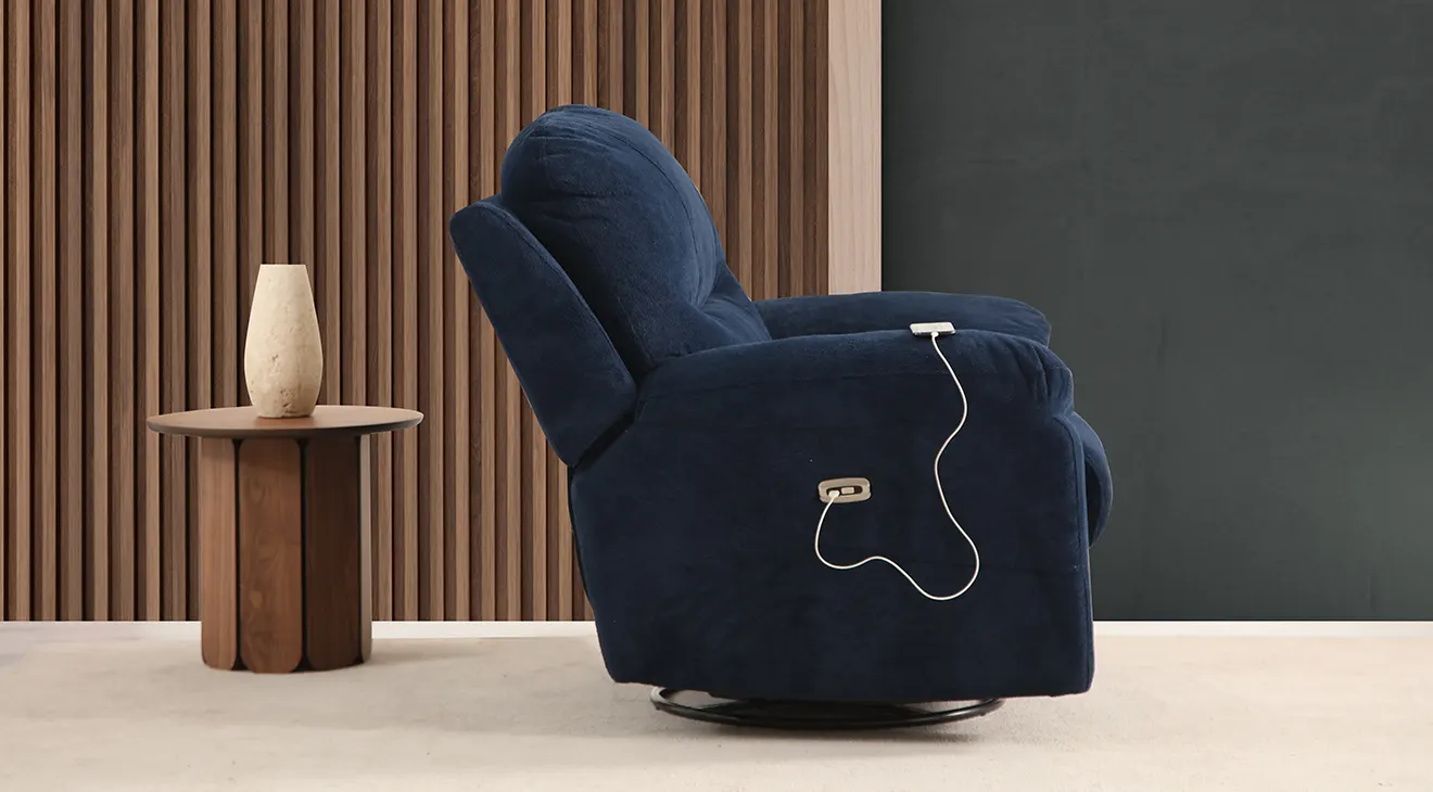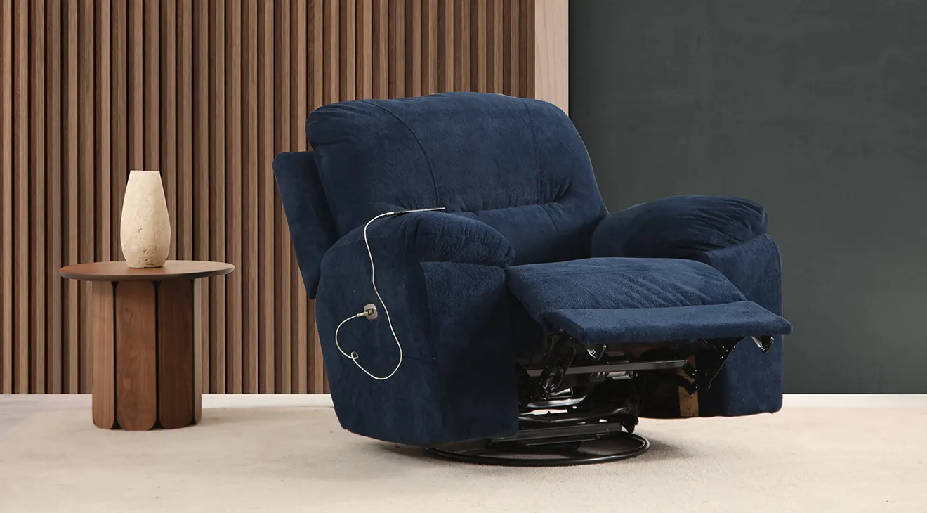 Ravella motorlu lacivert berjer; derin lacivert dokusu, sallanır tabanı ve tek tuşla recliner mekanizmasıyla şık bir dinlenme köşesi oluşturur.