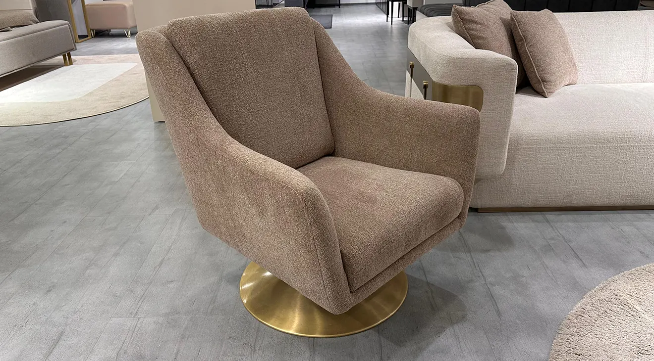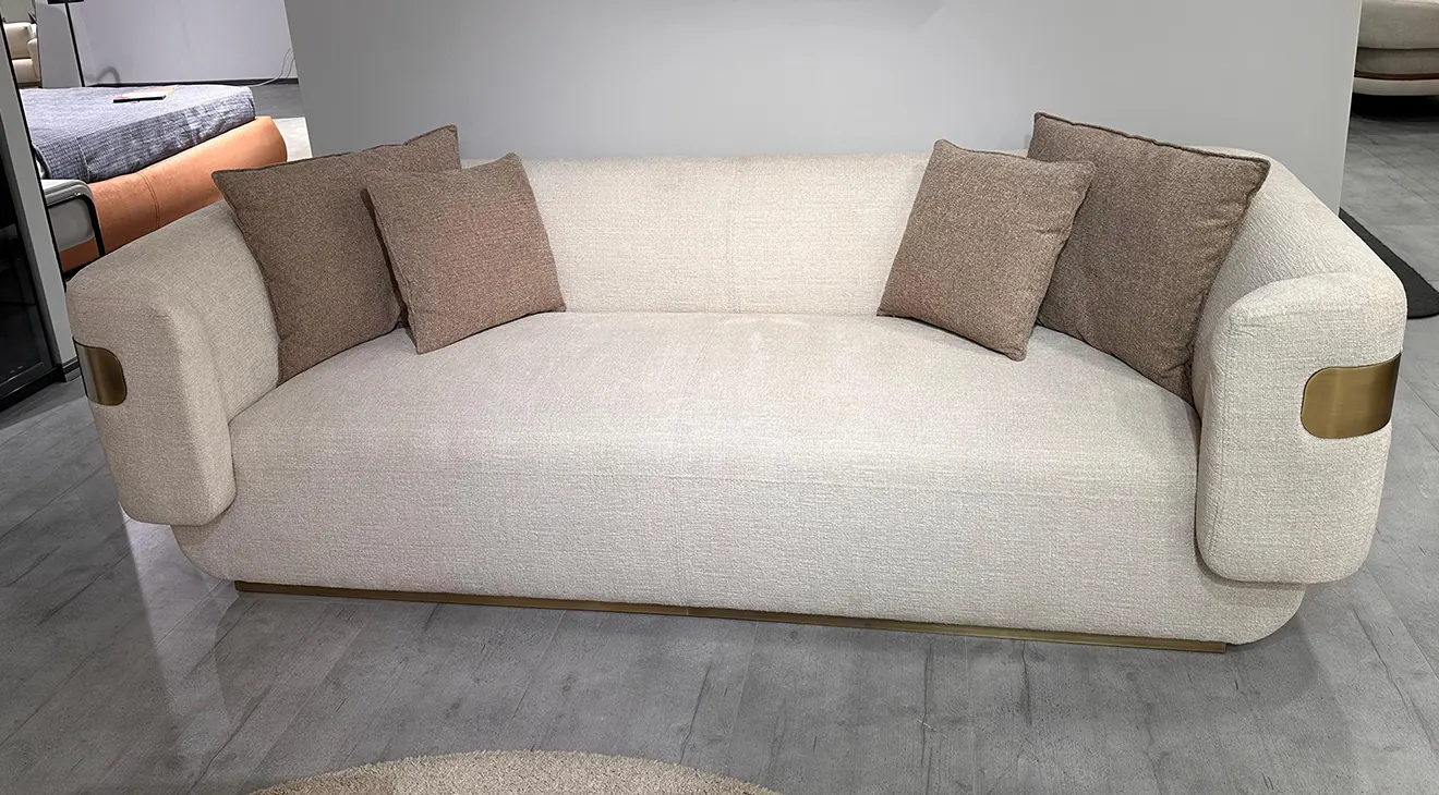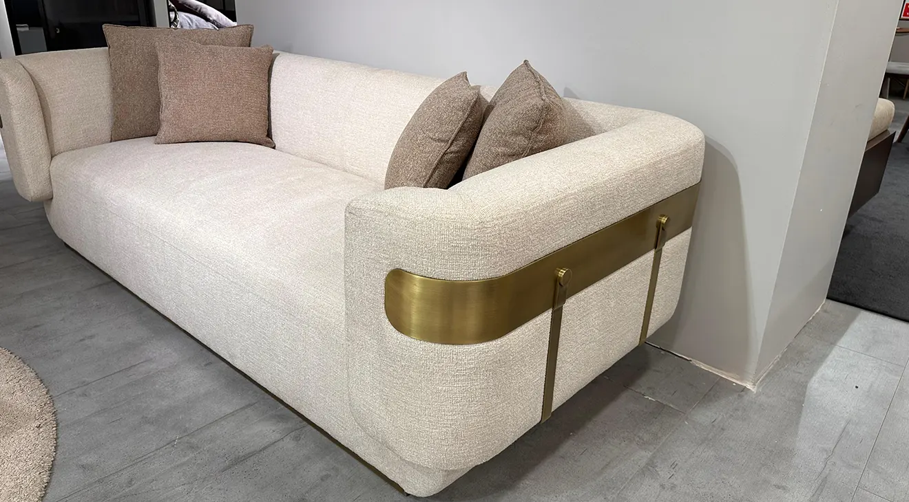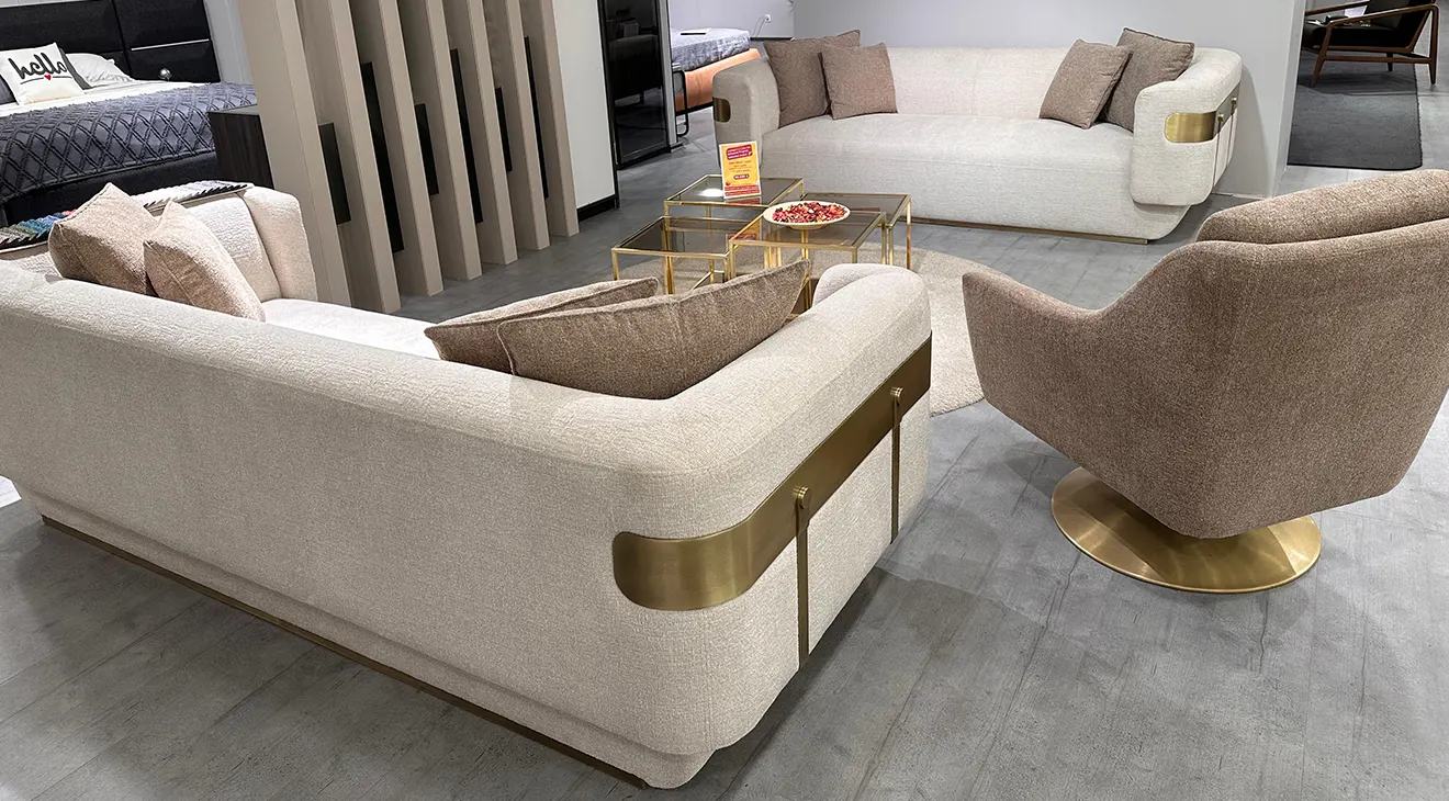 Reina Outlet Koltuk Takımı, zarif detayları ve modern tasarımıyla yaşam alanlarınıza sofistike bir dokunuş katıyor. Bej ve kahve tonlarının hâkim olduğu bu özel tasarım, altın detaylarla tamamlanarak lüks bir hava yaratıyor. Geniş oturum alanı ve konforlu sünger yapısıyla rahatlığı ön planda tutan koltuk takımı, metal