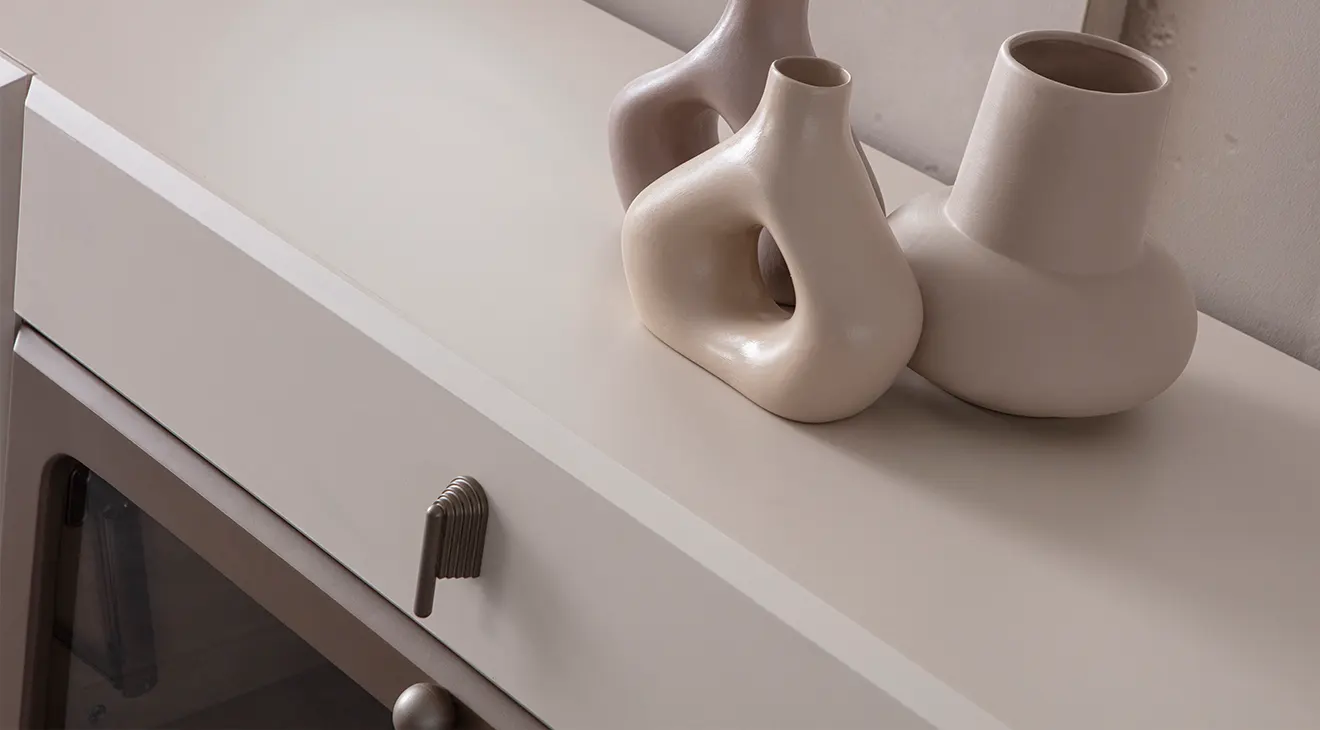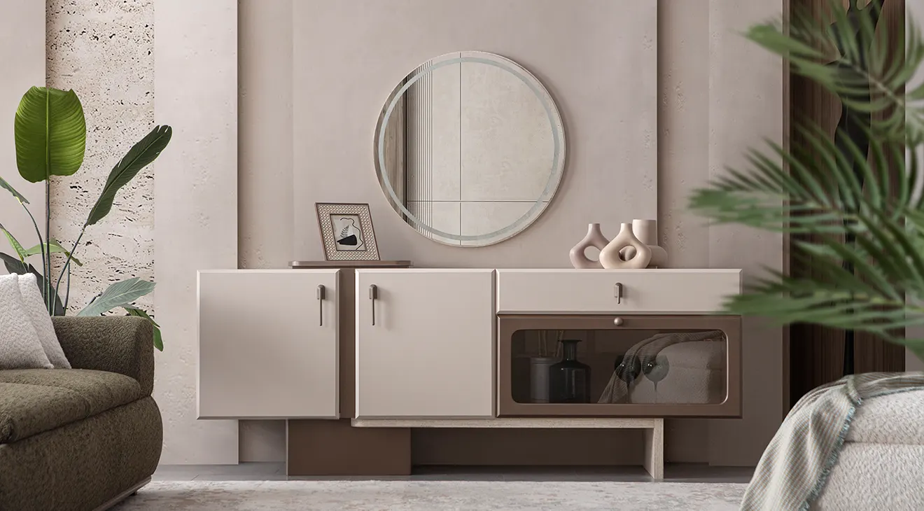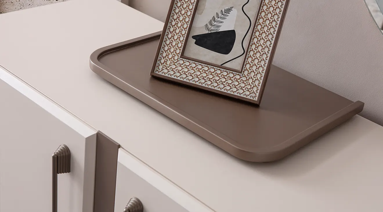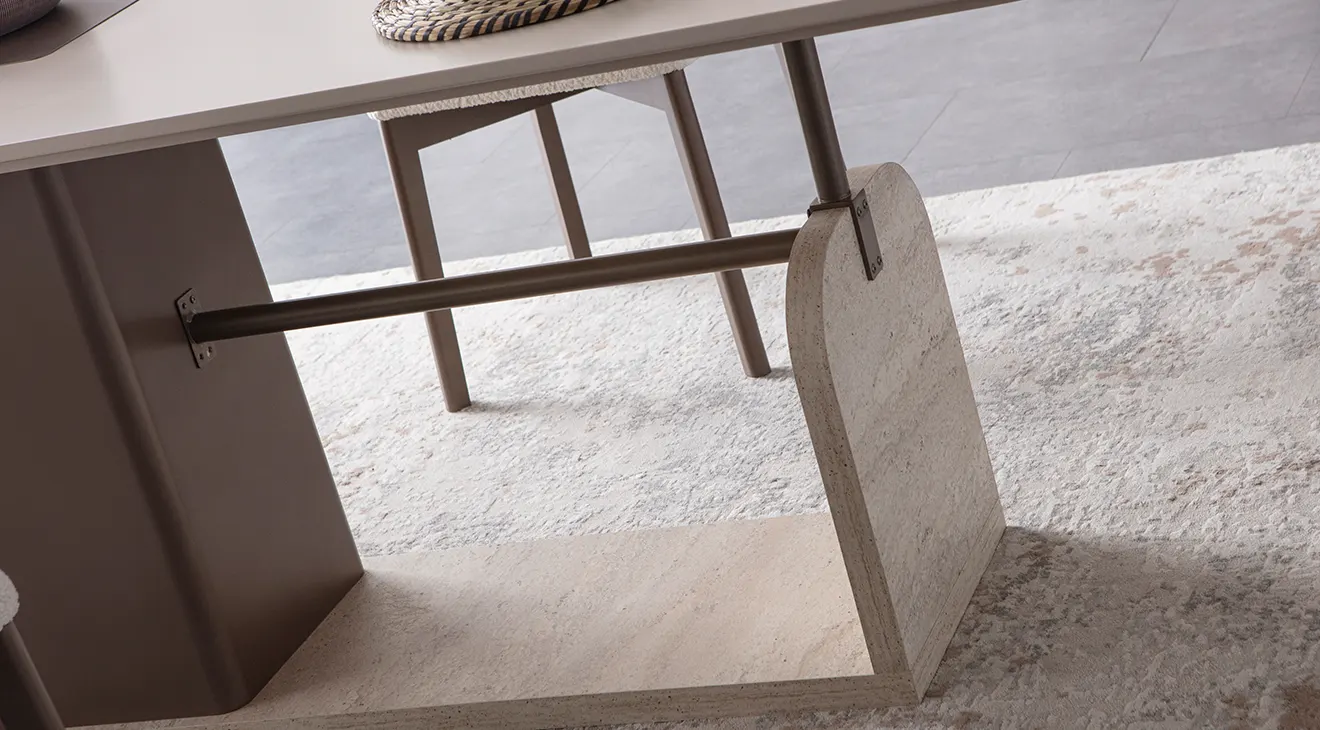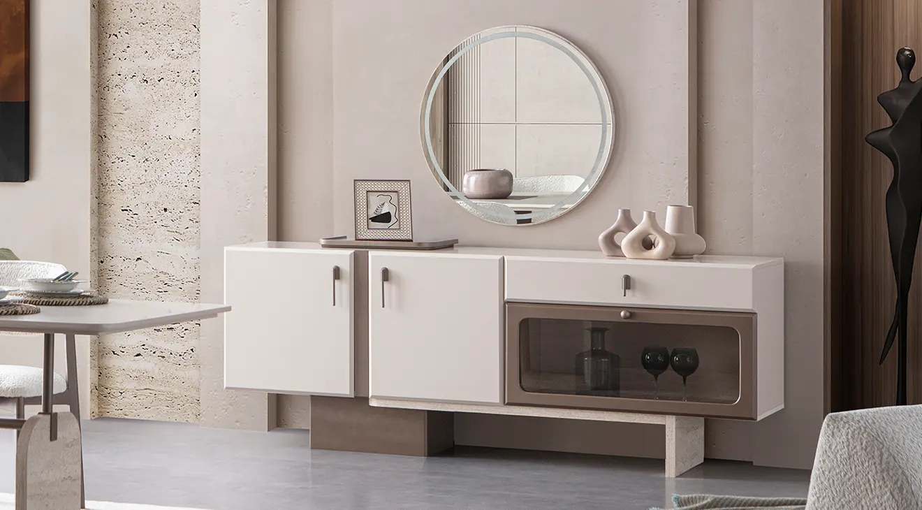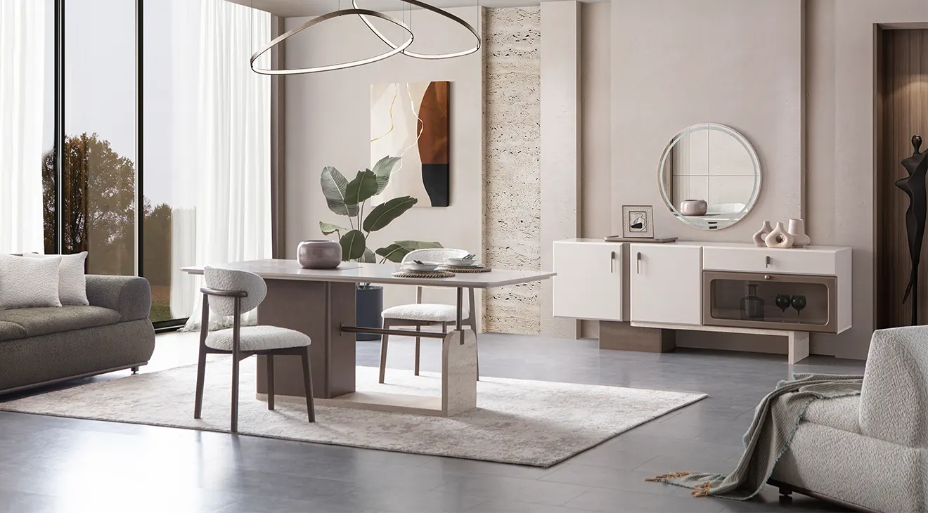 Rocco Ahşap Ayaklı Yemek Odası Takımı; krem tonlar, bronz detaylar ve cam vitrinli konsoluyla modern şıklık, ferah depolama ve rahat oturum sunar.