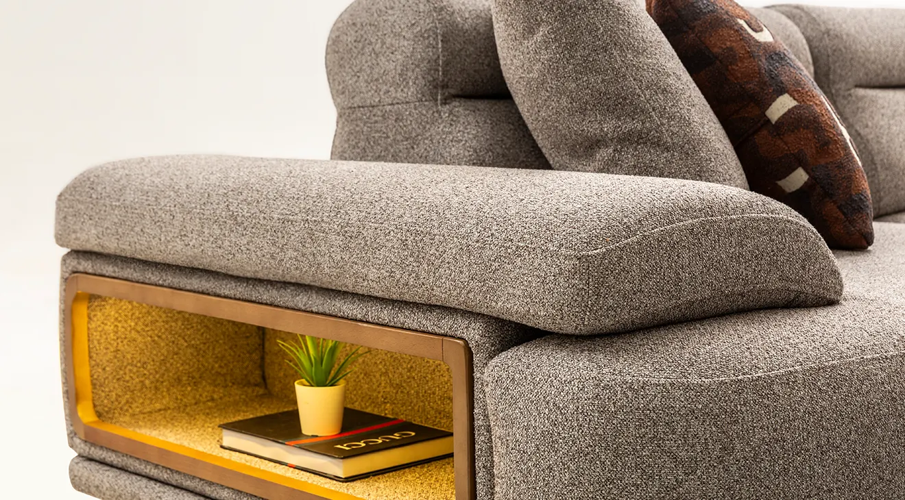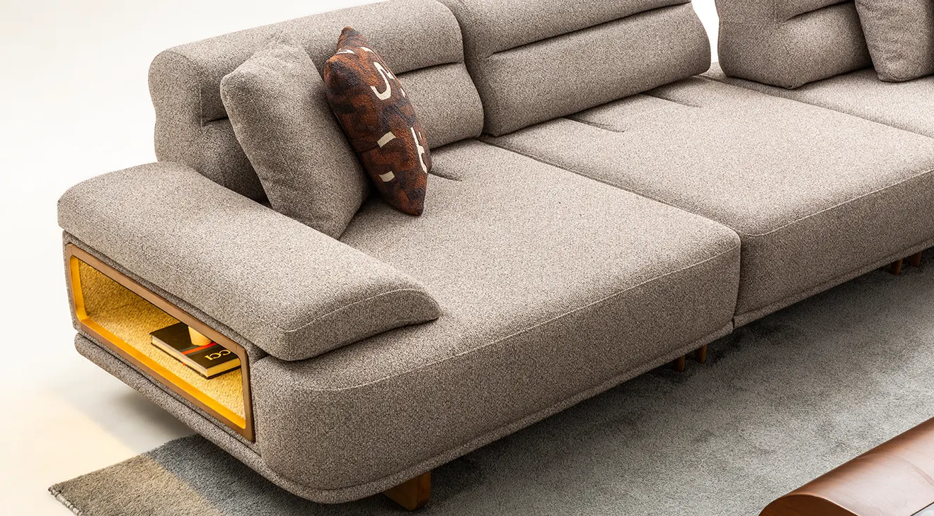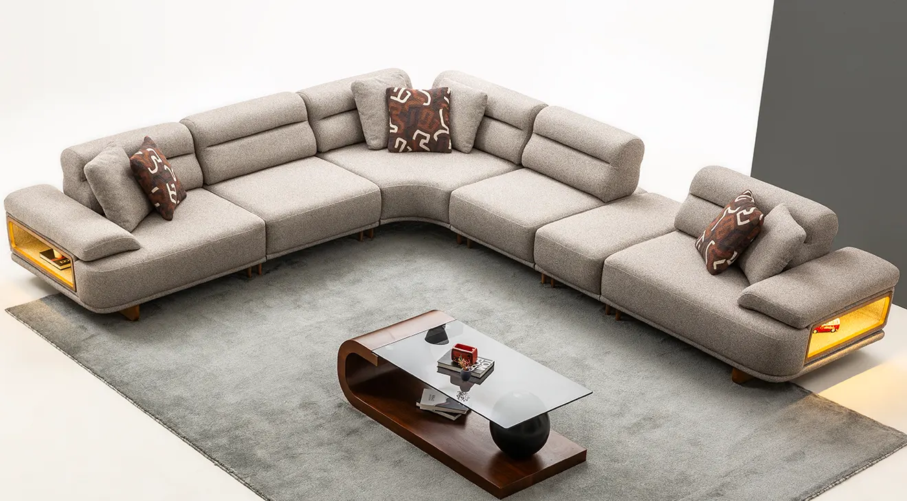 Ceviz ağacı ayakları ve entegre LED aydınlatmalı raf detayıyla Roma Ahşap Ayaklı Köşe Koltuk Takımı, modern yaşam alanınıza sıcaklık ve fonksiyonellik katıyor.