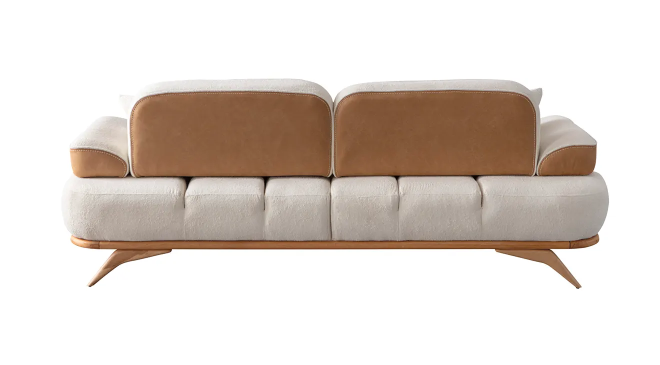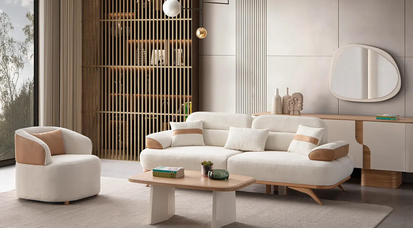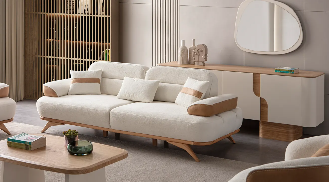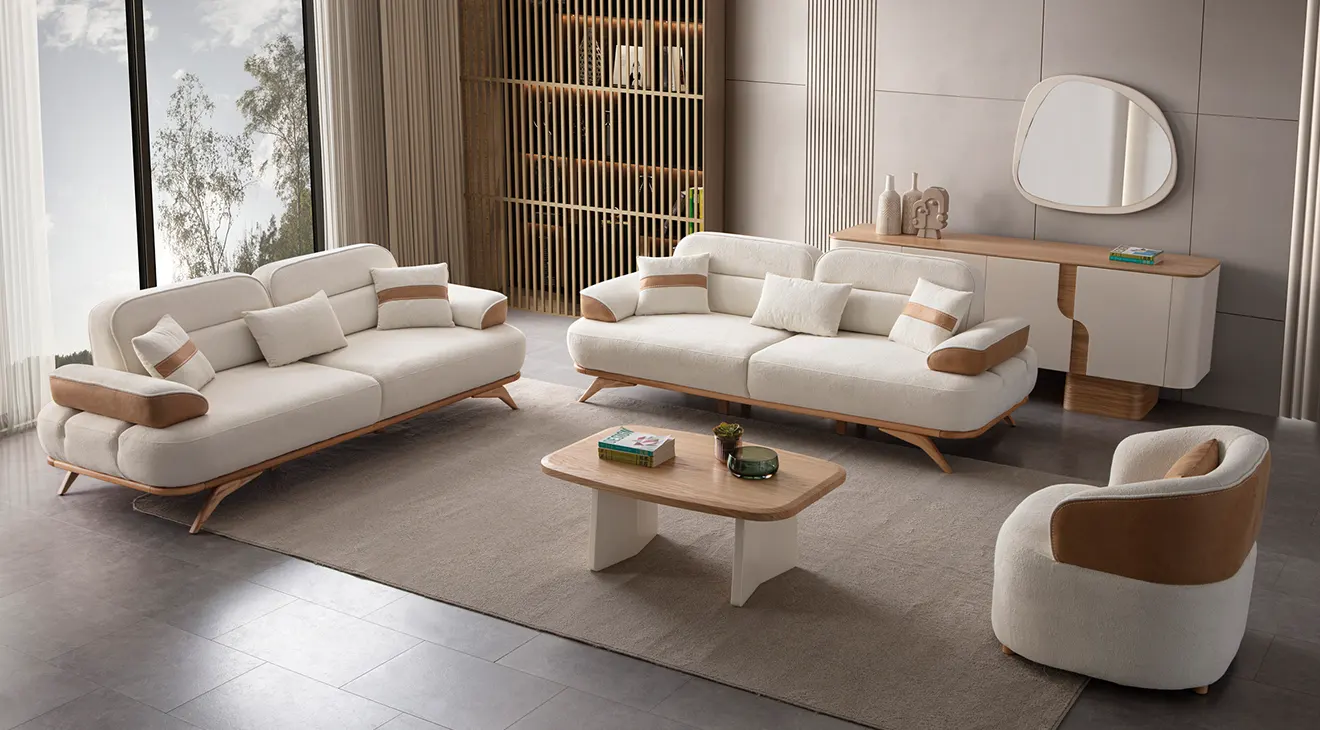 Salda Koltuk Takımı; krem dokulu kumaş, doğal ahşap ayaklar ve sıcak kahve deri detaylarıyla konforu ve şıklığı buluşturuyor.
