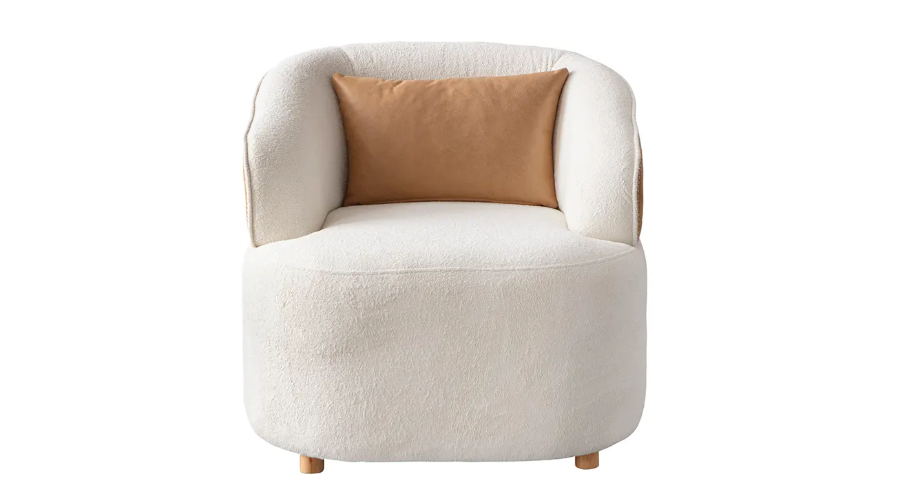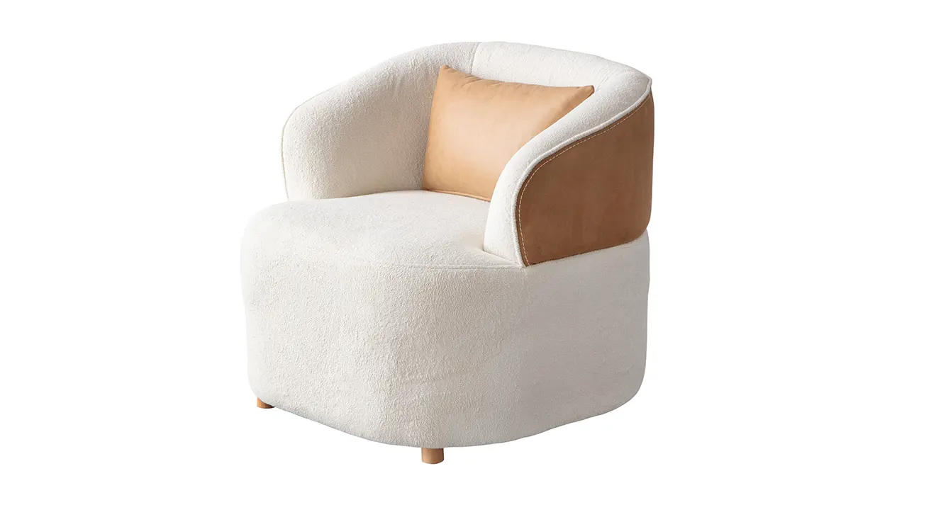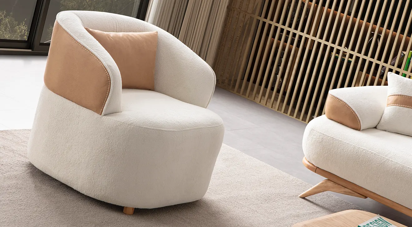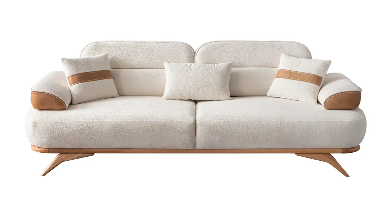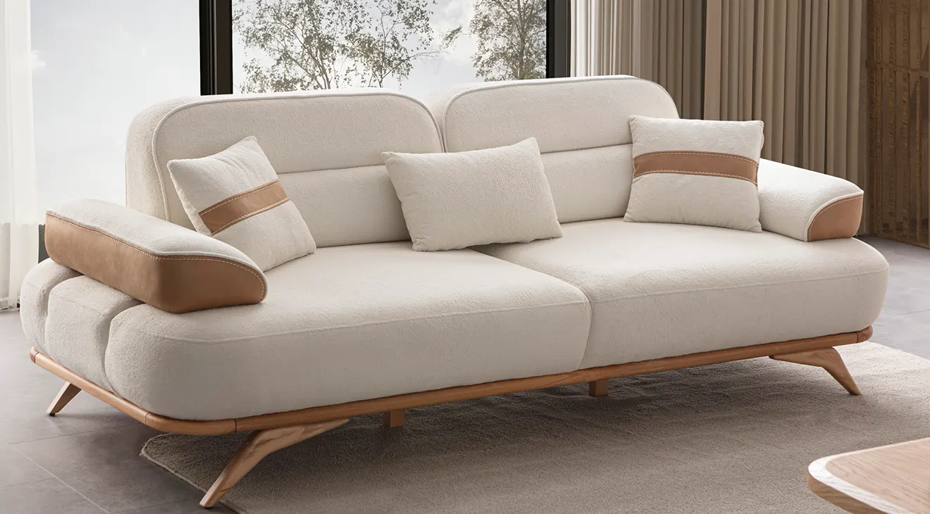 Salda Koltuk Takımı; krem dokulu kumaş, doğal ahşap ayaklar ve sıcak kahve deri detaylarıyla konforu ve şıklığı buluşturuyor.