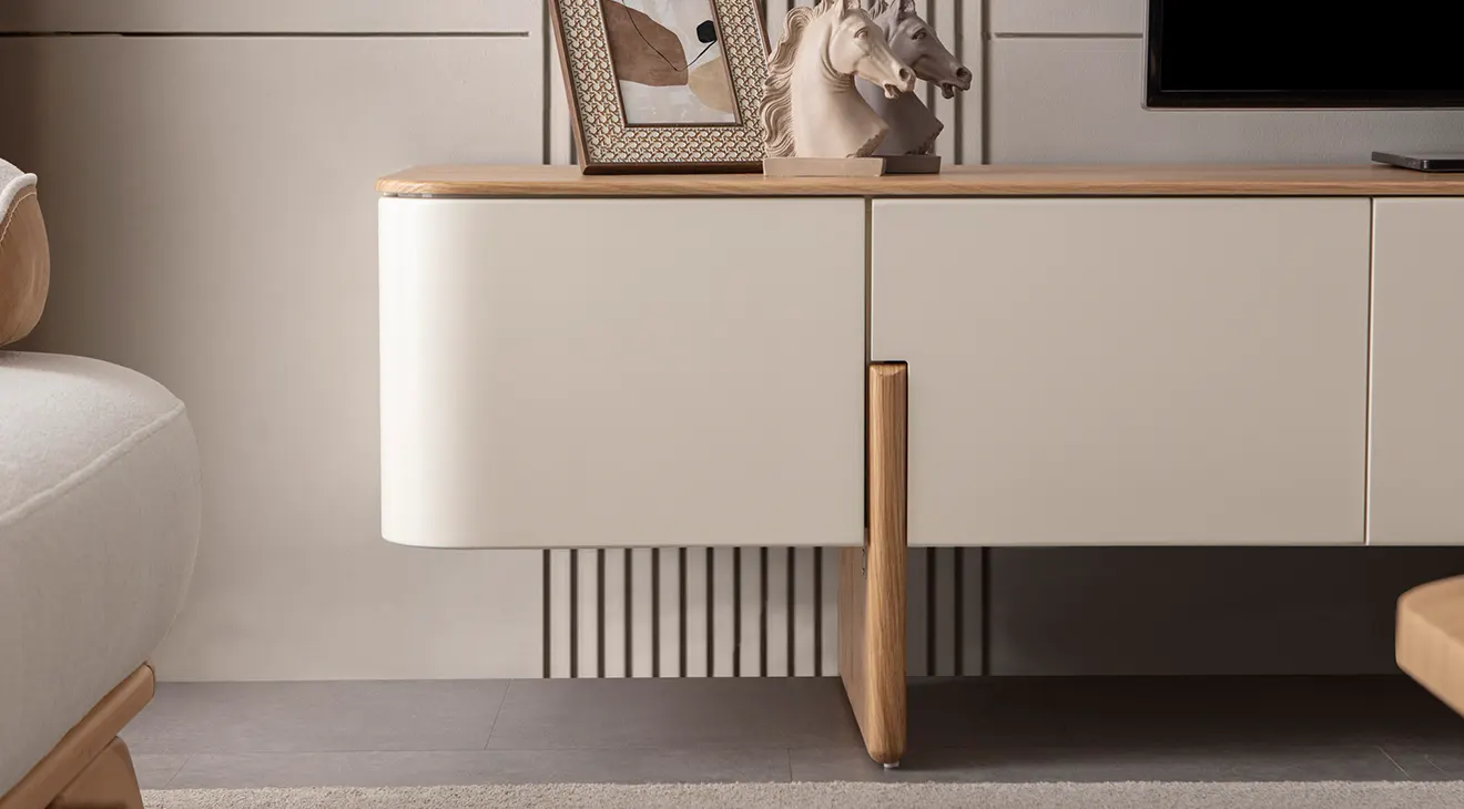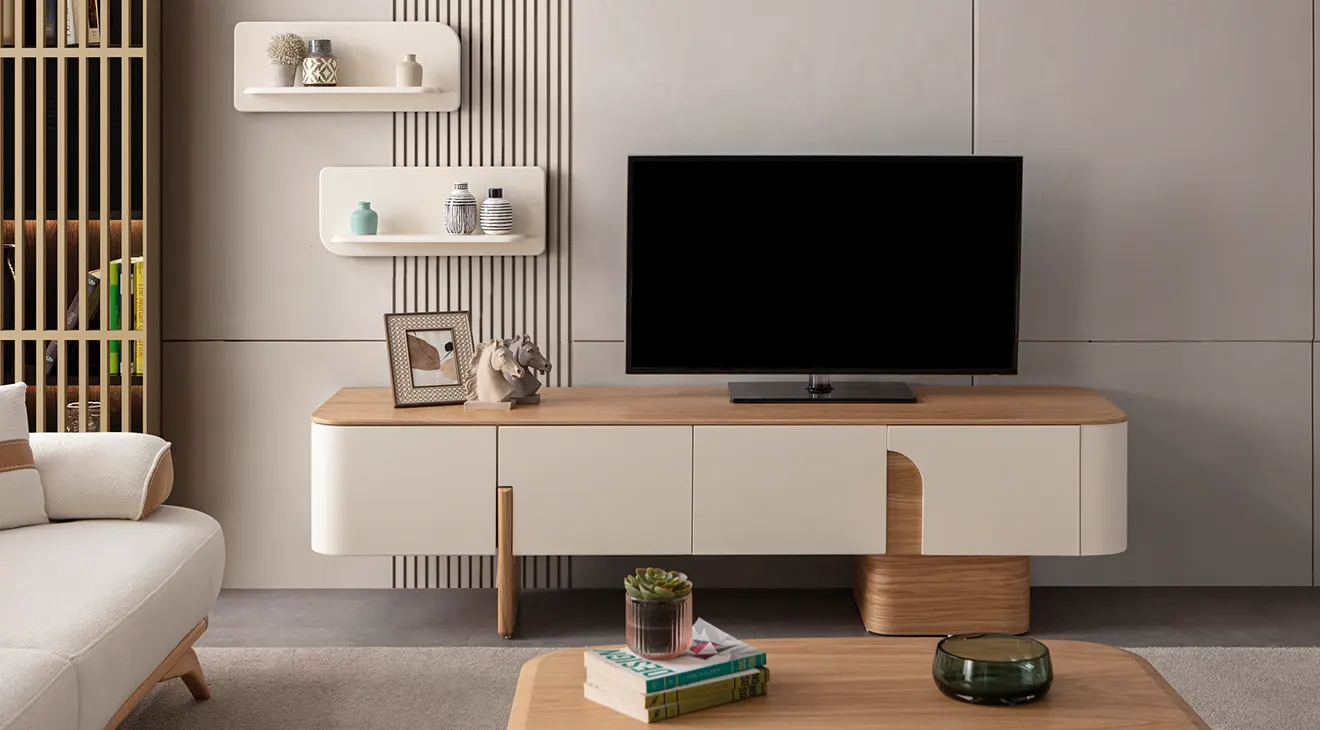 Salda Tv Ünitesi, zarif yuvarlatılmış köşeleri ve krem beyaz lake yüzeyiyle temiz bir görünüm sunar. Doğal meşe tonlu üst tabla ve ayak detayları, ünitenin sıcak bir hava kazanmasını sağlar. Gömme kulplu kapaklar ve gizli kablo kanalları, dağınıklığa yer bırakmadan teknolojiyi modern bir şekilde sergiler. Yan yana dört kapaklı geniş depolama alanı, uzaktan kumandalar, medya cihazları ve aksesuarlar için ideal. Duvara monte dekor raflarıyla tamamlandığında, Salda minimal tarzı ve fonksiyonelliği bir araya getirir.
