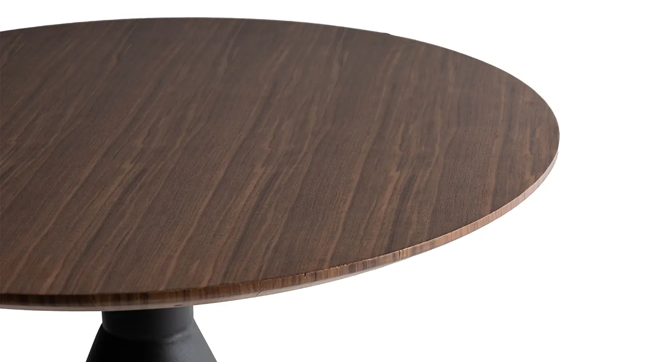 Sasa Yuvarlak Ceviz Masa, konik ayak formu ve ceviz dokusuyla modern şıklık sunar; sağlam tabla, 4 kişilik yemek alanı oluşturur.