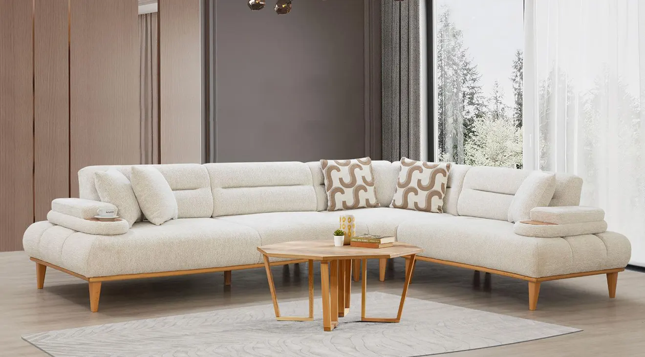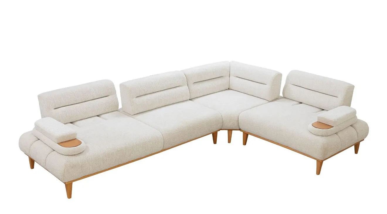 Sitella Ahşap Ayaklı Köşe Koltuk Takımı; modüler yapısı, yatak olma özelliği ve kol dayamadaki bardaklığıyla konforu ve pratikliği birleştirir.
