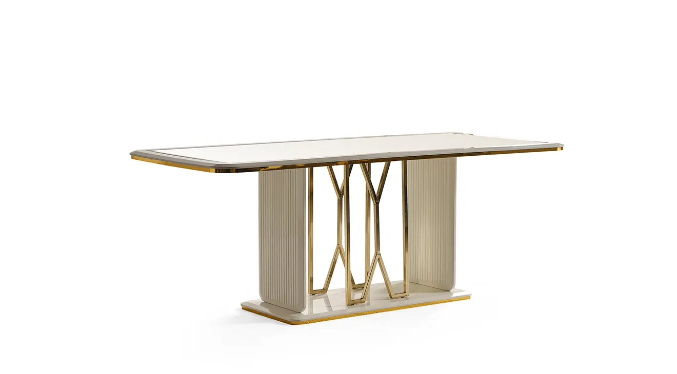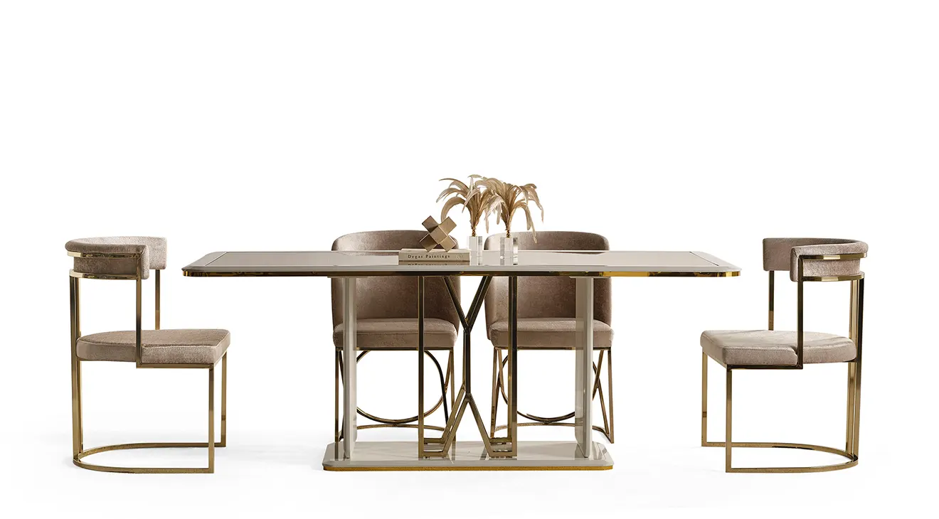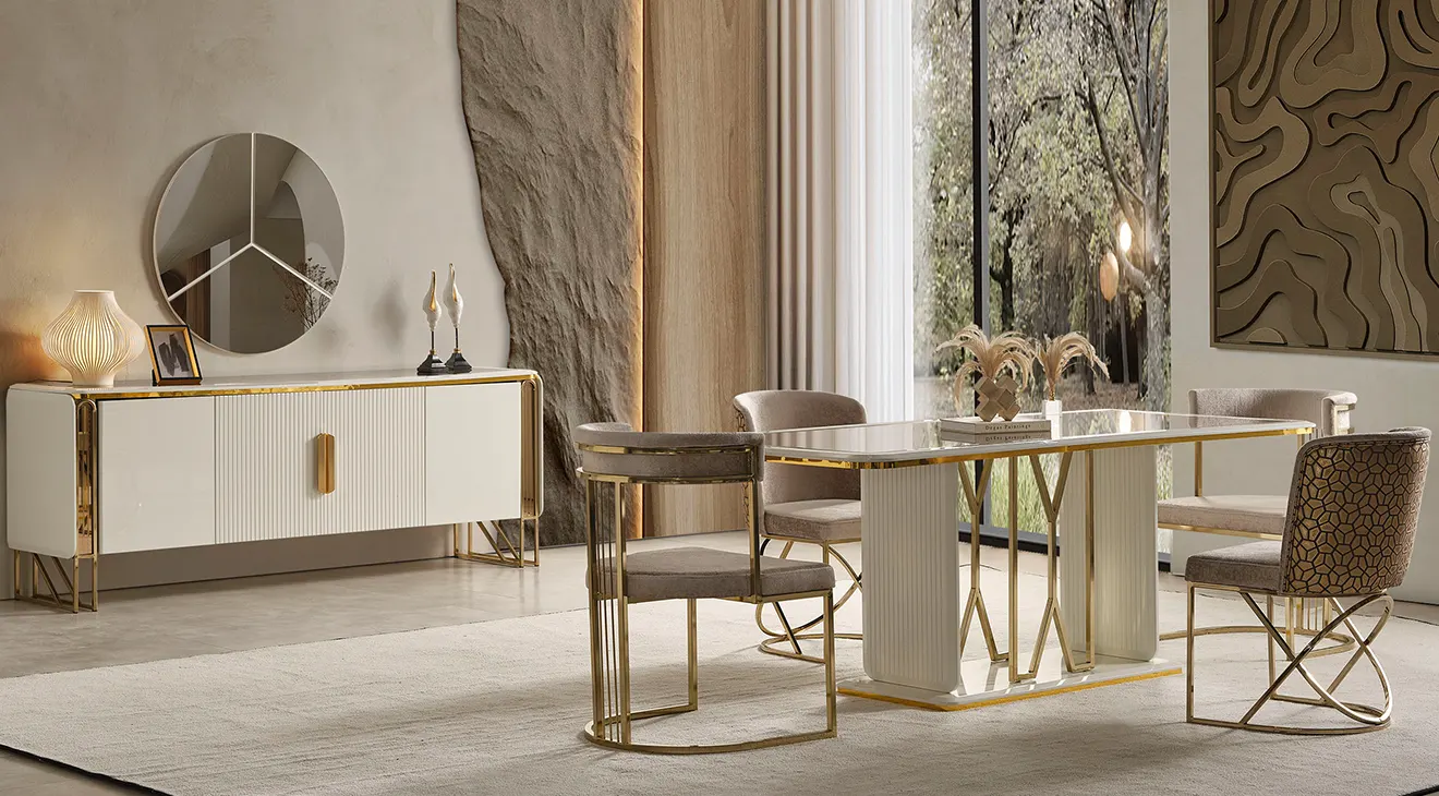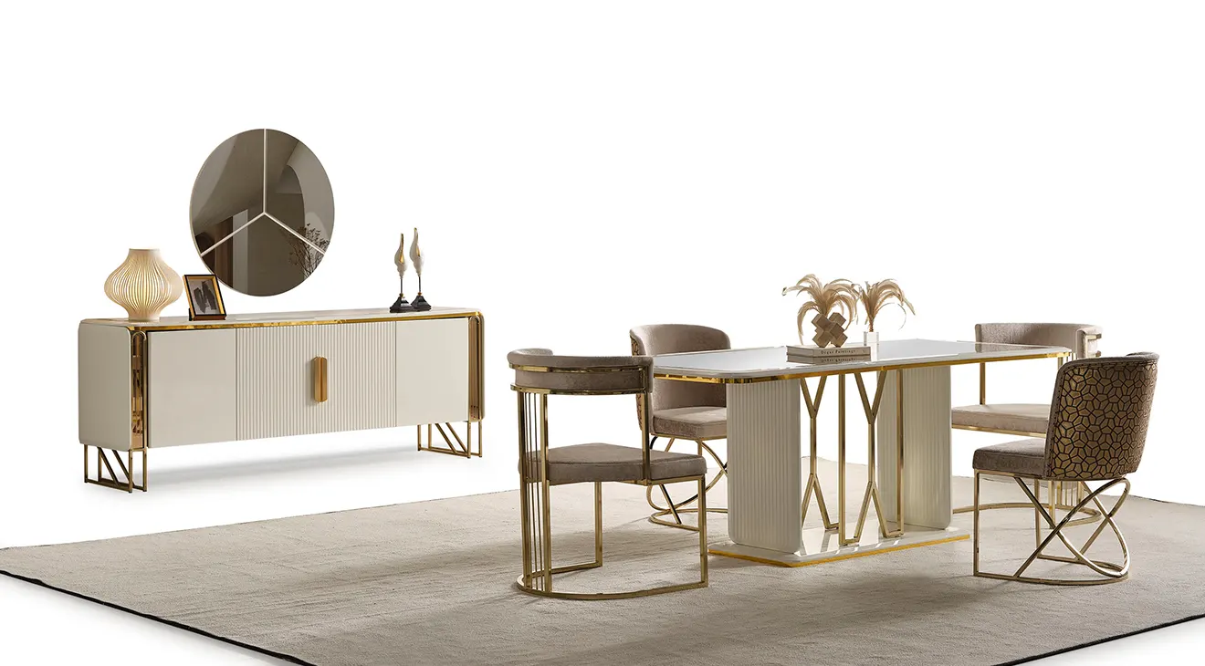 Solo Modern Yemek Odası Takımı, parlak beyaz lake yüzeyi ve zamansız altın metal detaylarıyla yaşam alanınıza sofistike bir dokunuş katıyor. Kadife kaplı konforlu sandalyeler, heykelsi geometrik ayak yapısı ve geniş depolama alanlı konsol ünitesiyle estetik ve işlevselliği bir arada sunar.