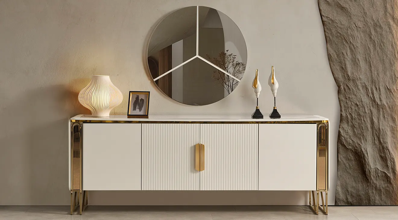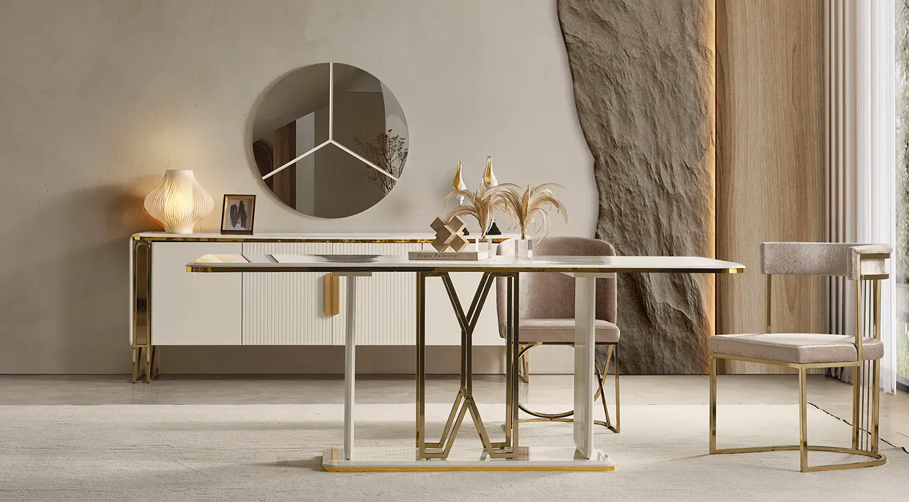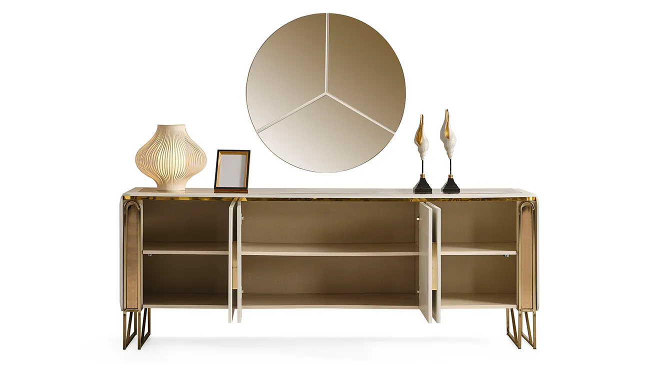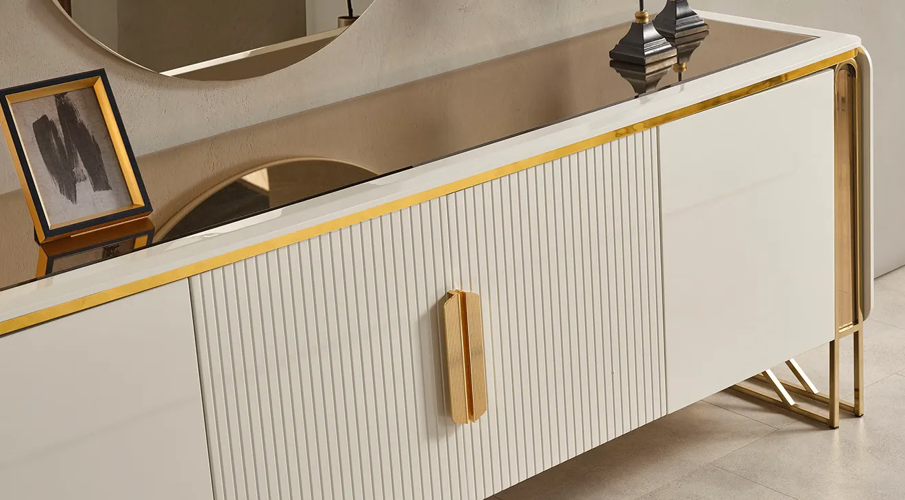 Solo Modern Yemek Odası Takımı, parlak beyaz lake yüzeyi ve zamansız altın metal detaylarıyla yaşam alanınıza sofistike bir dokunuş katıyor. Kadife kaplı konforlu sandalyeler, heykelsi geometrik ayak yapısı ve geniş depolama alanlı konsol ünitesiyle estetik ve işlevselliği bir arada sunar.