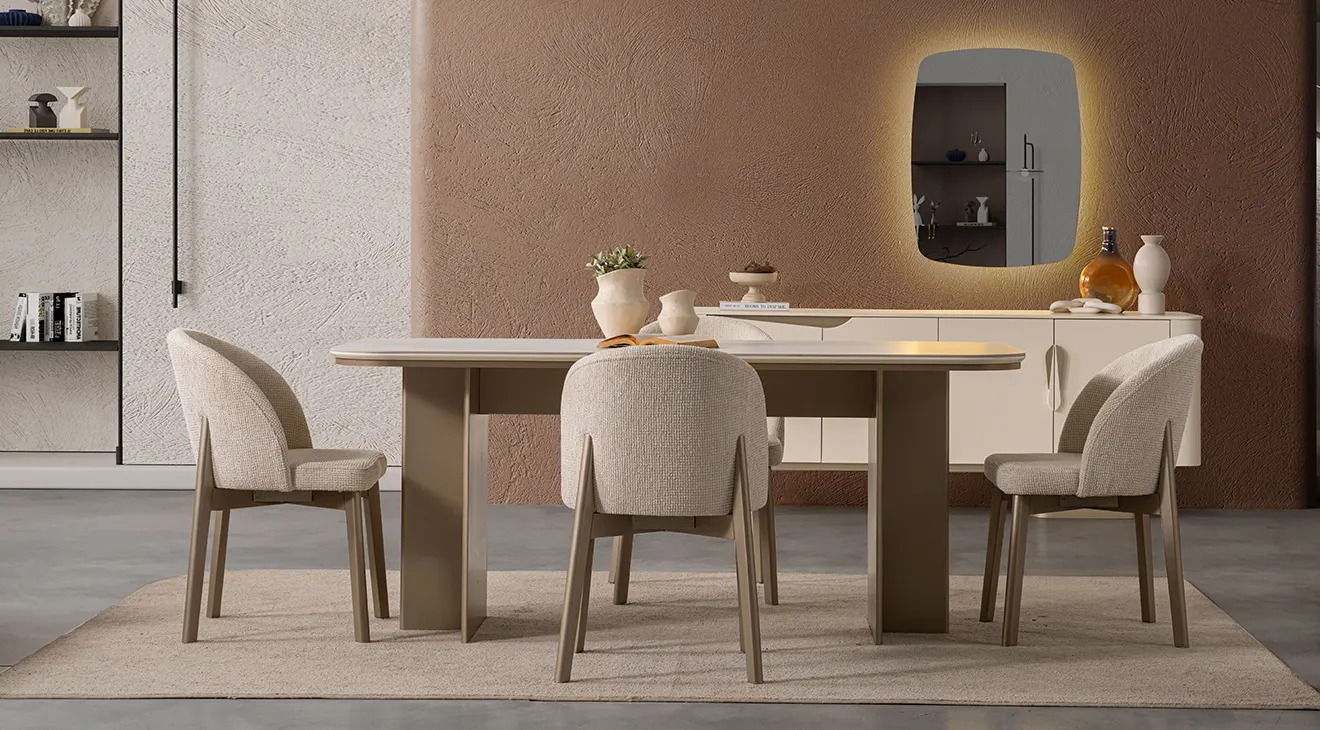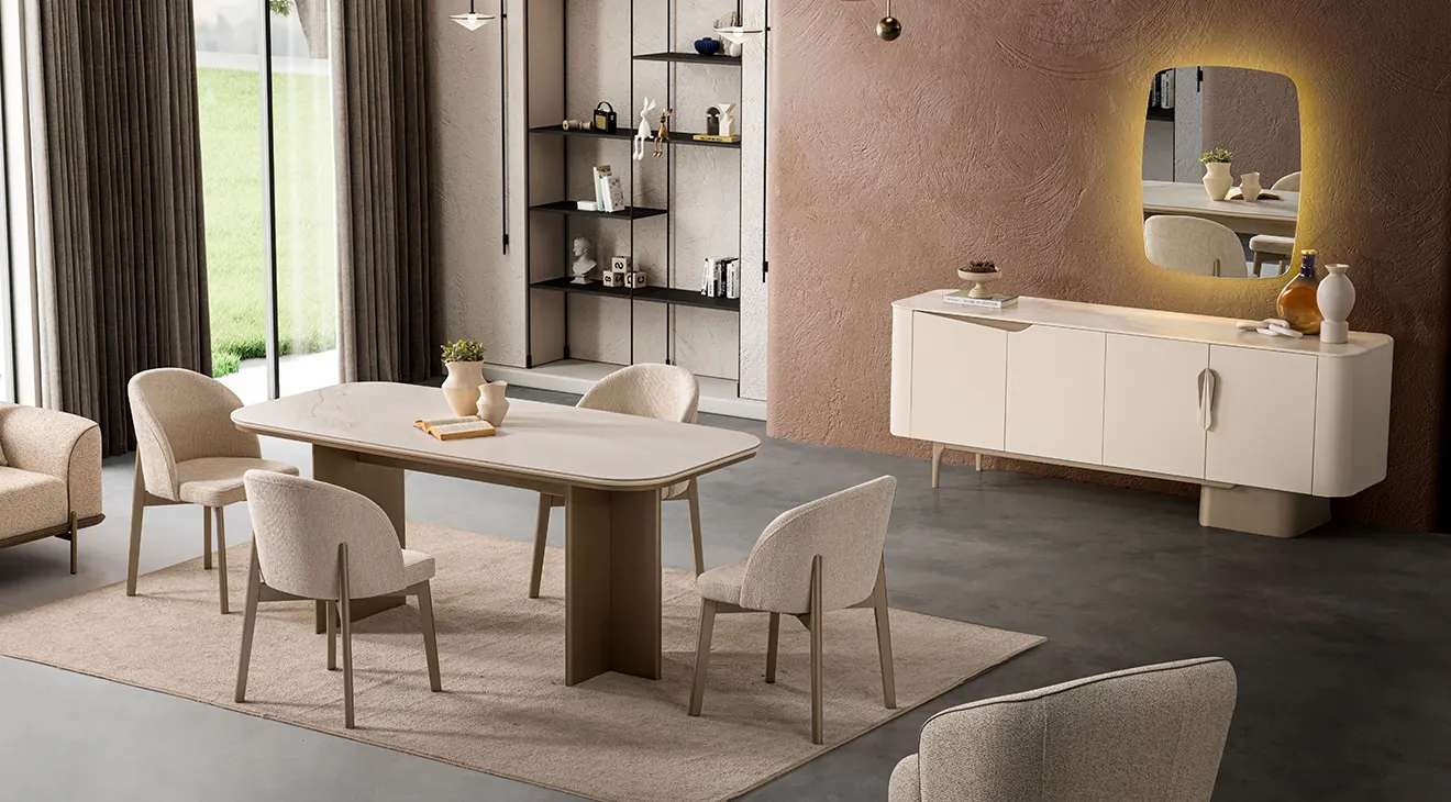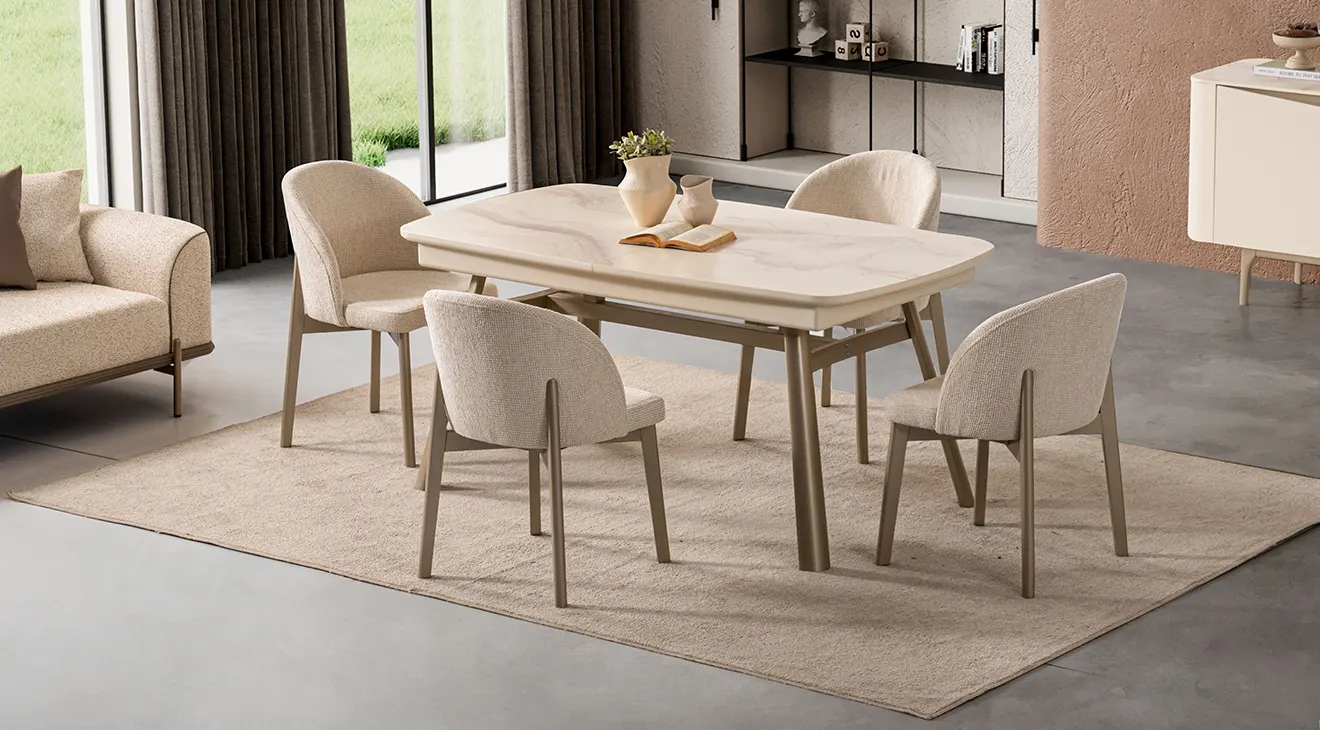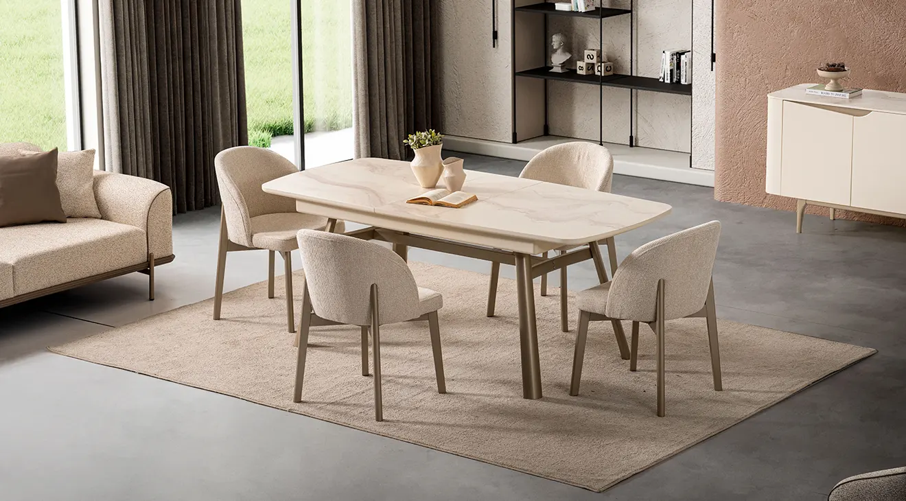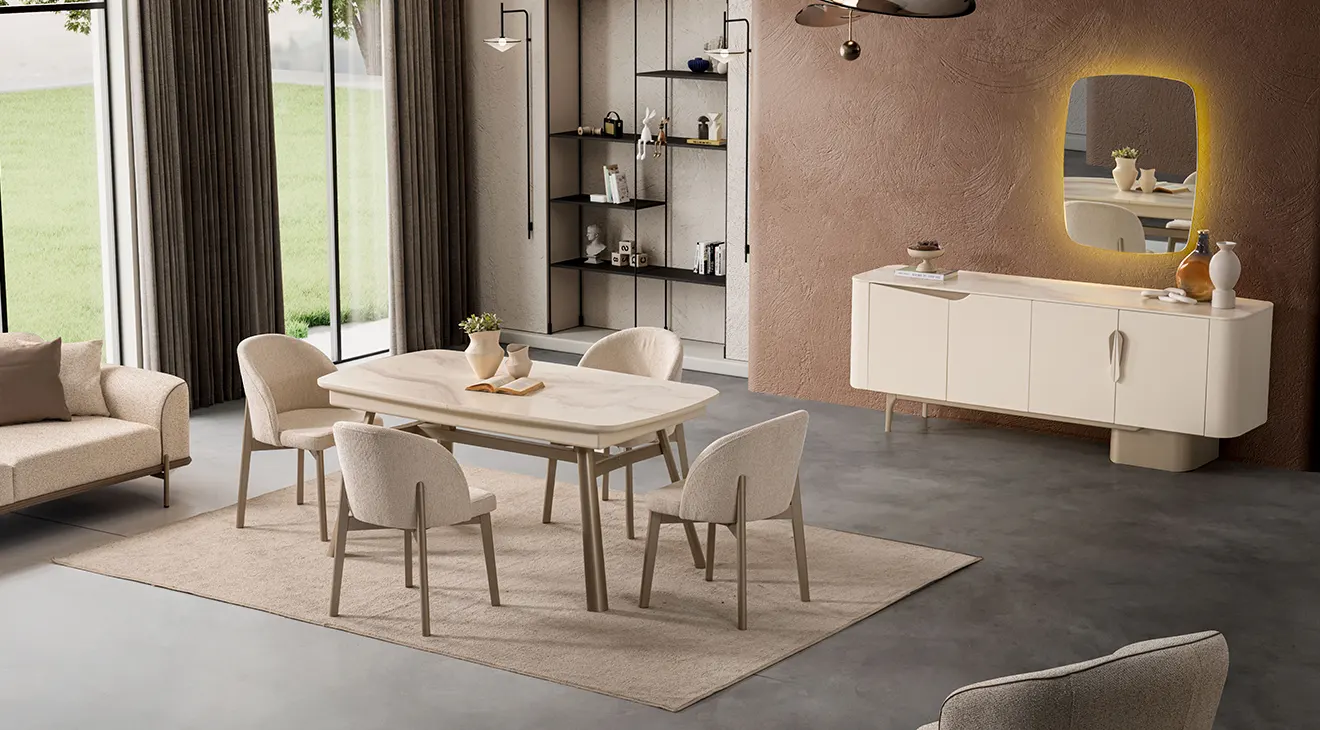 Stella Ahşap Ayaklı Yemek Odası Takımı; mermer görünümlü masa tablası ve uyumlu konsoluyla ferah, modern bir yemek alanı oluşturur.