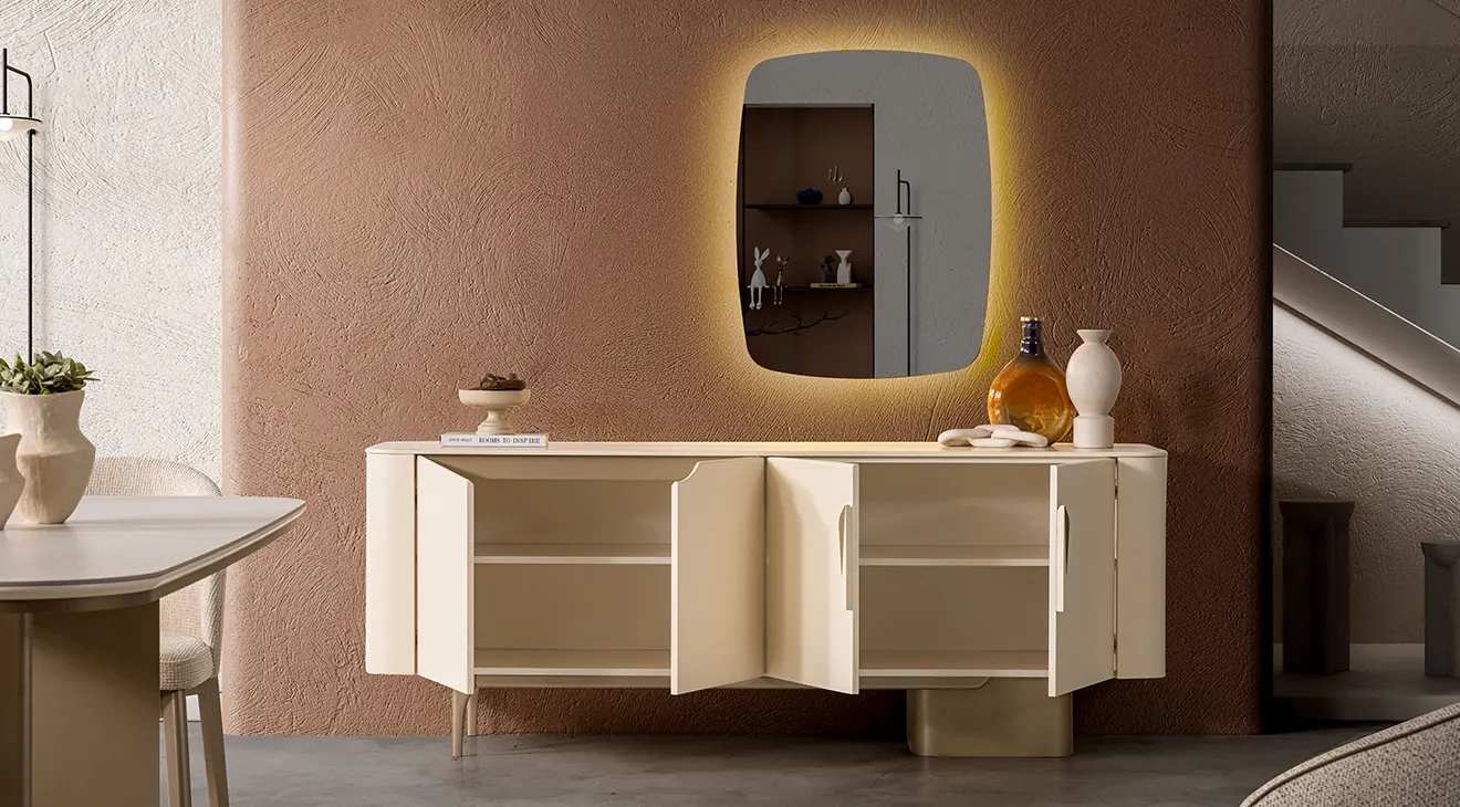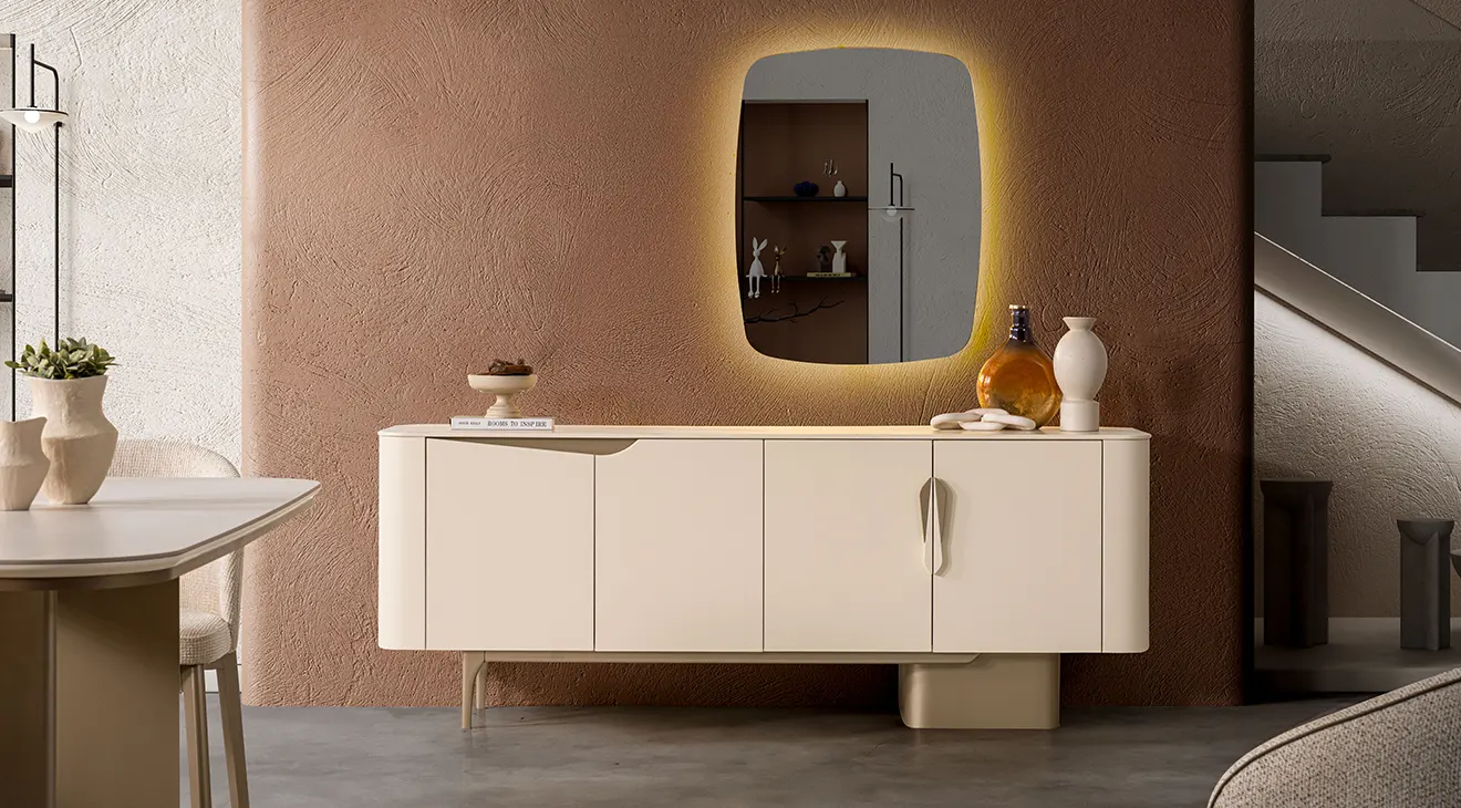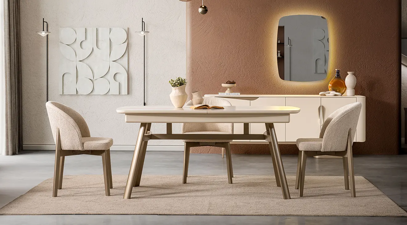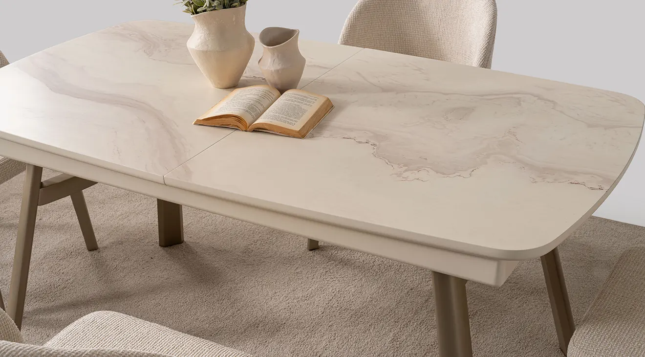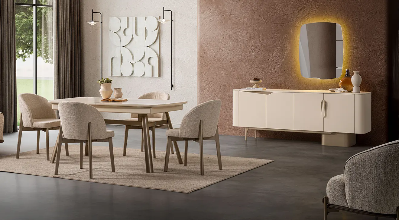 Stella Ahşap Ayaklı Yemek Odası Takımı; mermer görünümlü masa tablası ve uyumlu konsoluyla ferah, modern bir yemek alanı oluşturur.