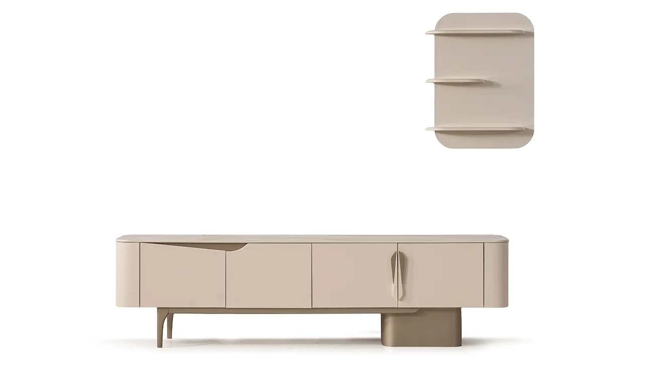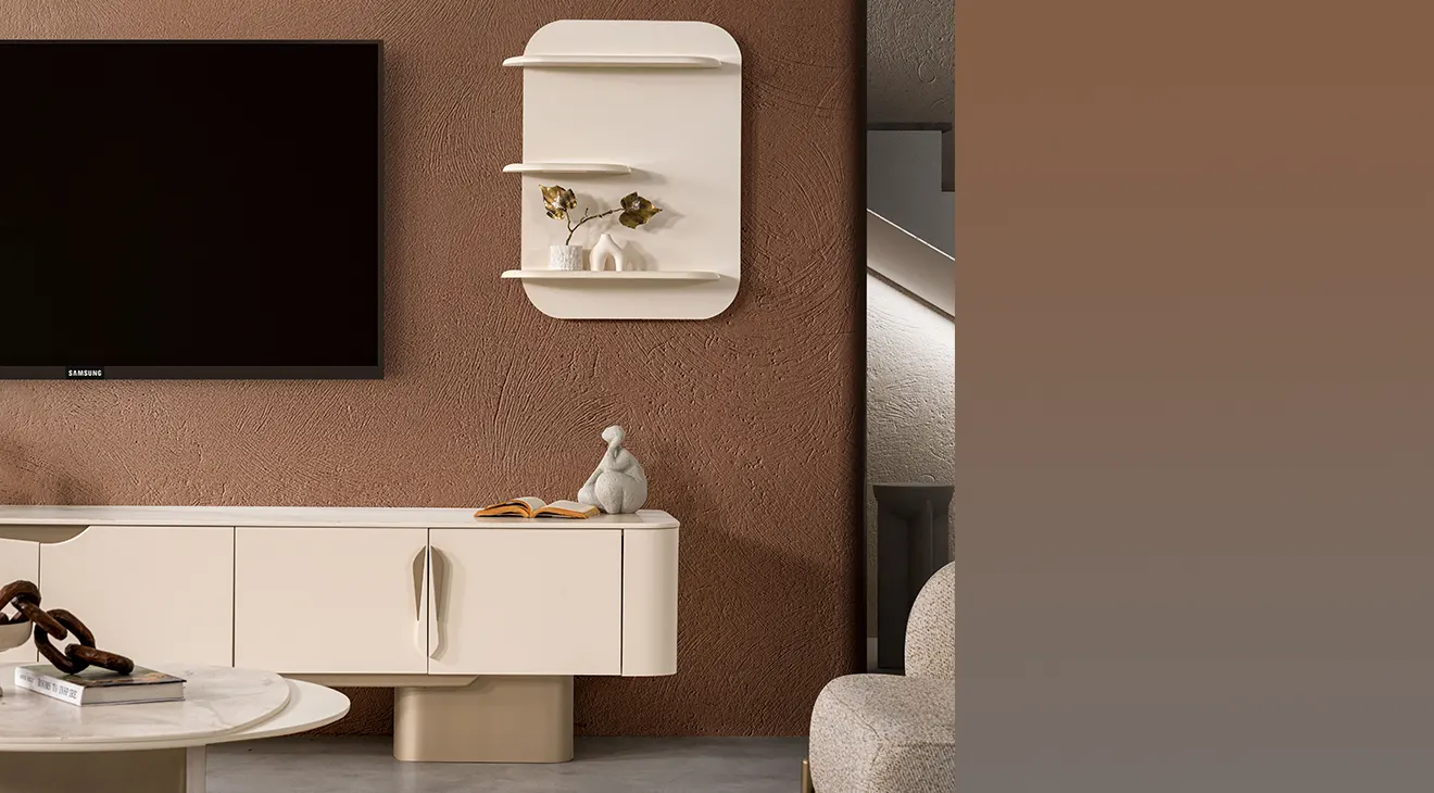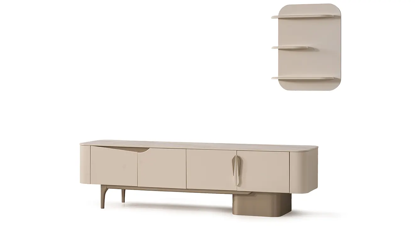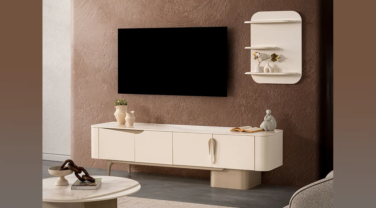 Stella modern TV ünitesi; geniş depolama, yuvarlatılmış hatlar ve duvar rafıyla TV köşenizi düzenli tutar, kablo gizler.