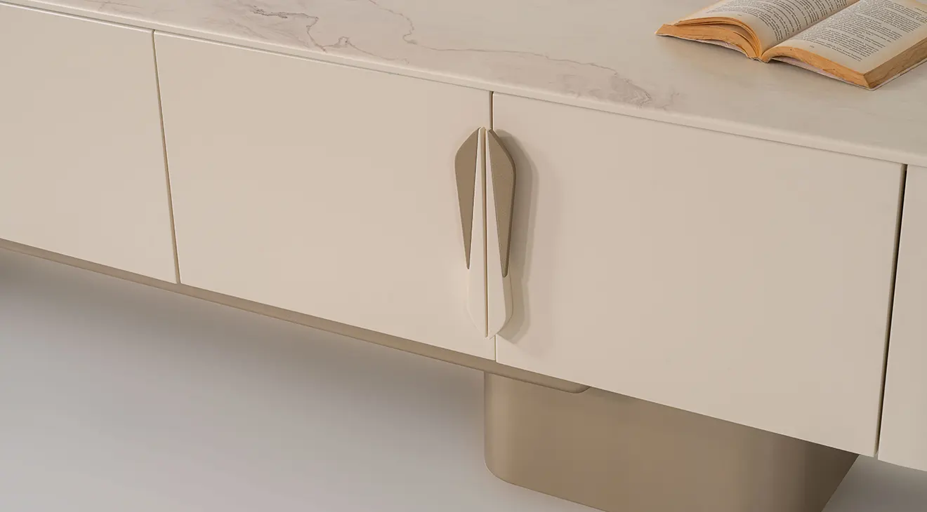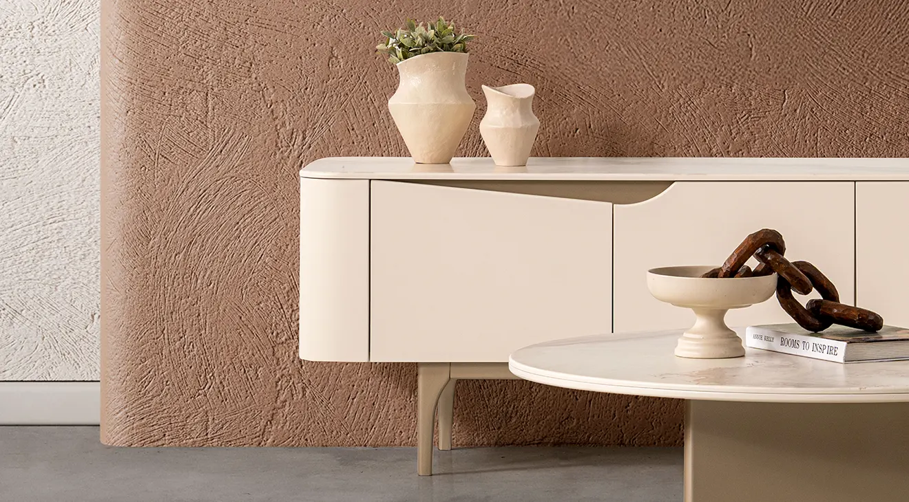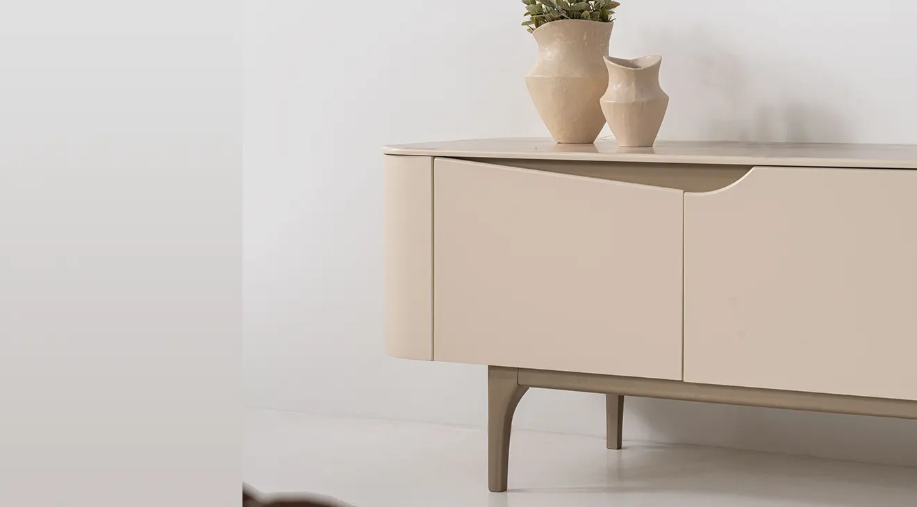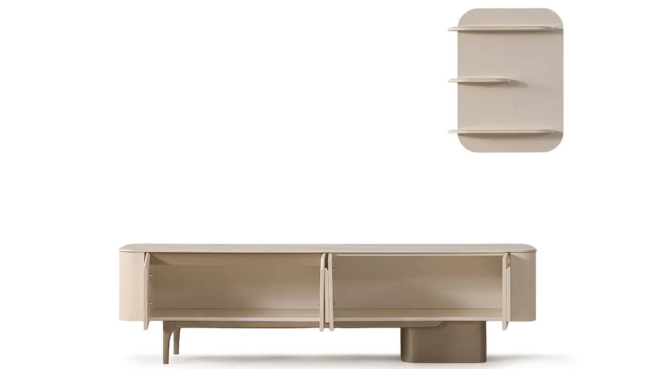 Stella modern TV ünitesi; geniş depolama, yuvarlatılmış hatlar ve duvar rafıyla TV köşenizi düzenli tutar, kablo gizler.