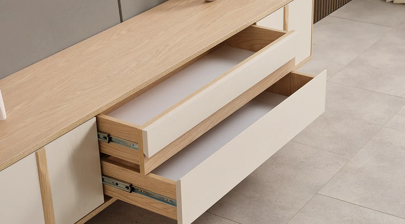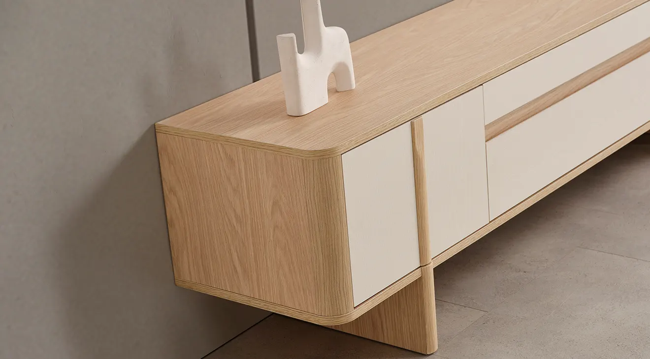 Stil Ahşap Ayaklı TV Ünitesi, açık meşe tonlu gövdesi ve kırık beyaz kapak/çekmece yüzeyleriyle ferah bir görünüm sunar; ince ahşap şerit detayları tasarıma modern bir karakter katar. Geniş üst tabla TV ve dekoratif aksesuarlar için ideal alan sağlarken, kapaklı bölmeler ve çekmeceler kumanda, modem ve kablo düzenini kolayca toparlar. Yerden yüksek ahşap ayak yapısı robot süpürge dâhil temizlikte pratiklik sunar; yumuşatılmış köşe geçişleriyle mekâna daha sıcak ve dengeli bir hava kazandırır. Duvar rafı ve duvar dolabı ile birlikte kullanıldığında bütüncül, sade ve şık bir TV köşesi oluşturur.