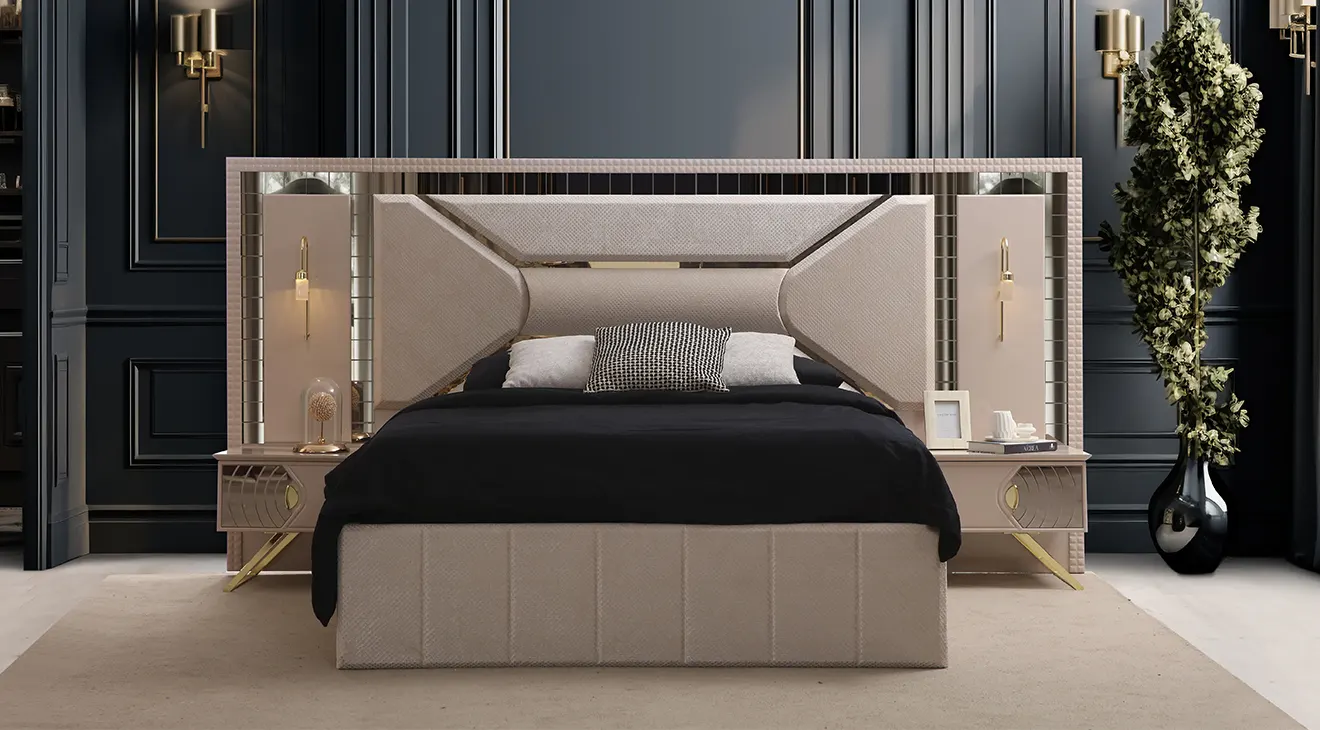 Sultan 6 Kapaklı Yatak Odası Takımı; aynalı kapakları, kabartma dokulu yüzeyleri ve gold şerit detaylarıyla yatak odasına modern-lüks bir hava katar. 6 kapaklı geniş dolap; askılık, raf ve çekmeceleriyle tüm eşyaları düzenli toplar. Özel tasarım başlıkta yer alan şık aydınlatmalar gece kullanımını konforlu hale getirirken, sandıklı baza geniş depolama alanıyla ferah bir düzen sağlar.