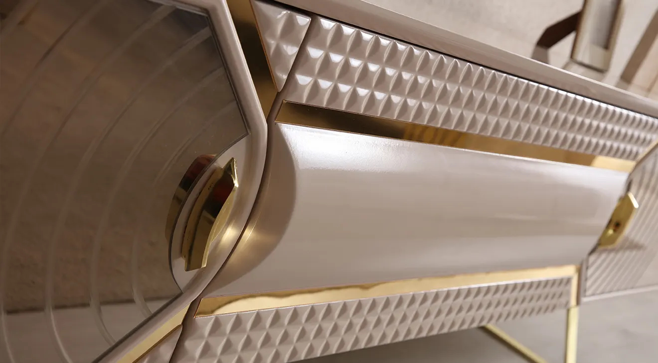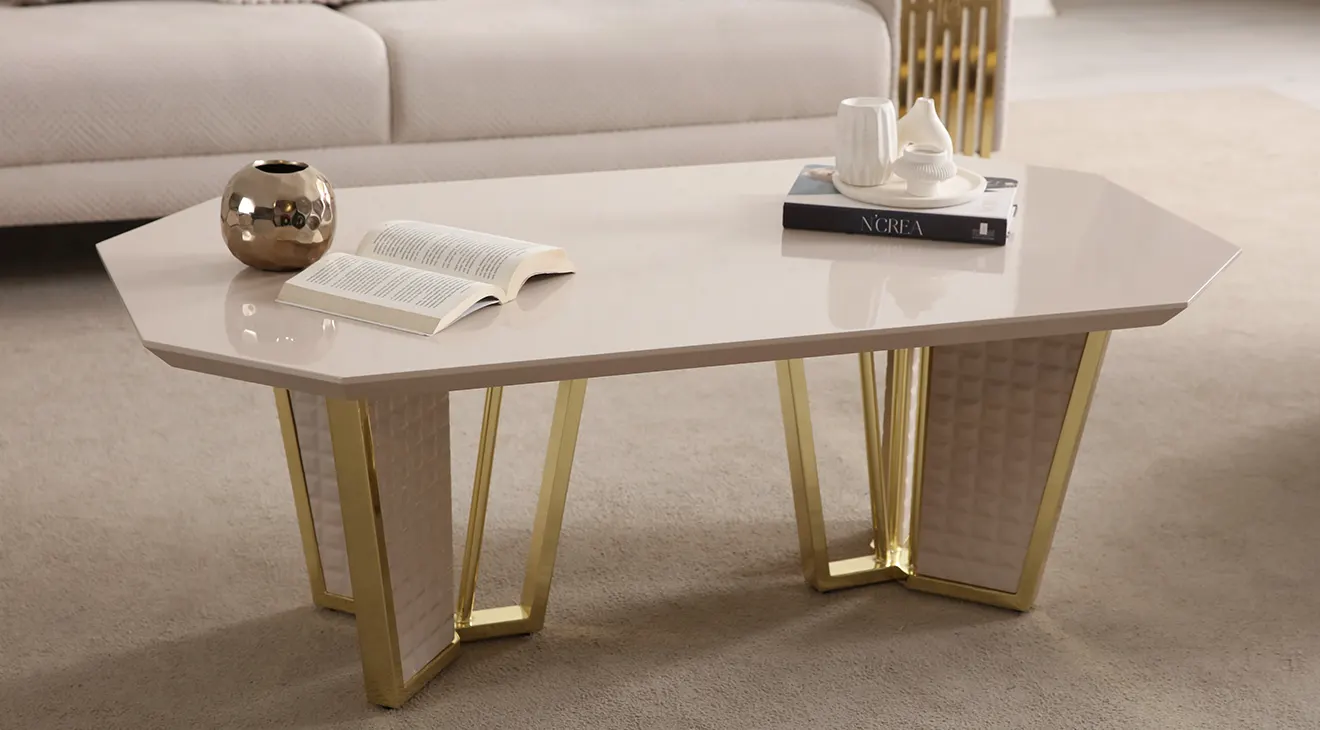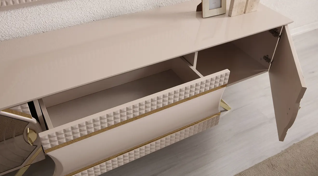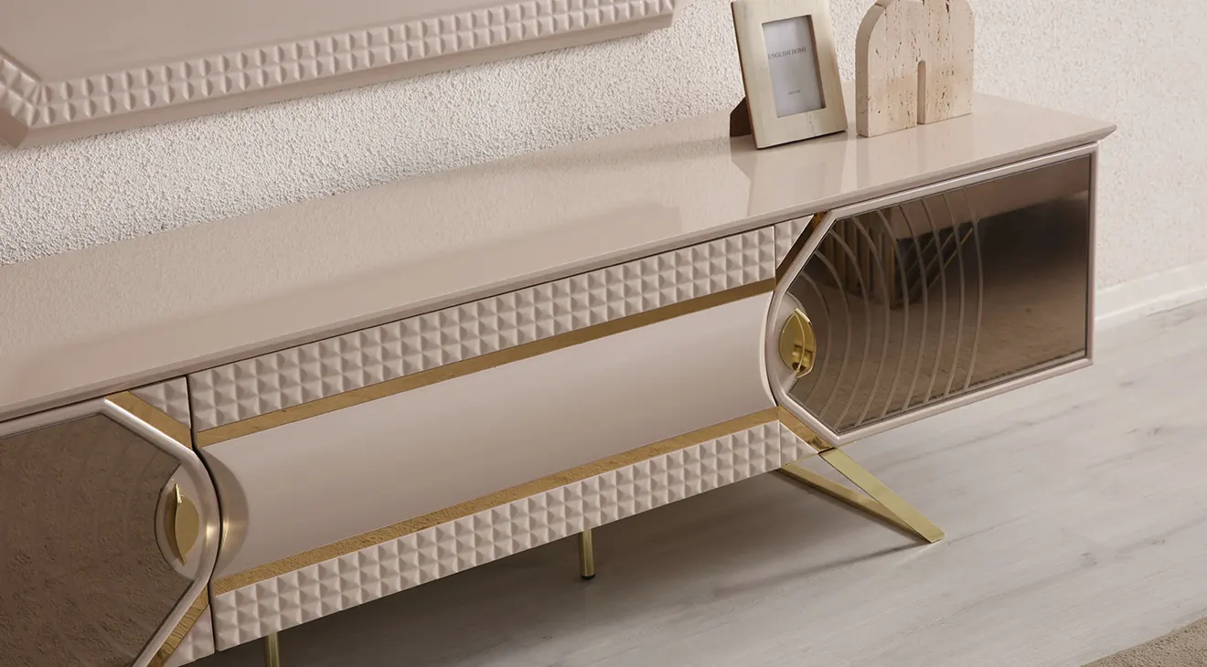 Sultan Metal Ayaklı TV Ünitesi; parlak krem üst tabla, altın metal ayak ve detaylarıyla modern durur. Çekmece+kapaklı depolama ile düzen sağlar.