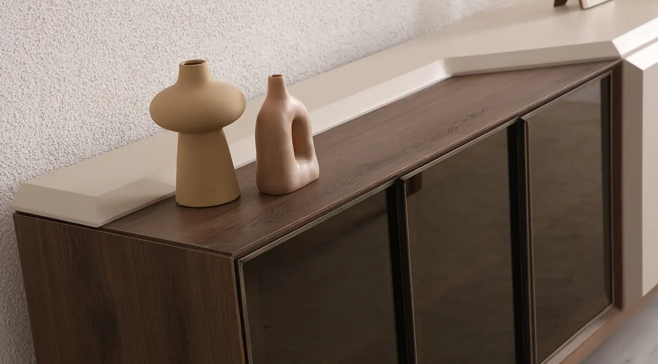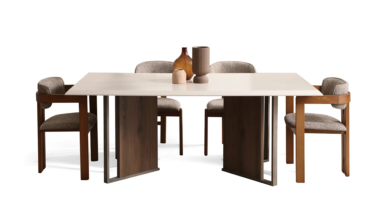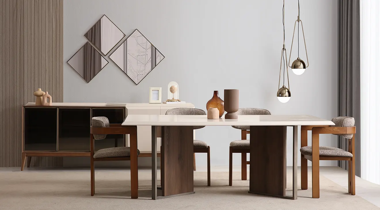 Tetra Ahşap Ayaklı Modern Yemek Odası Takımı; krem-ceviz uyumu, sağlam masa tablası, konforlu sandalyeler ve geniş konsollu depolamayla tamamlanır.
