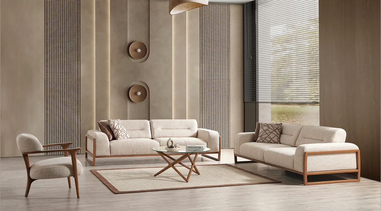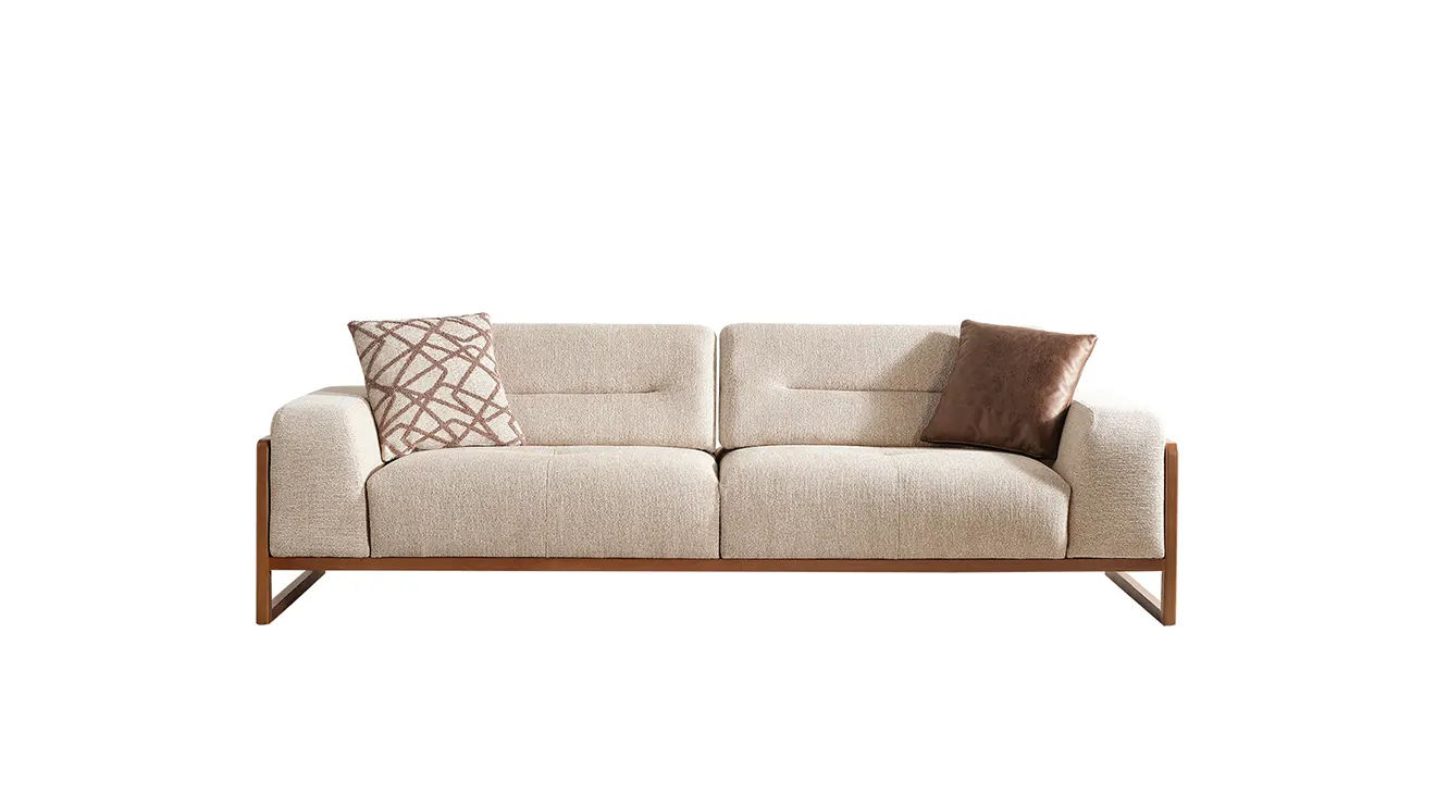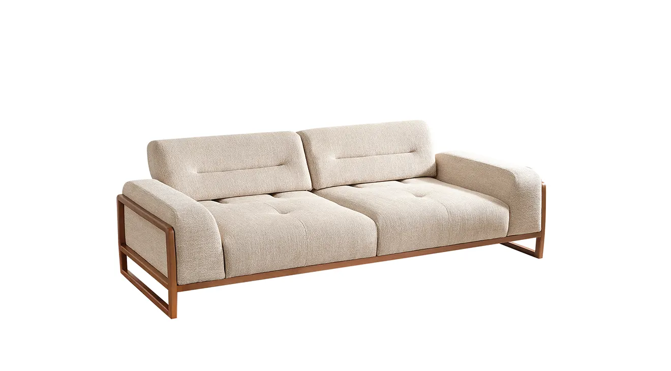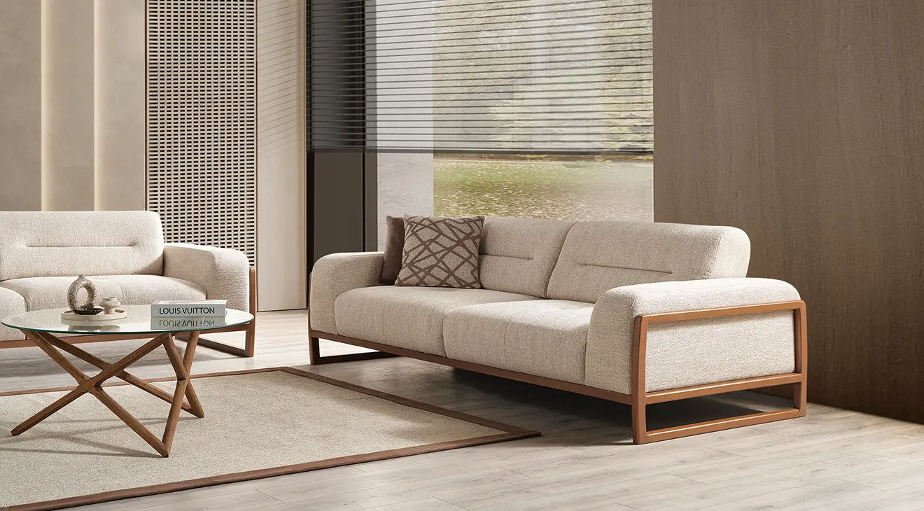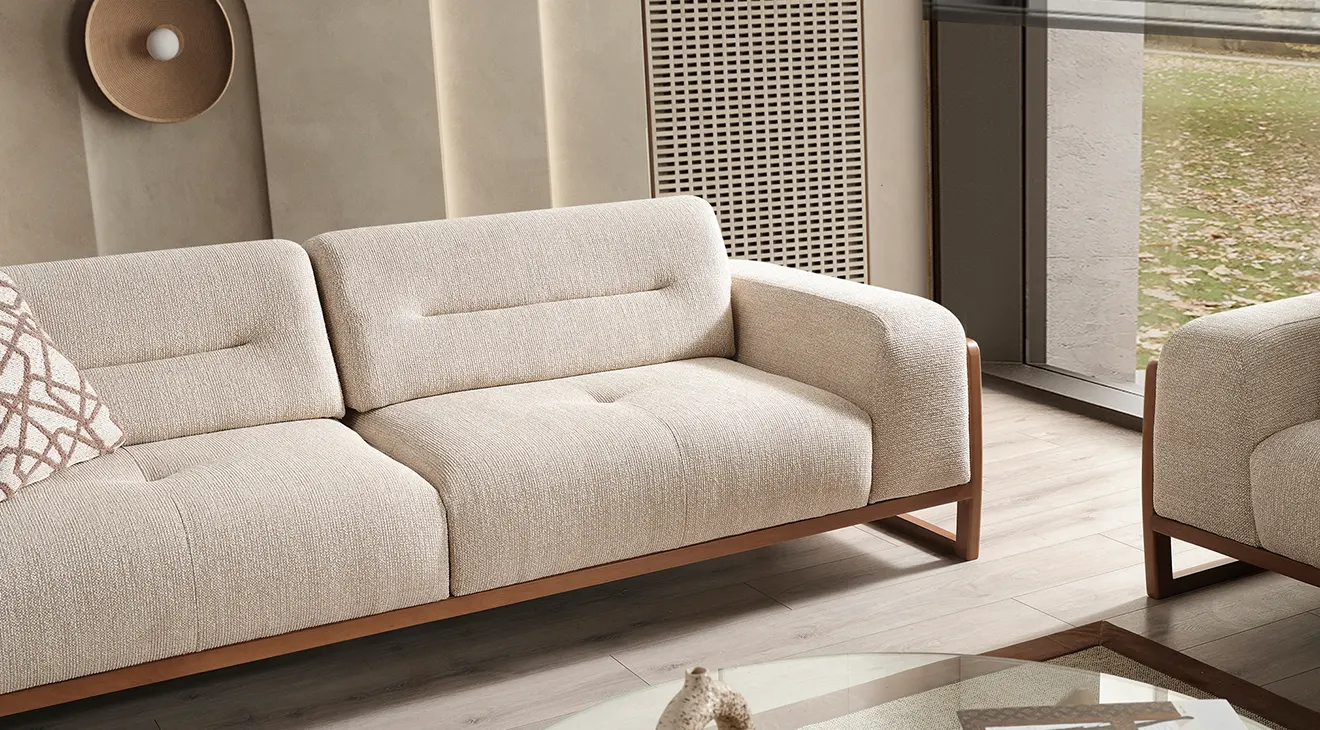 Tog Elya Koltuk Takımı, doğal ahşap iskeleti ve sıcak bej kumaşıyla modern oturma odanıza samimi bir şıklık getirir. Üçlü ve ikili kanepeleriyle geniş oturma alanı, tekli koltuğu ve yumuşak minderleriyle rahatlığı zarafetle buluşturur.