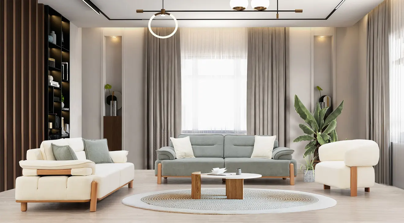 Yuvarlak hatları, sıcak ahşap ayakları ve dokulu kumaşıyla Togo, modern–İskandinav çizgiyi salona taşır. Koyu gri ve krem tonlarıyla kombinlenebilen set; 3’lü, 2’li ve berjer seçenekleriyle kompakt alanlarda bile ferah bir görünüm sağlar. Destekleyici oturumu ve yumuşak minderleri günlük konforu yükseltir.