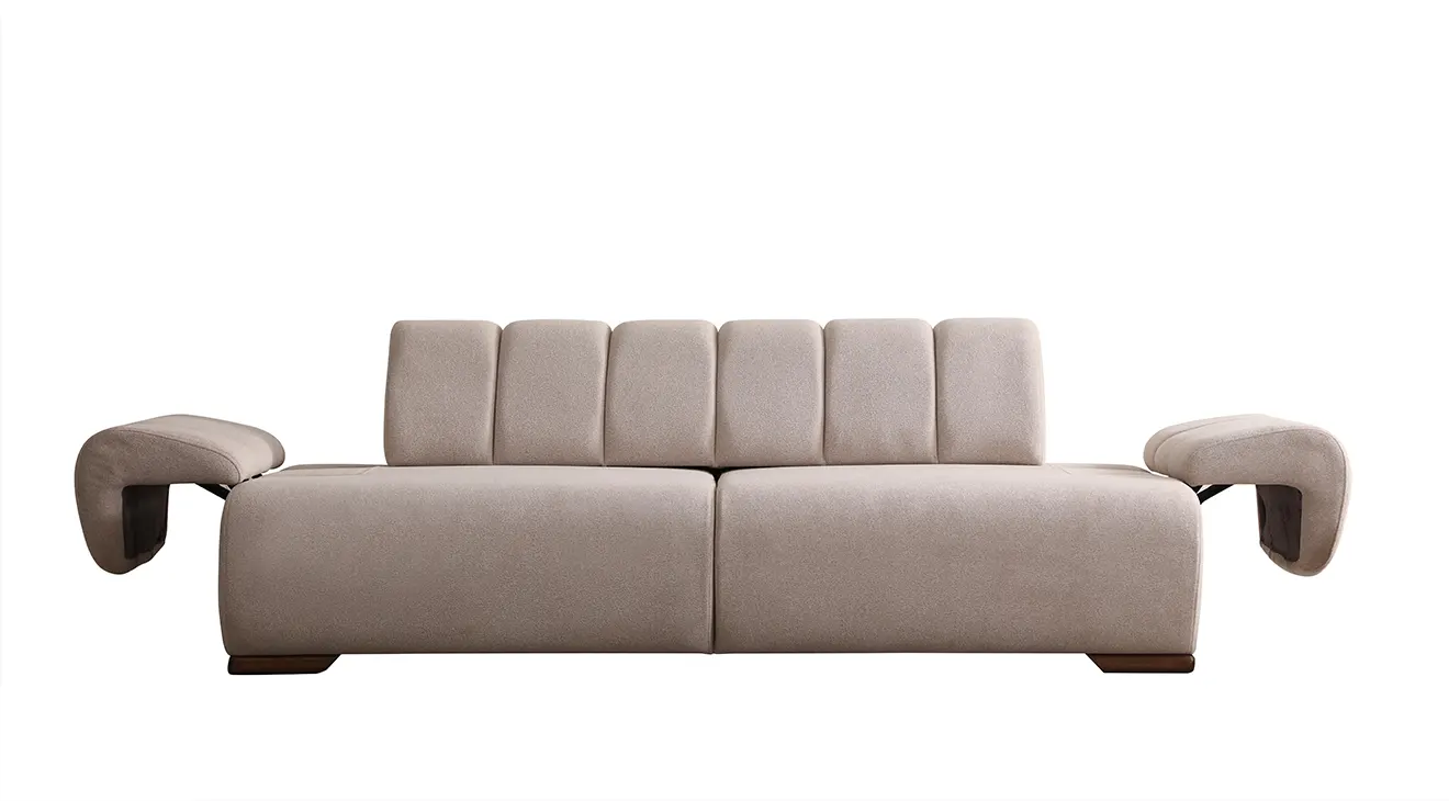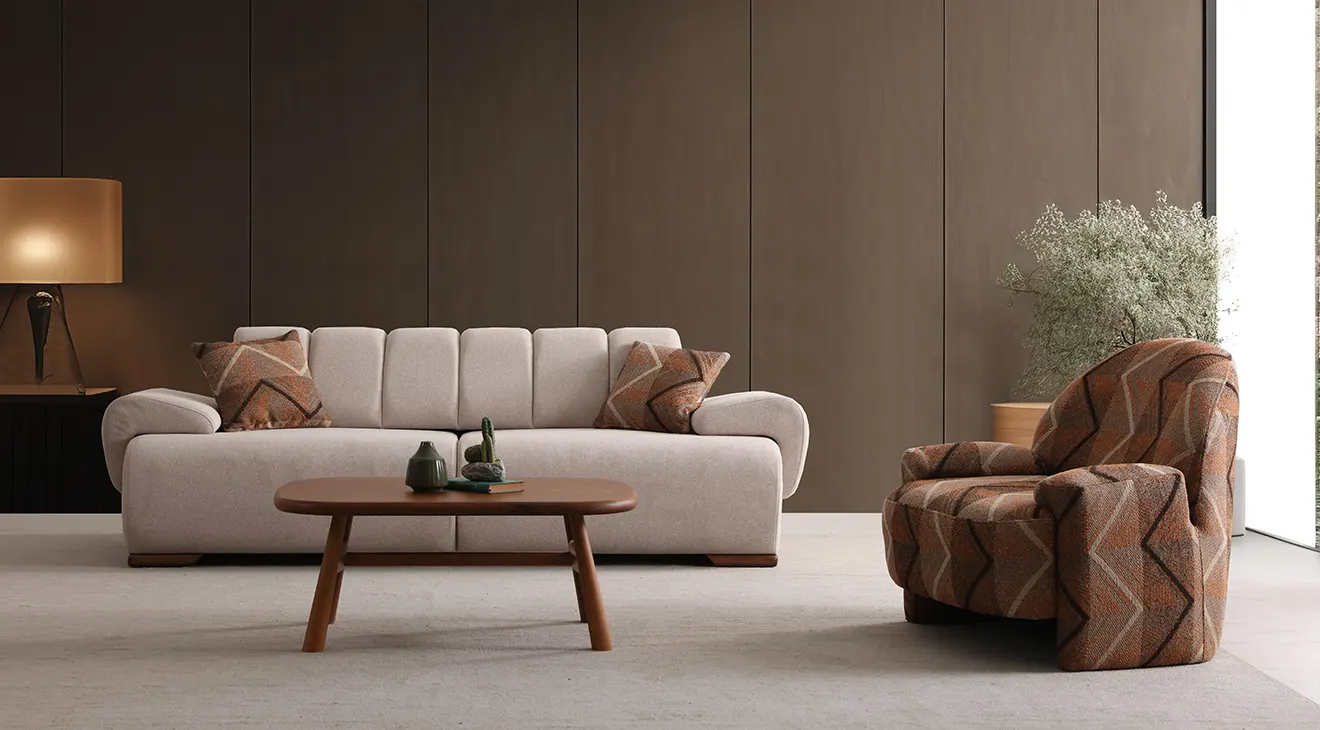 Truva Ahşap Ayaklı Yataklı Koltuk Takımı; yumuşak dokulu krem kumaşı, geniş oturumu ve kolay açılan yatak özelliğiyle şık konfor sunar.