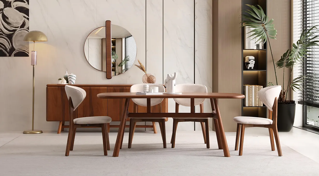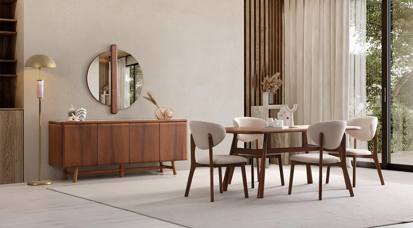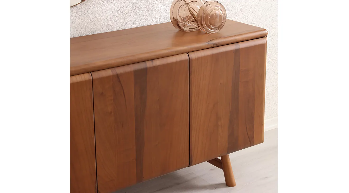 Truva Ahşap Ayaklı Yemek Odası Takımı, sıcak ceviz tonu ve yuvarlatılmış hatlarıyla mekâna doğal ama modern bir karakter kazandırır. Geniş yemek masası, yumuşak kıvrımlı formu sayesinde hem ferah bir kullanım alanı sunar hem de geçişlerde daha rahat hareket etmenizi sağlar. Ahşap iskeletli, krem döşemeli sandalyeler; sırtı kavrayan ergonomik yapısıyla uzun sofralarda konforu artırır. Takımın konsolu ise kapaklı geniş depolama alanıyla servis takımı, tekstil ve günlük eşyaları düzenli tutar; üst yüzeyi dekor ve sunum için şık bir tamamlayıcı olur. Ayna detayı, ceviz çerçeve dokunuşuyla alanı daha geniş ve aydınlık gösterirken; ahşap ayak yapısı yerden yüksek duruşuyla temizlik kolaylığı sağlar.