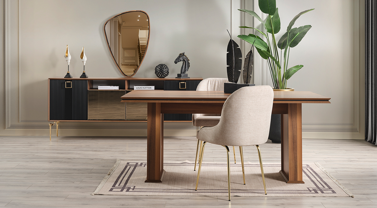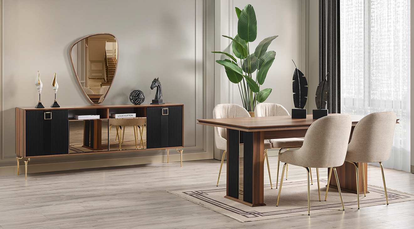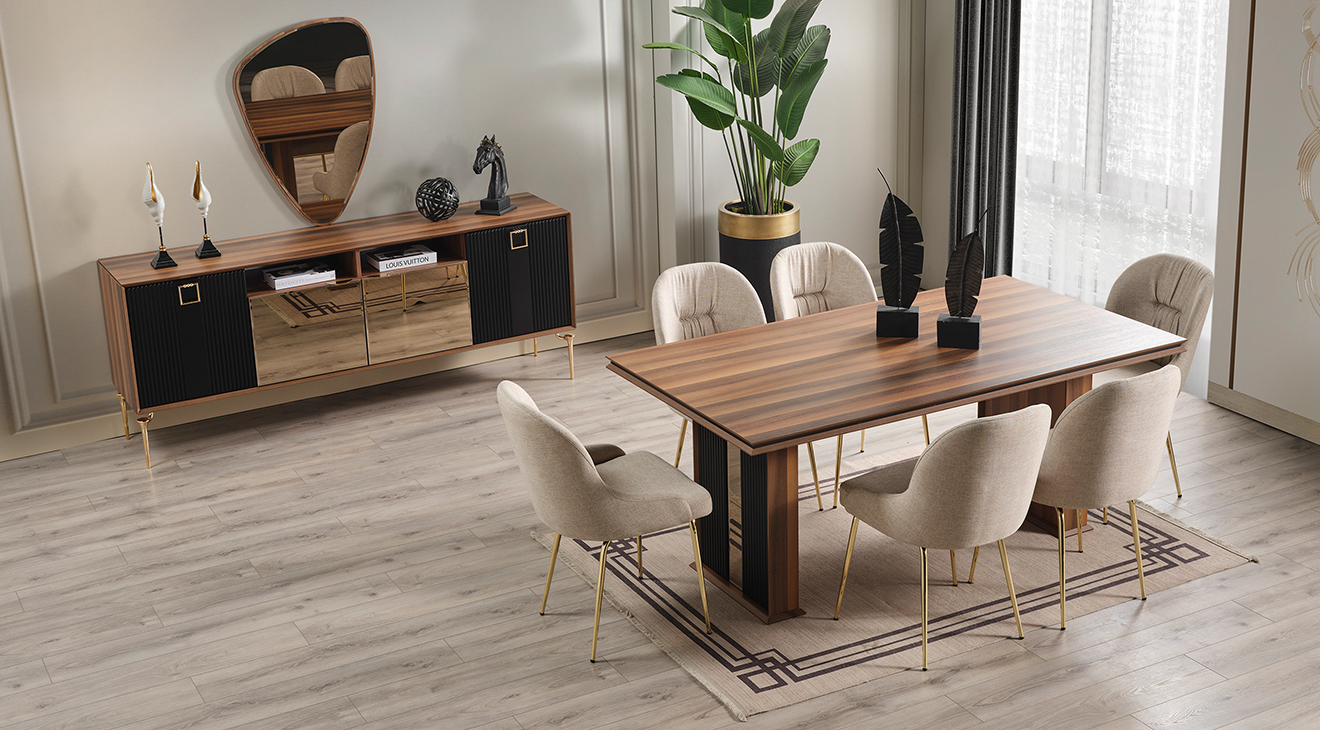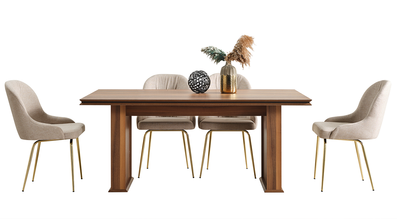 İnegöl mobilyasının el işçiliği ile üretilen Uludağ Ceviz Yemek Odası Takımı, modern ve şık tasarımıyla göz kamaştırıyor. Ceviz rengi ve gold metal ayakları ile hem şık hem de kullanışlı bir seçim. Uzun ömürlü yapısıyla yemek odanıza değer katın. Mobilyamevime'de sizleri bekliyor!