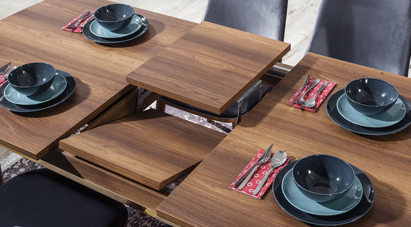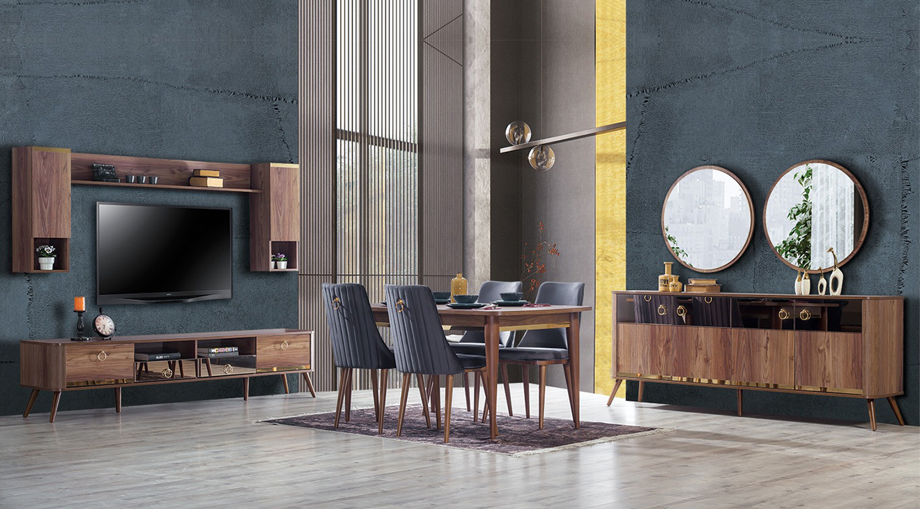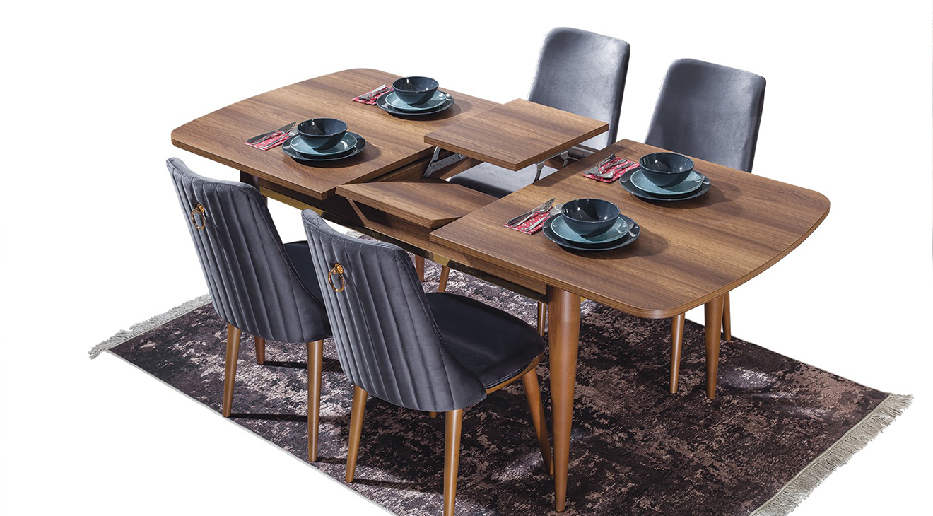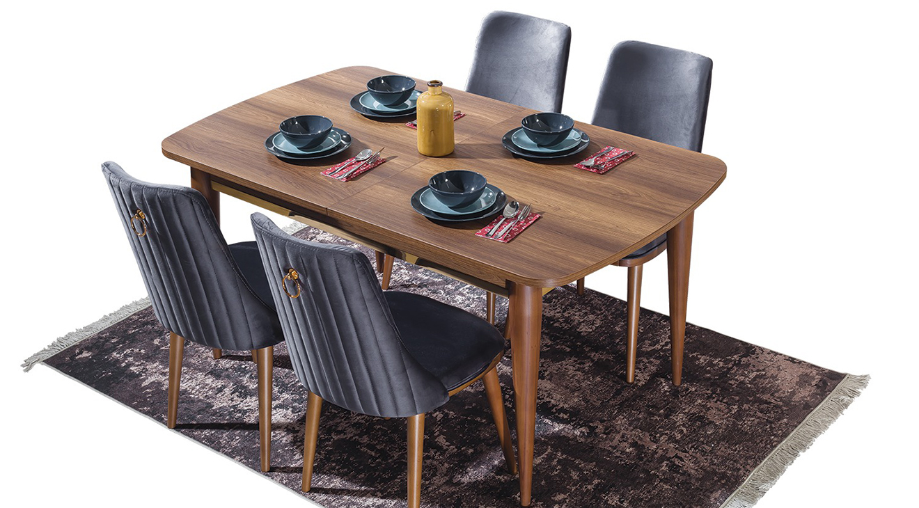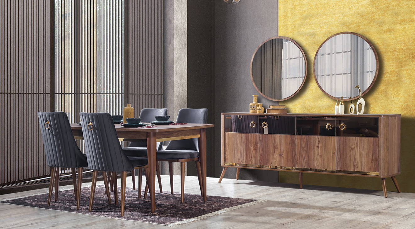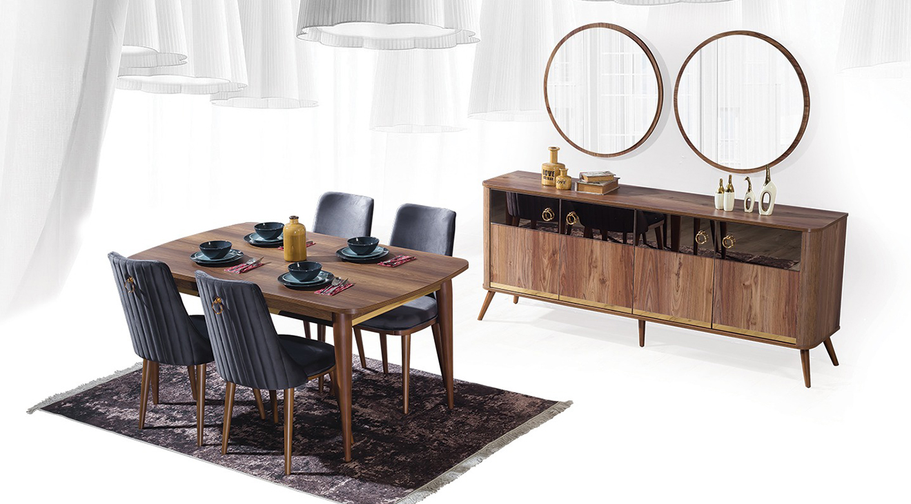 Valente Ceviz Yemek Odası Takımı, ceviz renginin sadeliği, ahşabın modern tasarımı ile birleşmesi ile tasarlanarak mobilyamevime.com da sizlere sunuyoruz.