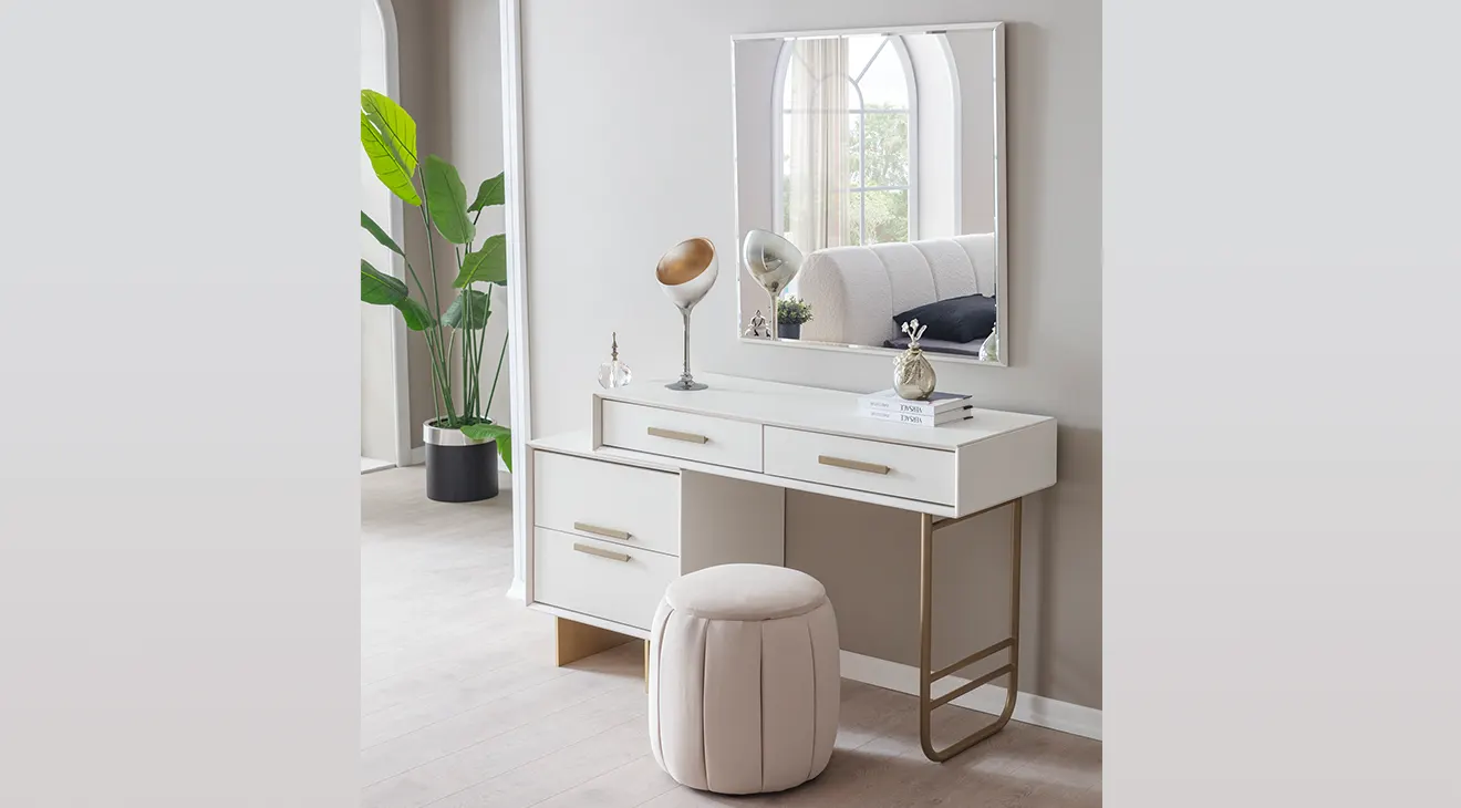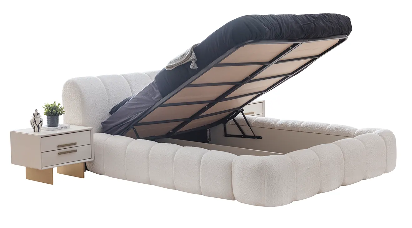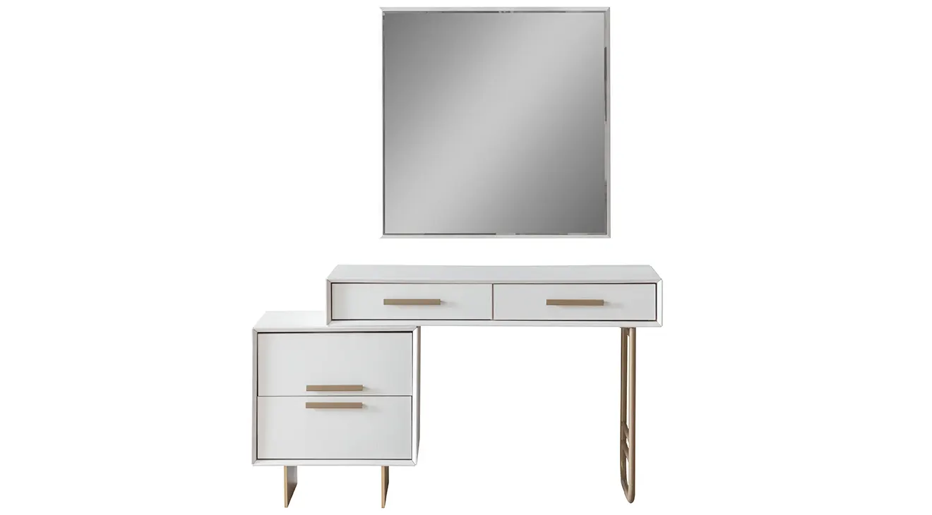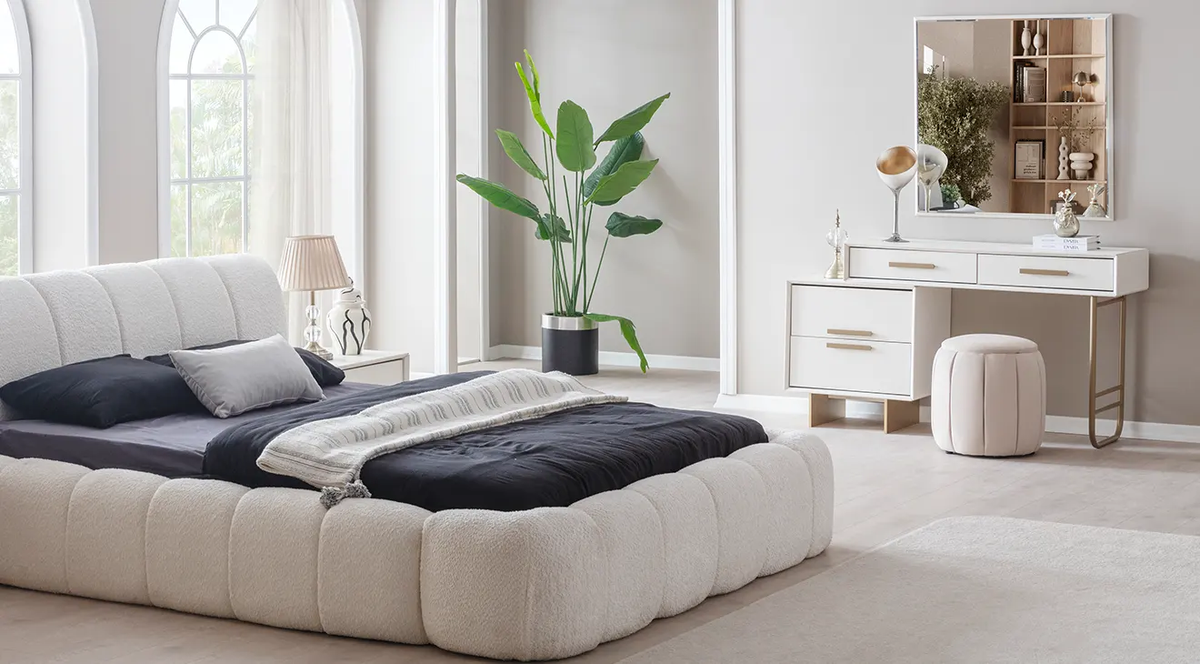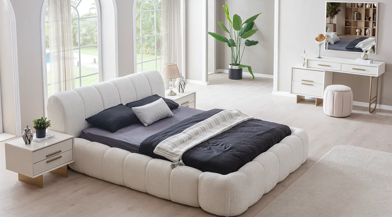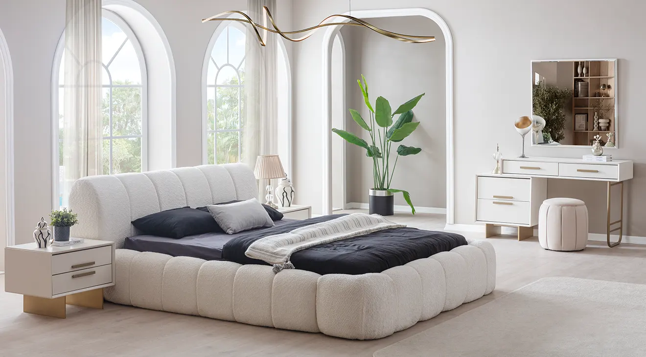 Valore Köşe Dolaplı Yatak Odası Takımı, geniş depolama alanı sunan köşe dolap yapısıyla hem şık hem de kullanışlı bir seçim. Konforlu bazalı yatak ekstra saklama alanı sağlarken, modern tasarımıyla yatak odanıza ferah bir hava katıyor. Altın detaylarla zenginleştirilmiş şifonyer ve komodinler, lüks bir dokunuş ekliyor.