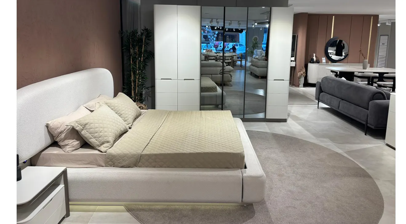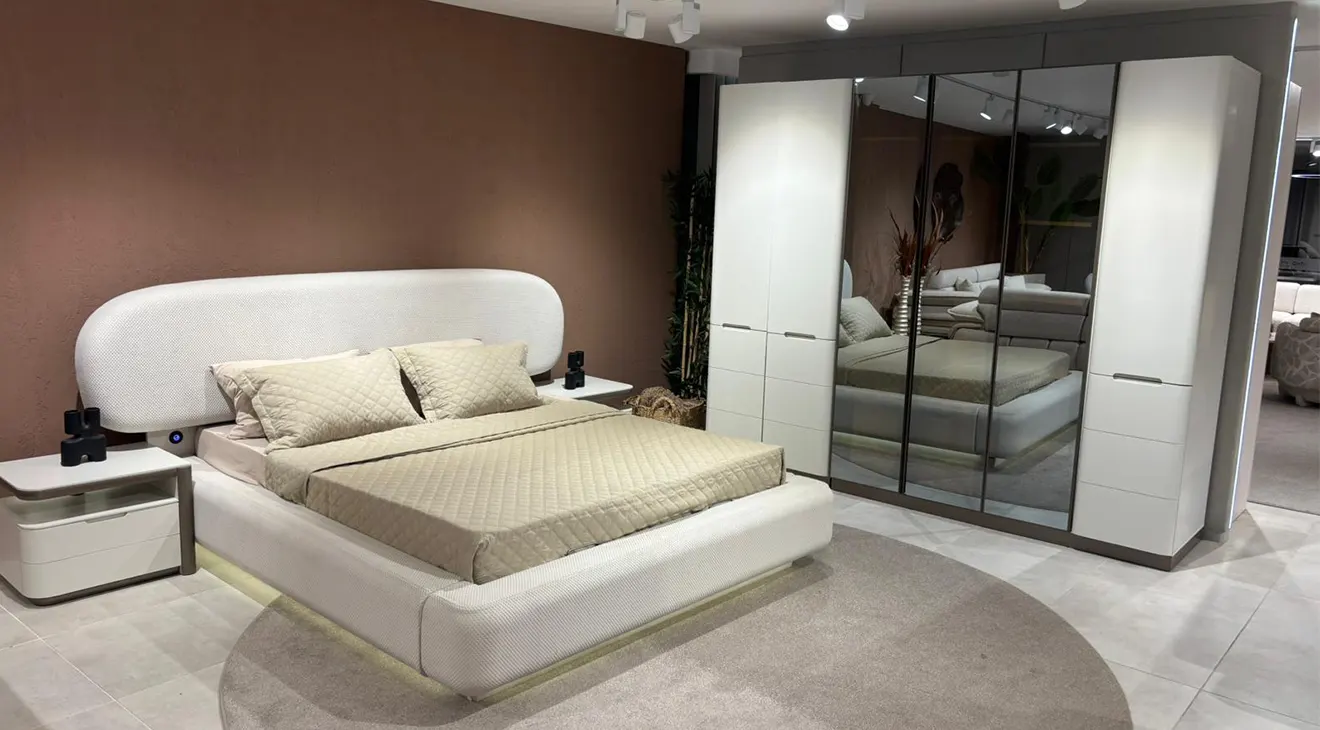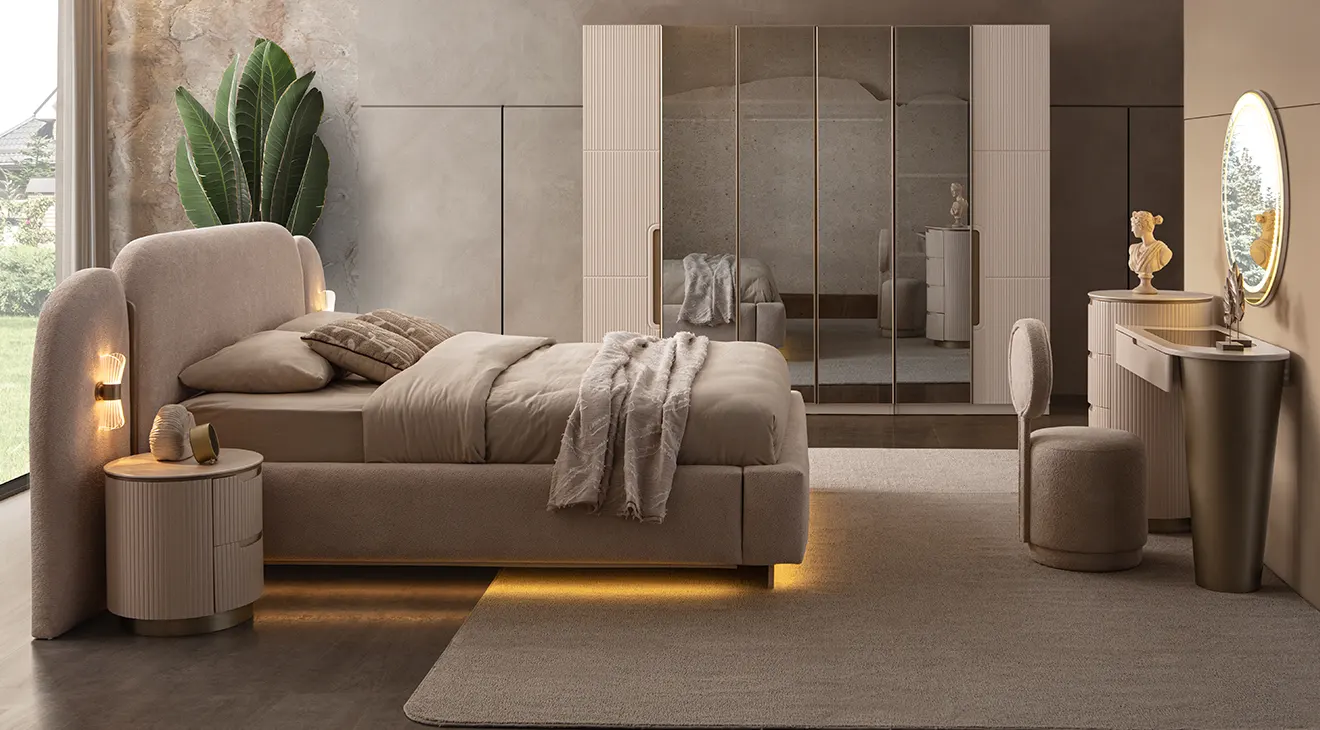 Vega 6 Kapaklı Modern Yatak Odası Takımı, yumuşak dokulu krem kumaş kaplı geniş başlığı, akıcı hatlı baza yapısı ve zemini aydınlatan alttan LED detayıyla yatak odanızda ferah ve çağdaş bir atmosfer kurar. Başlıkla uyumlu komodinler günlük eşyalar için düzenli alan sağlarken, uzun kulplara sahip 6 kapaklı gardırop; ortadaki füme ayna kapakları ve yan modüllerdeki kapak/çekmece kombinasyonuyla işlevselliği şıklıkla birleştirir. İç bölümde LED aydınlatmalı askı alanları, geniş raflar ve çekmeceler kıyafetlerinizi düzenli saklamayı kolaylaştırır. Modern çizgileri, zarif ayak yapısı ve yüksek kalite malzemeleriyle Vega, yatak odanıza hem sıcak hem de sofistike bir kimlik kazandırır. İnegöl mobilya kalitesiyle üretilen takım, dayanıklı yapısı ve zamansız tasarımıyla uzun yıllar ilk günkü görünümünü korur.