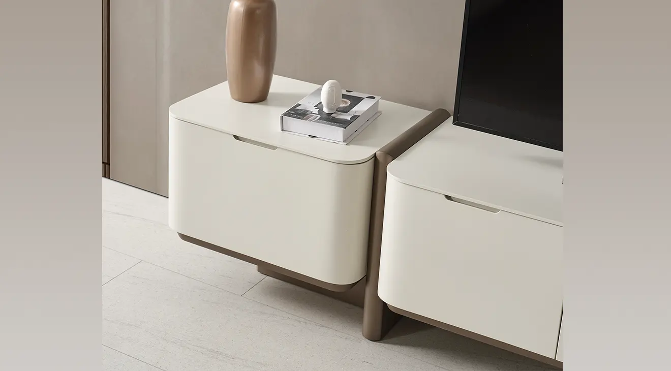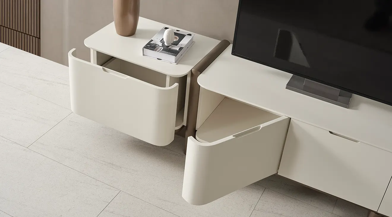 Vega Modern TV Ünitesi, krem tonlu gövdesi ve yumuşatılmış köşe hatlarıyla mekâna sakin ve modern bir şıklık katar; taupe ayak/kaide detayı tasarımı sıcak bir dengede tamamlar. Geniş üst tablası TV ve dekoratif objeler için ideal alan sunarken, kapaklı bölmeler kumanda, modem ve kabloları gözden uzak şekilde düzenler. Modüler yan parça ile daha esnek bir kullanım sağlar; yerden yüksek yapısı temizlikte (robot süpürge dâhil) pratiklik kazandırır ve TV köşenize ferah bir görünüm verir.