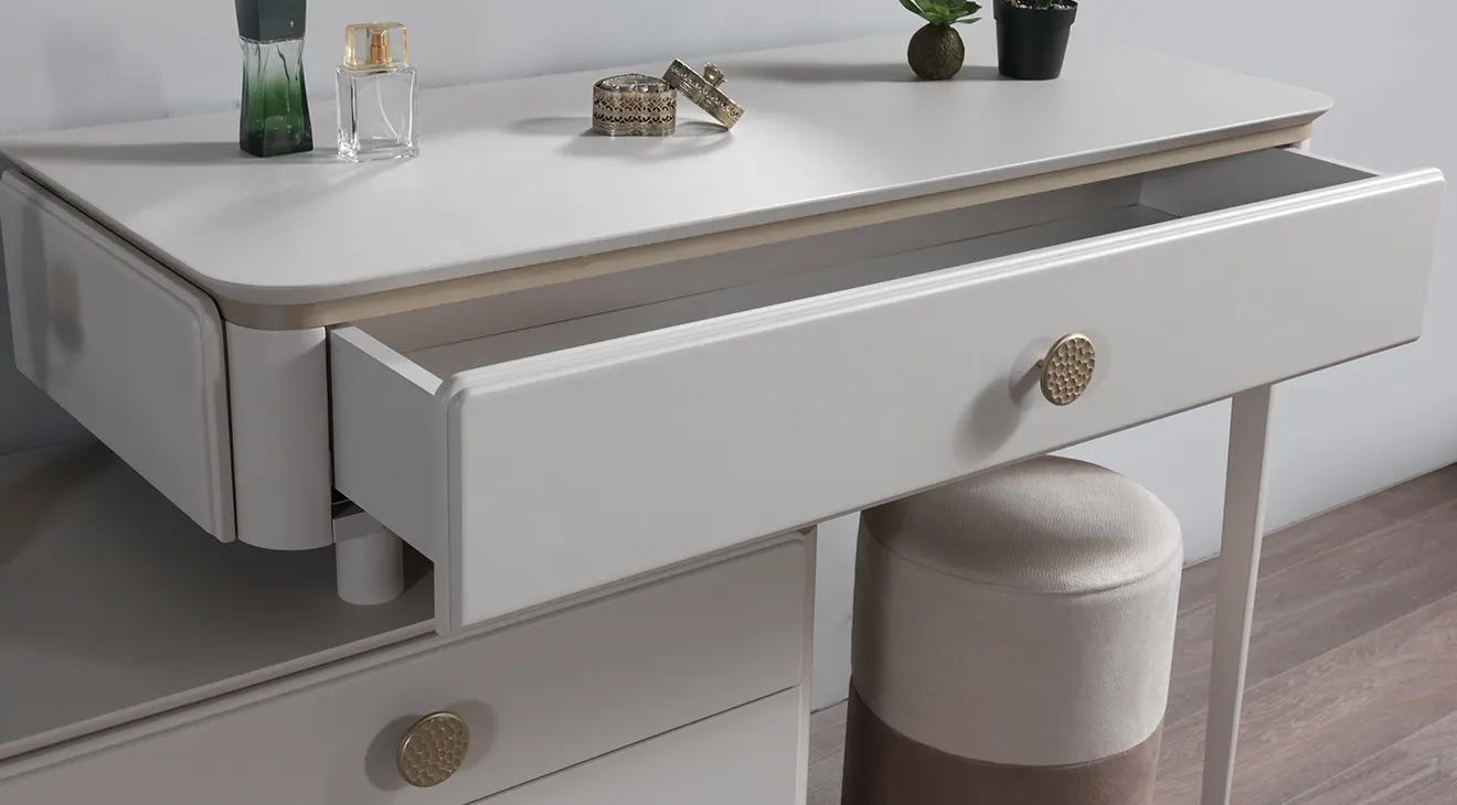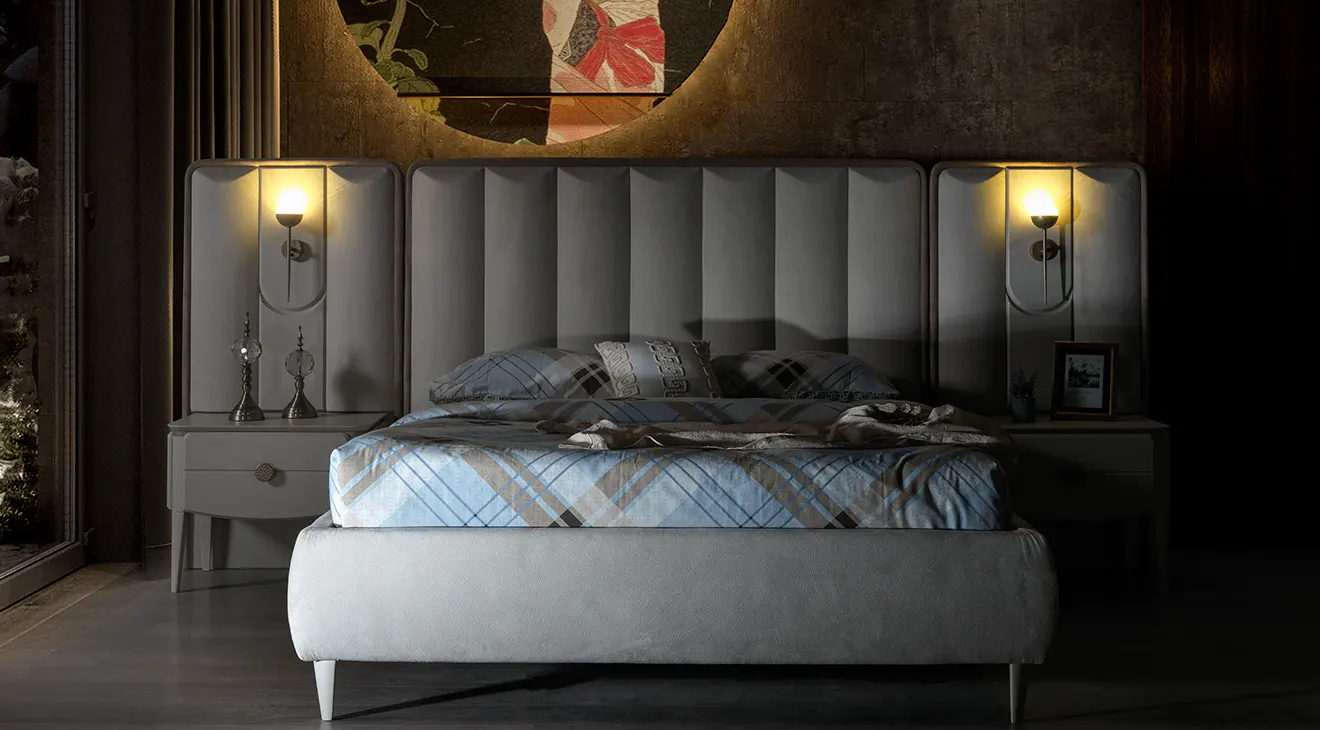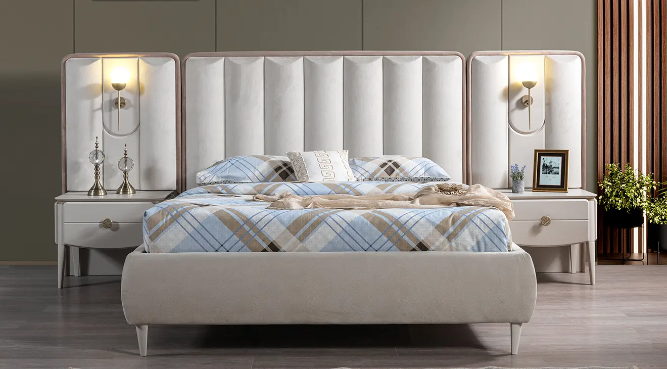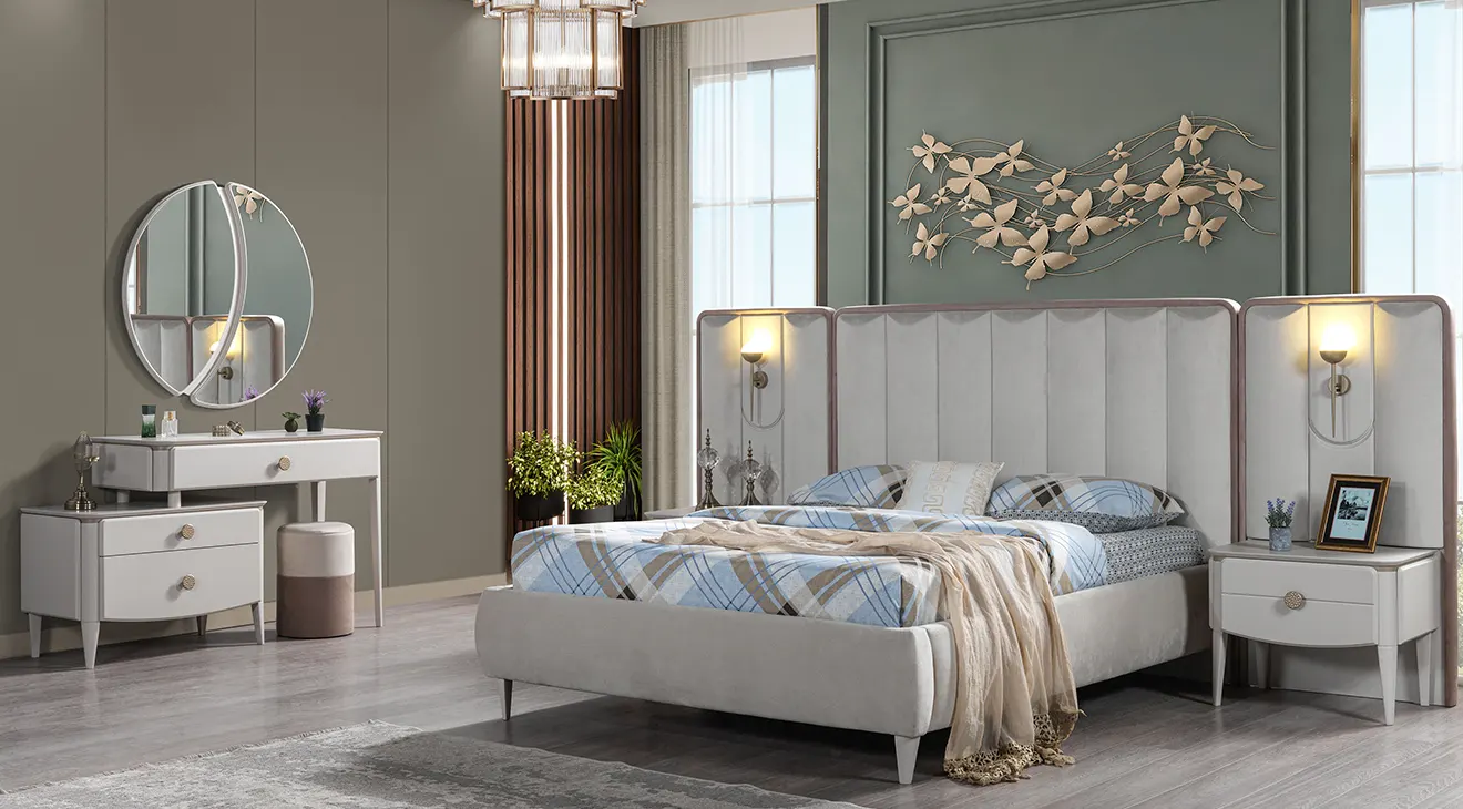 Vegas 6 Kapaklı Yatak Odası Takımı, aydınlatmalı cam kapaklı gardırobu ve zarif kulplarıyla yatak odanıza modern luks dokunuş sunar. Yumuşak kadife kumaşlı geniş başlığı, entegre aplikleri ve şık komodinleriyle konforu ve şıklığı bir araya getirir. Çekmeceli şifonyer ve yuvarlak makyaj masası da dâhil; bol depolama alanı sayesinde eşyalarınız her zaman düzenli.
