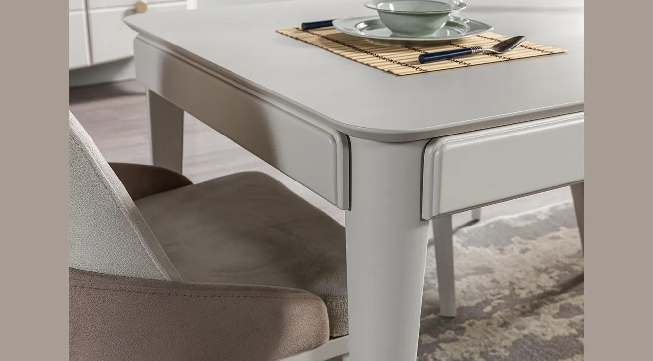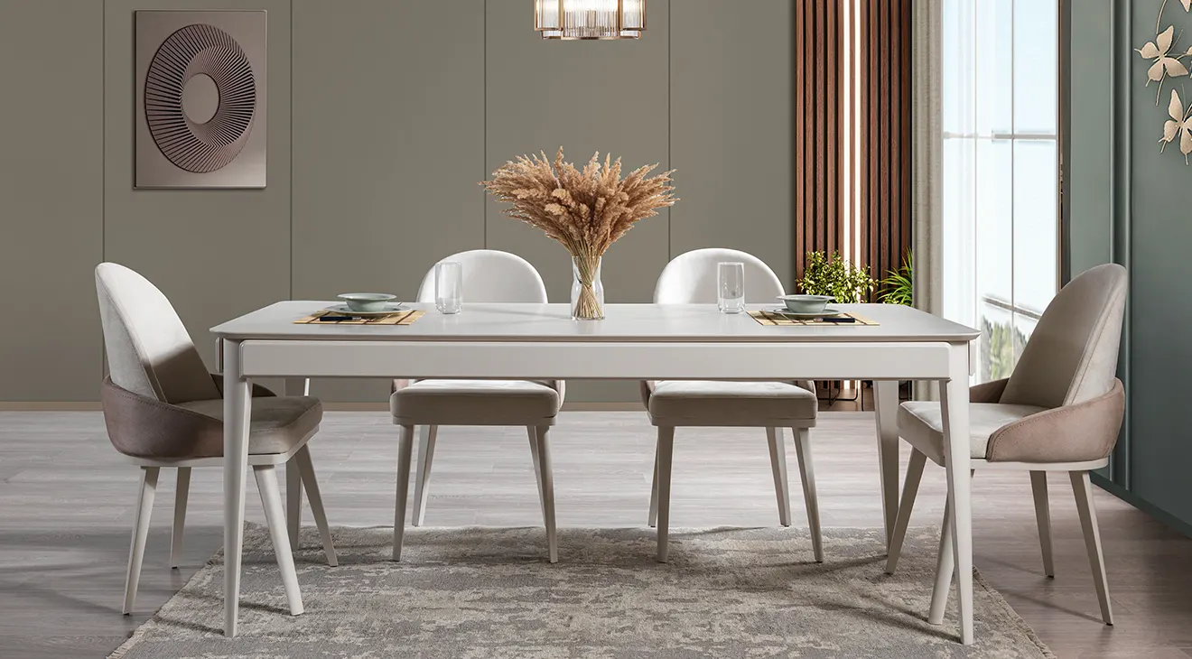 Vegas Ahşap Ayaklı Yemek Odası Takımı, zarif beyaz yüzeyi ve doğal meşe ayaklarıyla sofralarınıza sıcaklık katar. Geniş yemek masası ve konforlu kolları ahşap sandalyeler, her davetiye için şık ve davetkâr bir atmosfer sunar.