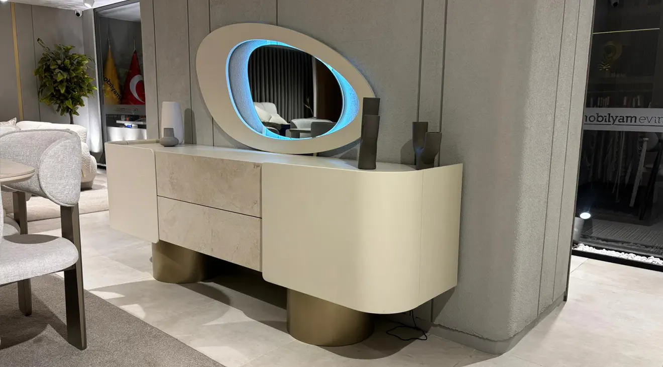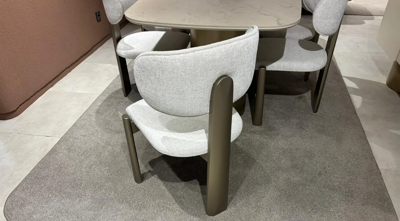 Velar Seramik Yemek Odası Takımı, zarif mermer görünümlü seramik masa tablası, yumuşak hatlı formu ve altın tonlu silindirik ayaklarıyla yemek alanınıza modern ve seçkin bir atmosfer kazandırır. Kavisli sırt yapısına sahip, konforlu döşemeli sandalyeler uzun sohbetli davetler için keyifli bir oturum sunarken, geniş depolama alanına sahip konsol ve onunla uyumlu dekoratif ayna, mekâna hem şıklık hem de fonksiyonellik katar. Dayanıklı seramik yüzey, leke ve çizilmelere karşı yüksek direnç göstererek günlük kullanımı kolaylaştırır; açık bej tonları ise farklı dekorasyon stilleriyle rahatça uyum sağlar. İnegöl mobilya kalitesiyle üretilen Velar, zamansız tasarımı ve kaliteli işçiliğiyle yemek odanızda yıllarca ilk günkü şıklığını korur.