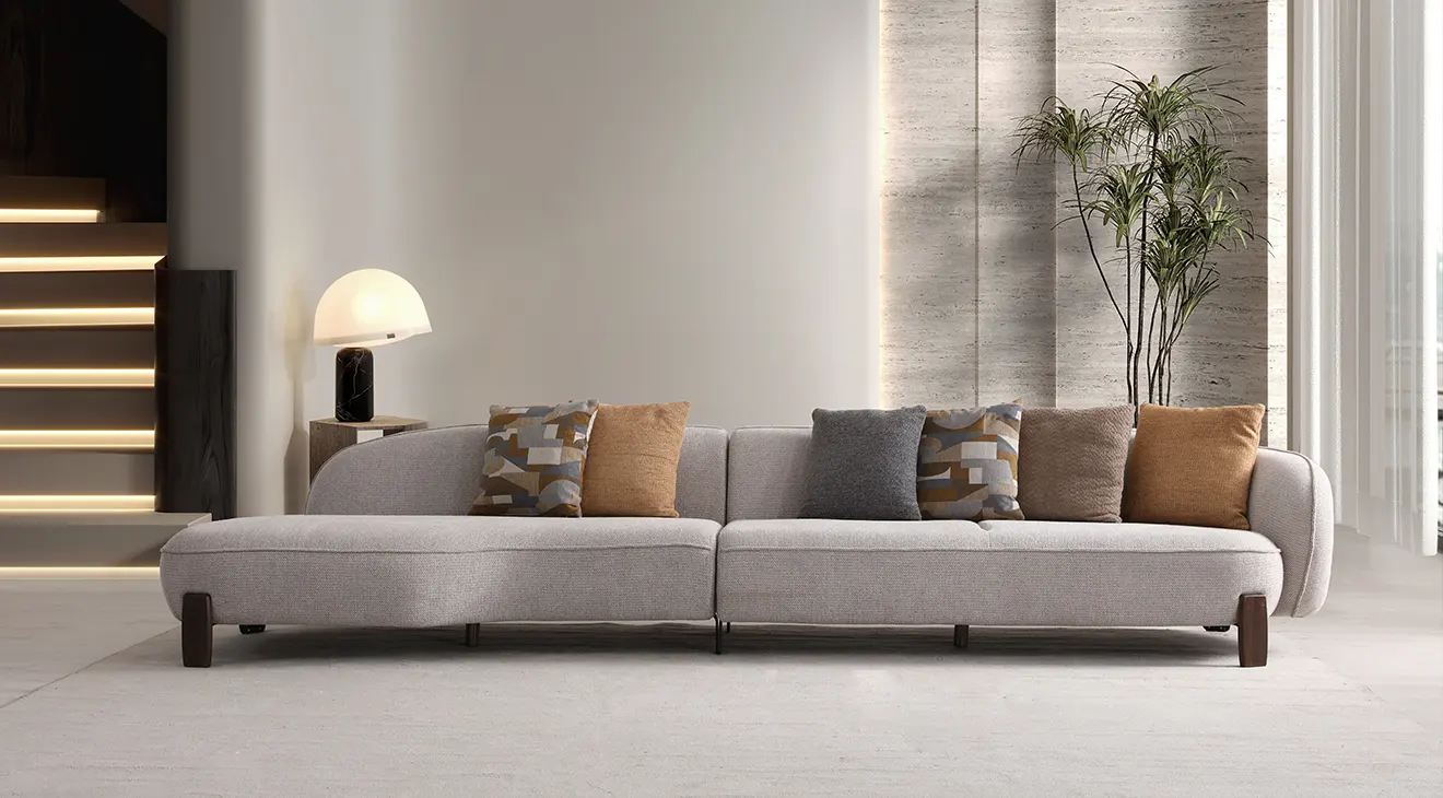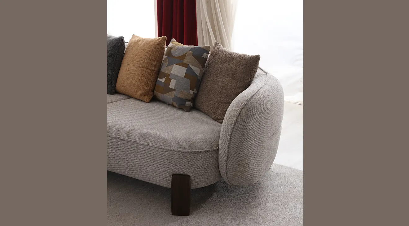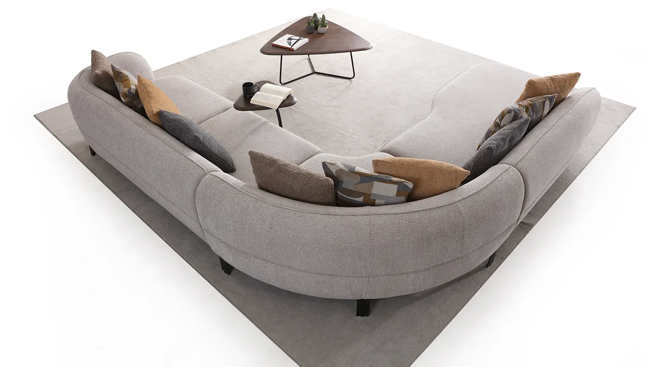 Venüs ahşap ayaklı modern köşe koltuk; yuvarlak hatları, geniş modülleri ve sıcak renk uyumuyla salona çağdaş bir hava katar.