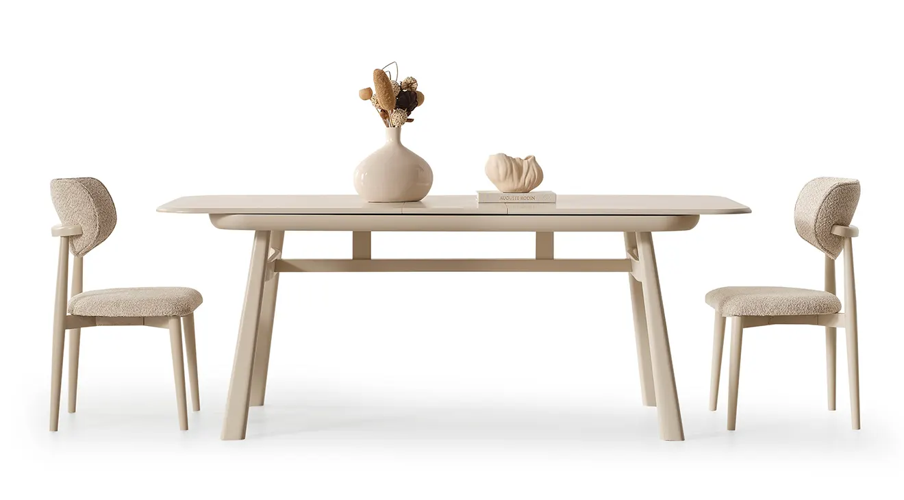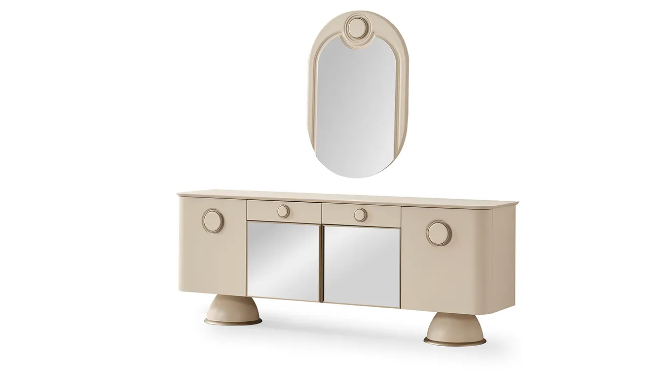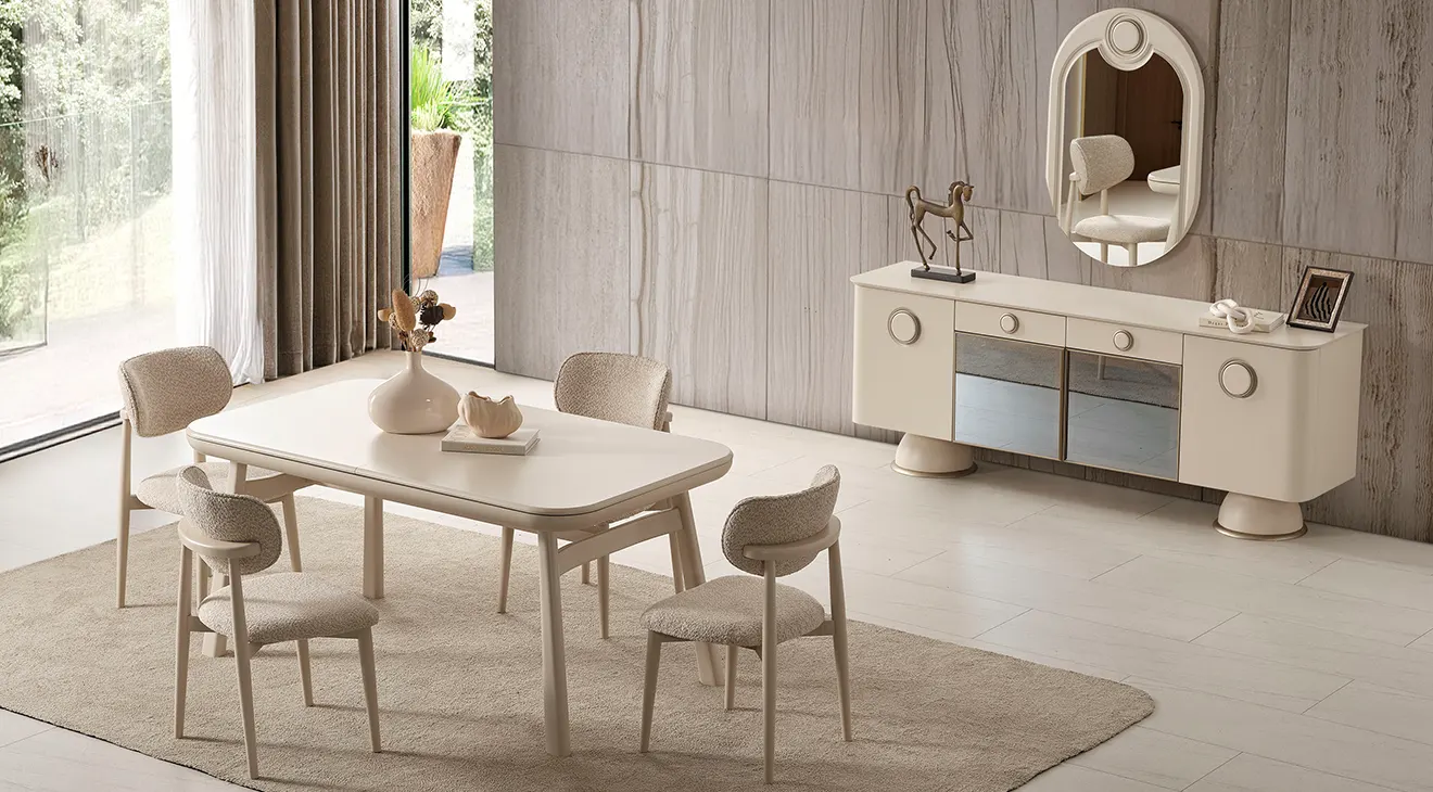 Vizyon Yemek Odası Takımı; açılır masa, buklet kumaş sandalyeler ve aynalı-çekmeceli konsoluyla krem tonlarında modern bir set. İnegöl üretimi, ölçü seçenekli.