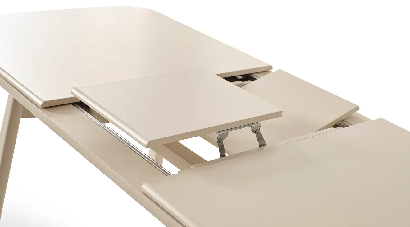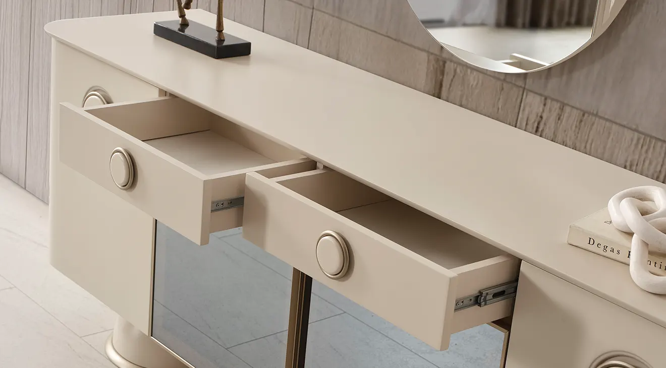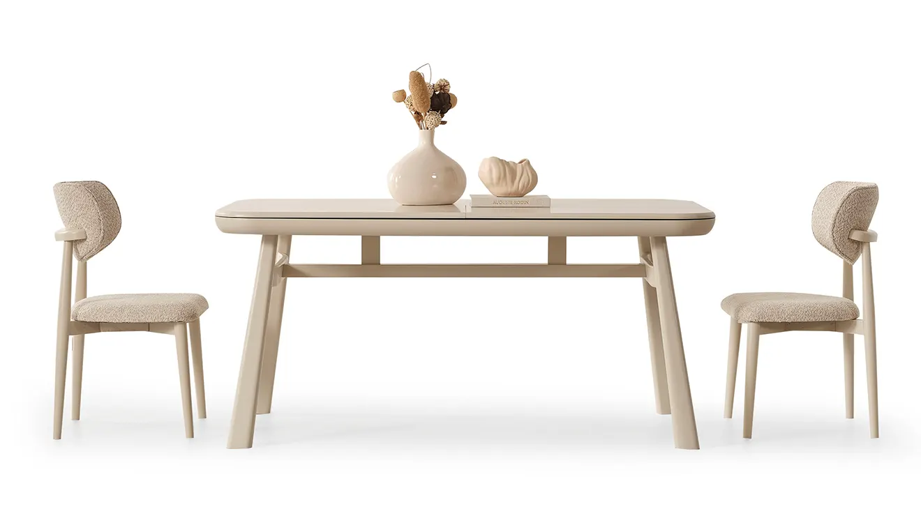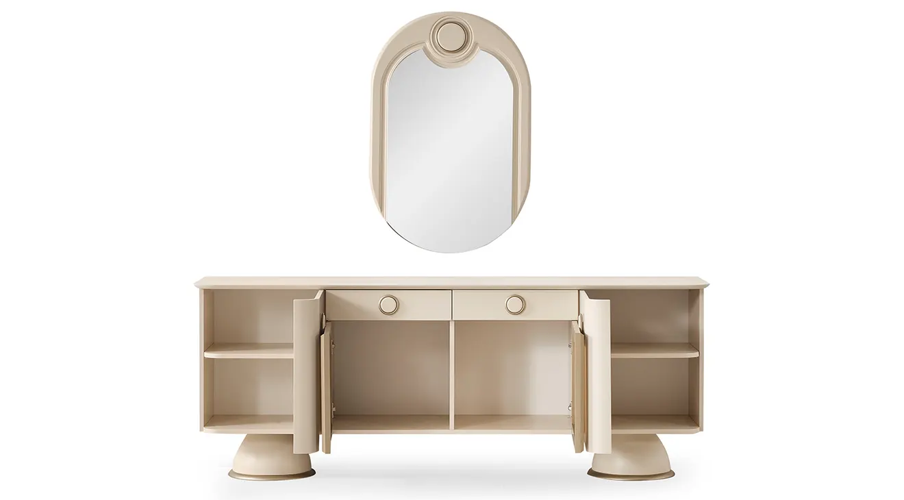 Vizyon Yemek Odası Takımı; açılır masa, buklet kumaş sandalyeler ve aynalı-çekmeceli konsoluyla krem tonlarında modern bir set. İnegöl üretimi, ölçü seçenekli.