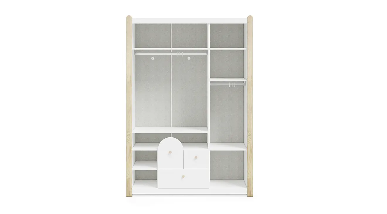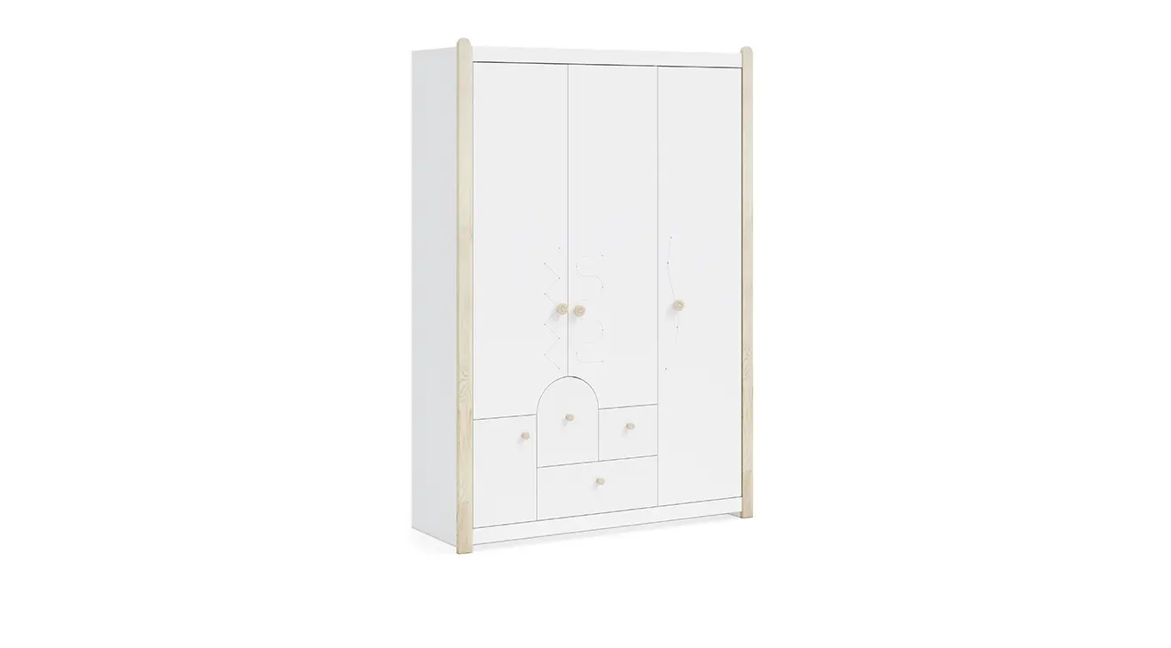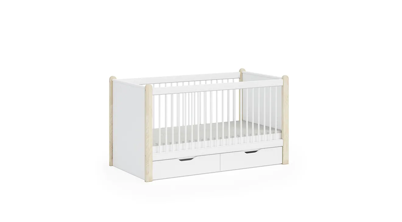 White Montessori Bebek Odası Takımı, saf beyaz lake yüzeyleriyle mekâna ferahlık katarken, doğal ahşap detaylarıyla sıcaklık sunar. Dönüşümlü karyola ve korumalı parmaklık seçenekleriyle büyüyen bebeğinizin ihtiyaçlarına uyum sağlar; altındaki geniş çekmece ise oyuncak ve bebek aksesuarlarını düzenli tutar. Sevimli hayvan figürlü kulpları ve sade tasarımıyla hem modern hem de samimi bir bebek odası yaratın.