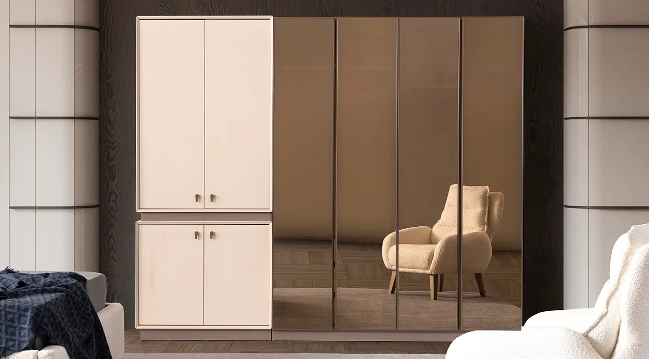 Yakut 6 Kapaklı Yatak Odası Takımı, modern tasarımı ve fonksiyonel detaylarıyla yatak odanıza sade bir şıklık kazandırır. Geniş depolama alanı, baza sistemi ve zarif ayna kapakları ile hem estetik hem kullanışlı.