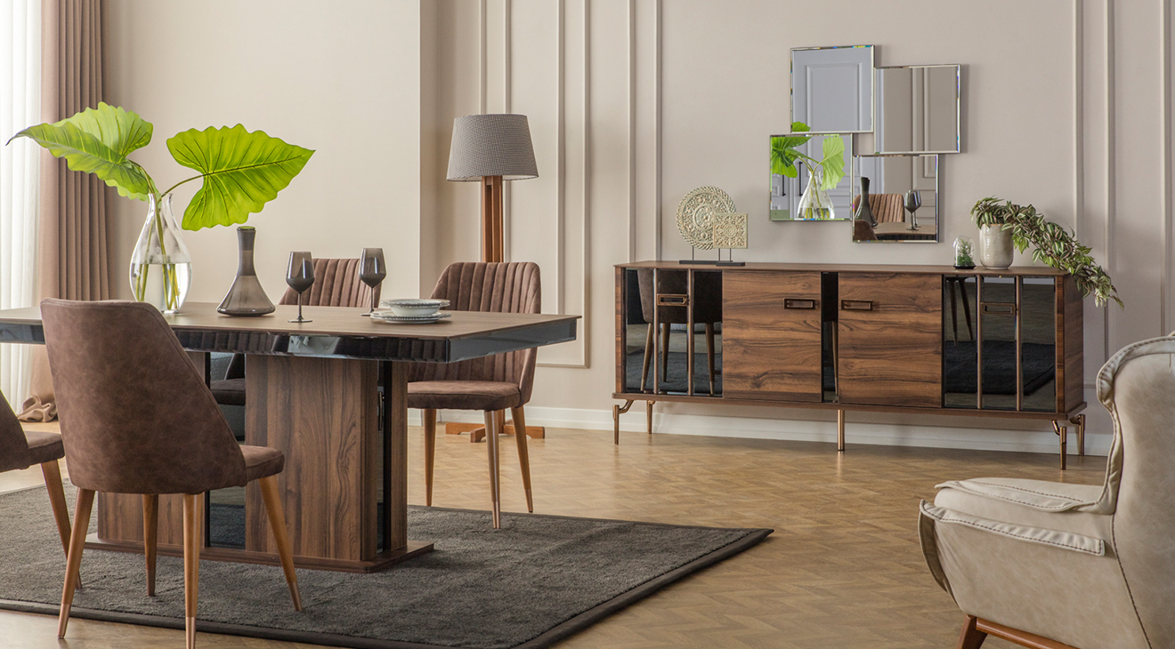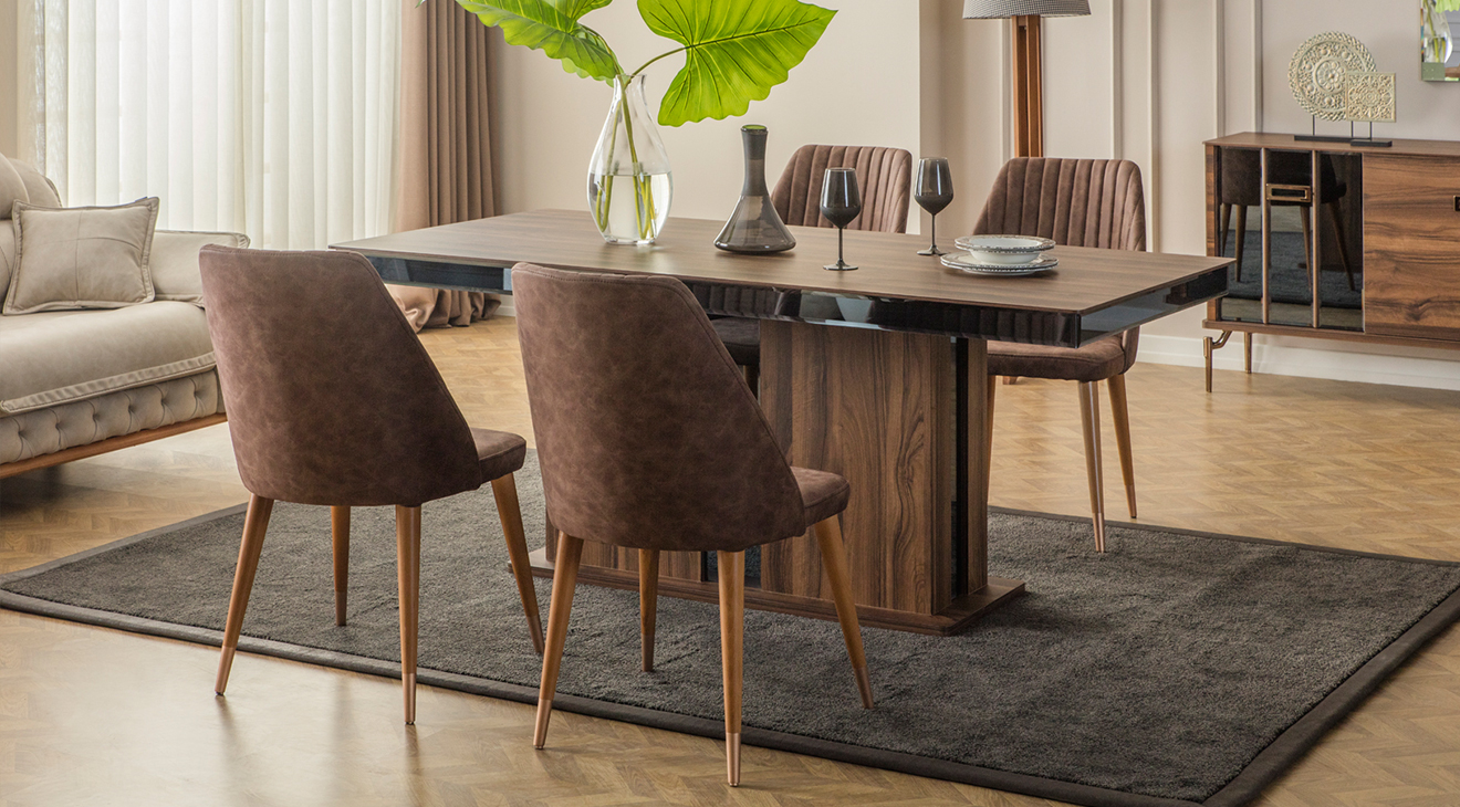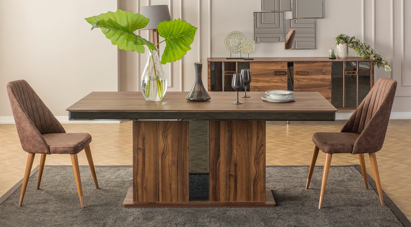 Ceviz rengi ile modern hava katılan, şık görünümü ve zarif duruşuyla dikkat çeken Zara Ceviz Yemek Odası Takımını sizlere sunuyoruz