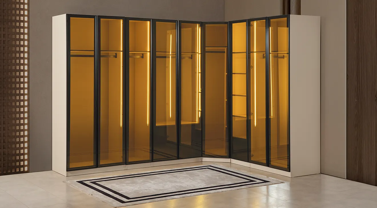 Modern tasarımı ve işlevselliğiyle dikkat çeken Zara Köşe Dolaplı Yatak Odası Takımı, geniş depolama alanı ve LED aydınlatmalı cam kapaklı dolabı ile konforlu bir kullanım sunar. Şık detaylarıyla yatak odanıza zarif bir dokunuş katın.