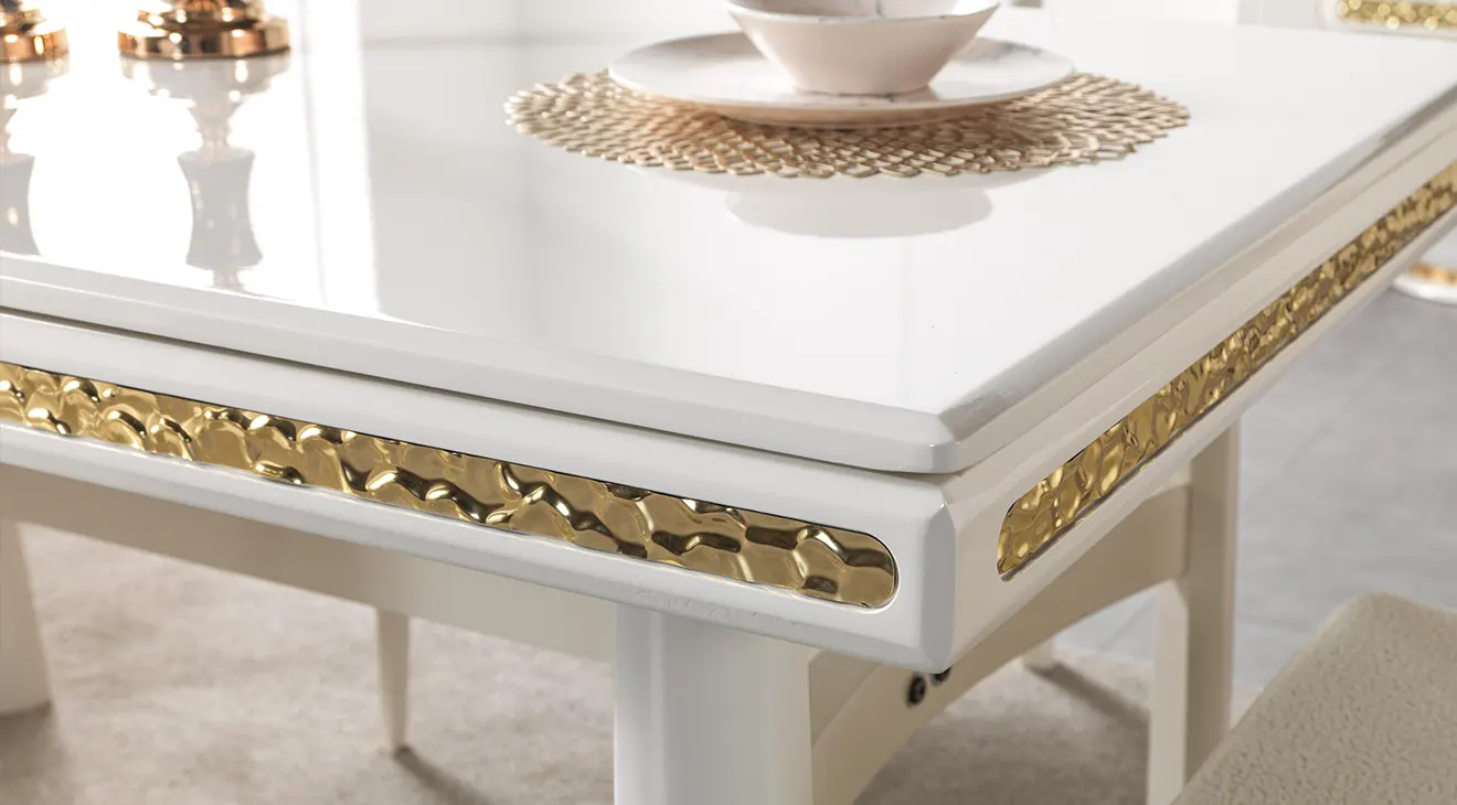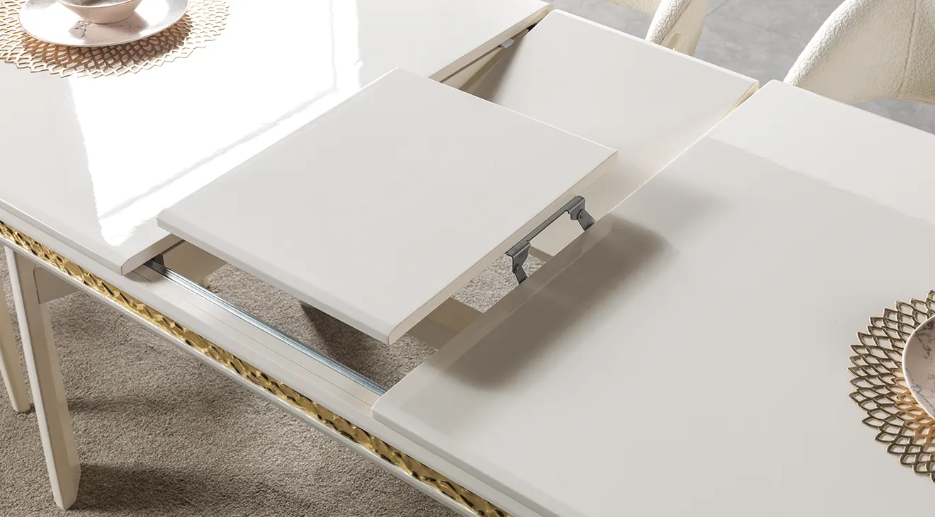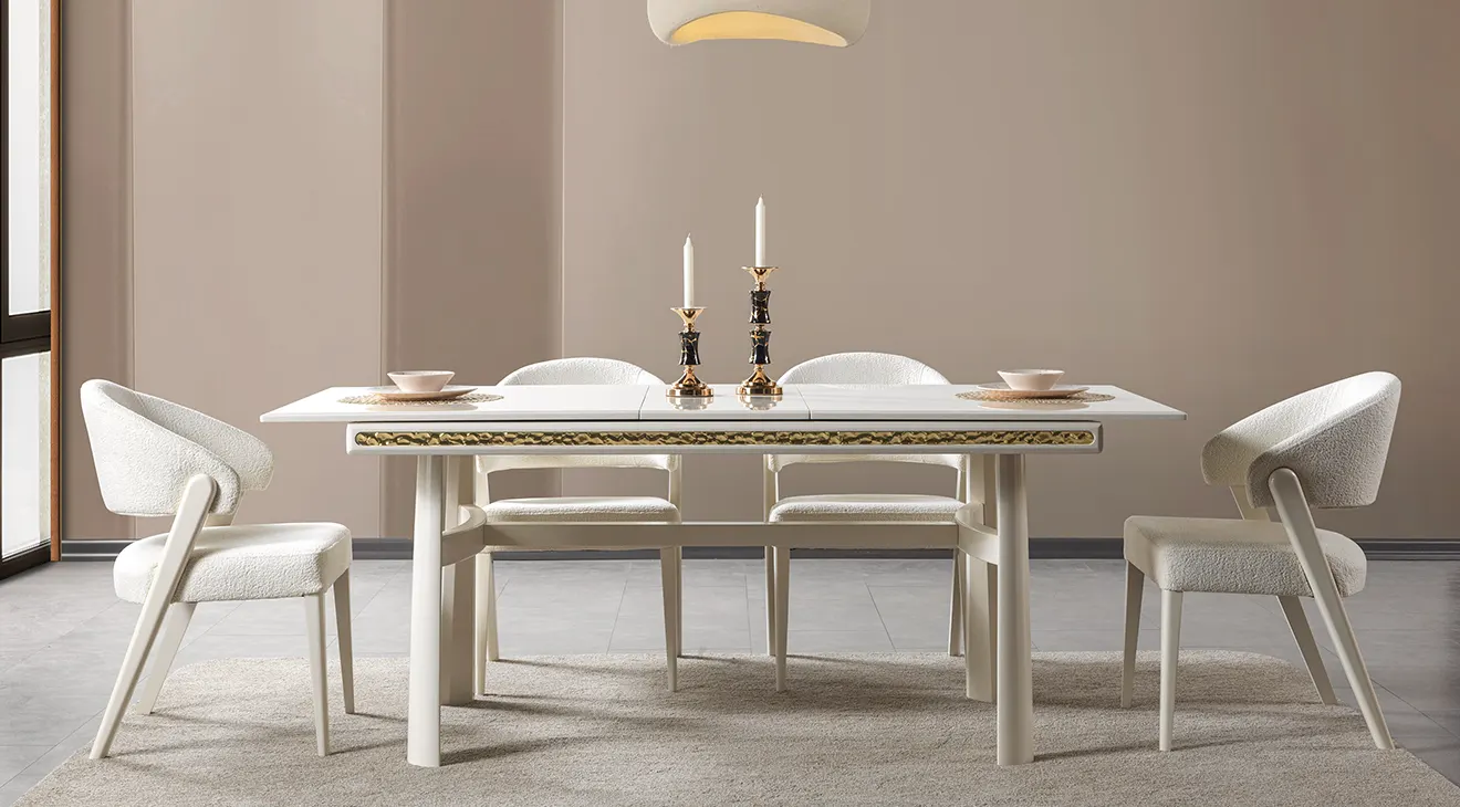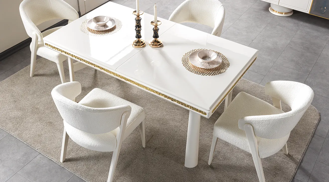 Zara Modern Yemek Odası Takımı, krem parlak yüzey ve altın dokunuşlarla güneşin ışıltısını sofranıza getiriyor. Rahat kavisli sandalyeleri ve zarif hatlara sahip konsolu ile her davete şıklık katın.
