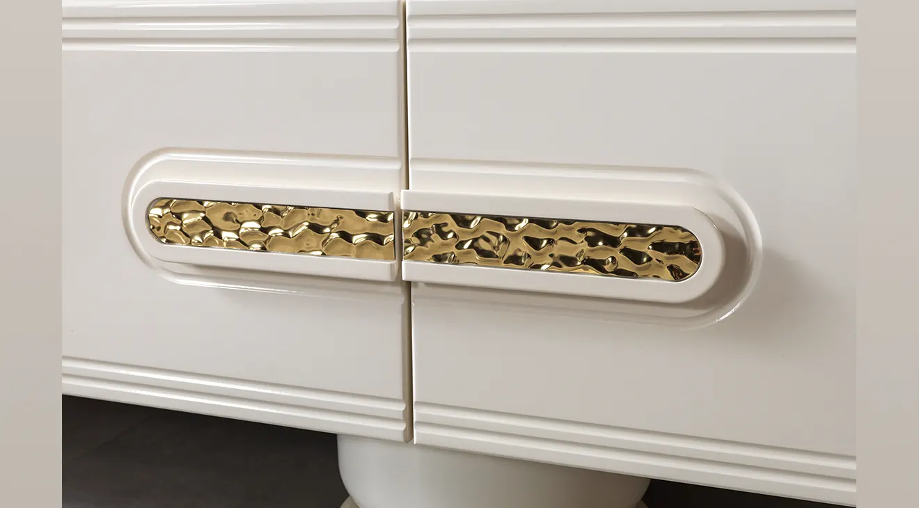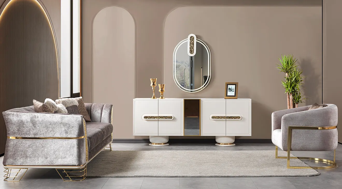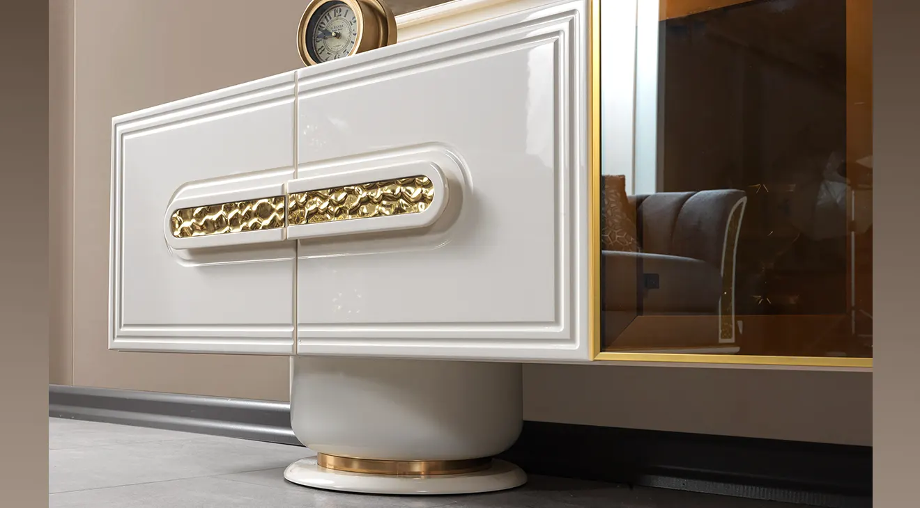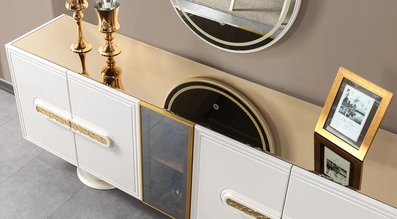 Zara Modern Yemek Odası Takımı, krem parlak yüzey ve altın dokunuşlarla güneşin ışıltısını sofranıza getiriyor. Rahat kavisli sandalyeleri ve zarif hatlara sahip konsolu ile her davete şıklık katın.