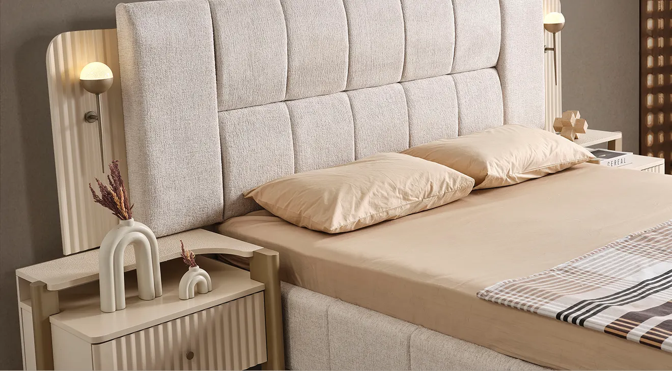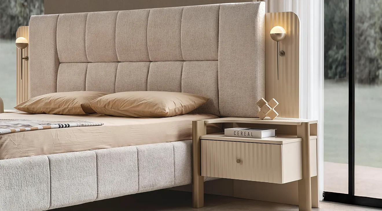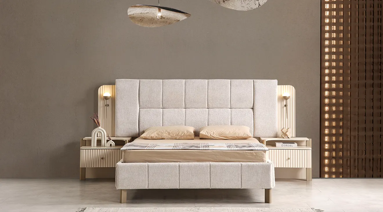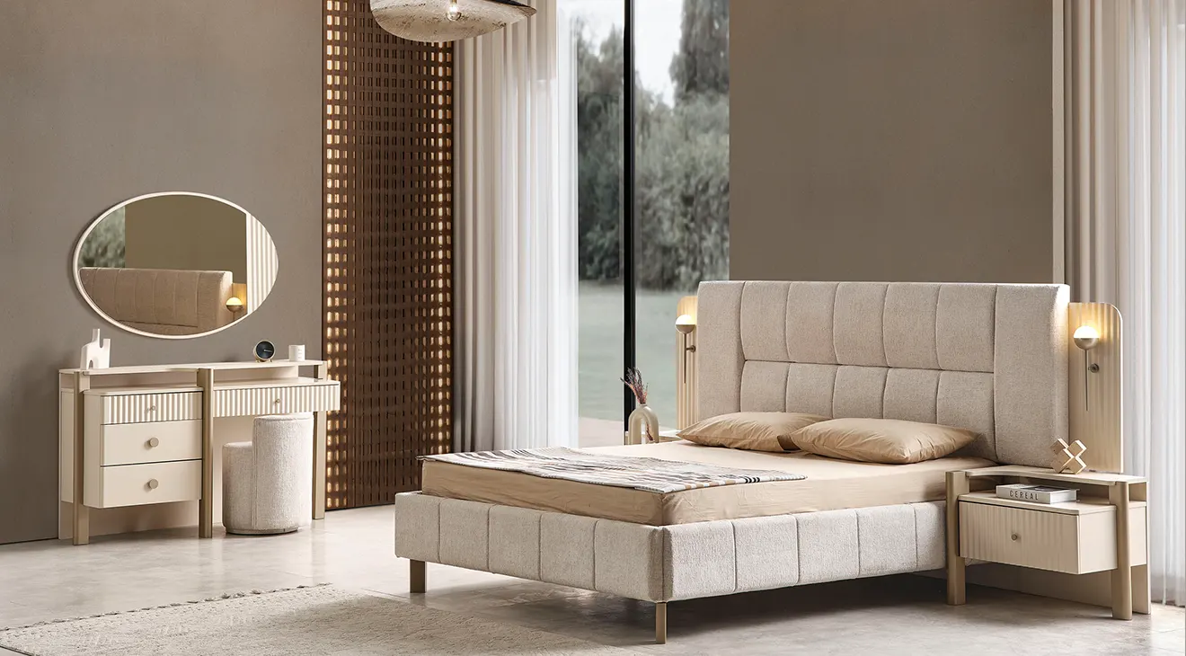 Krem tonlarının sıcaklığı, kapitone başlık ve yalın çizgilerle birleşiyor. 6 kapaklı, aynalı ve çok raflı gardırop; gömlekten nevresime her şeyi düzenli tutar. Komodin ve şifonyer yuvarlak hatlarıyla takımı tamamlar. Modern, sakin ve fonksiyonel bir yatak odası isteyenler için Zirve tam isabet.